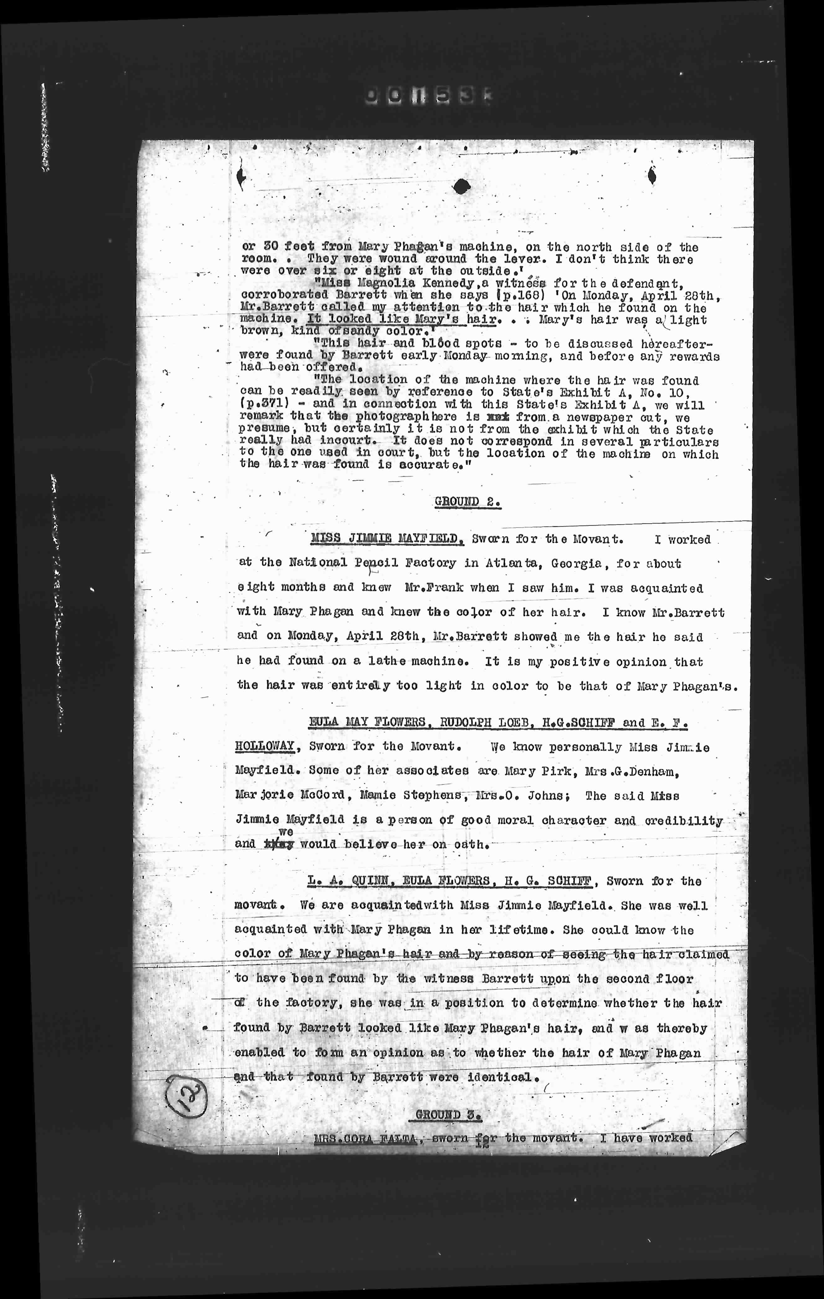 MISS JIMMIE MAYFIELD, Sworn for the Movant. I worked at the National Pencil Factory in Atlanta, Georgia, for about eight months and knew Mr.Frank when I saw him. I was acquainted with Mary Phagan and knew the color of her hair. I know Mr.Barrett and on Monday, April 28th, Mr.Barrett showed me the hair he said he had found on a lathe machine. It is my positive opinion that the hair was entirely too light in color to be that of Mary Phagan's.