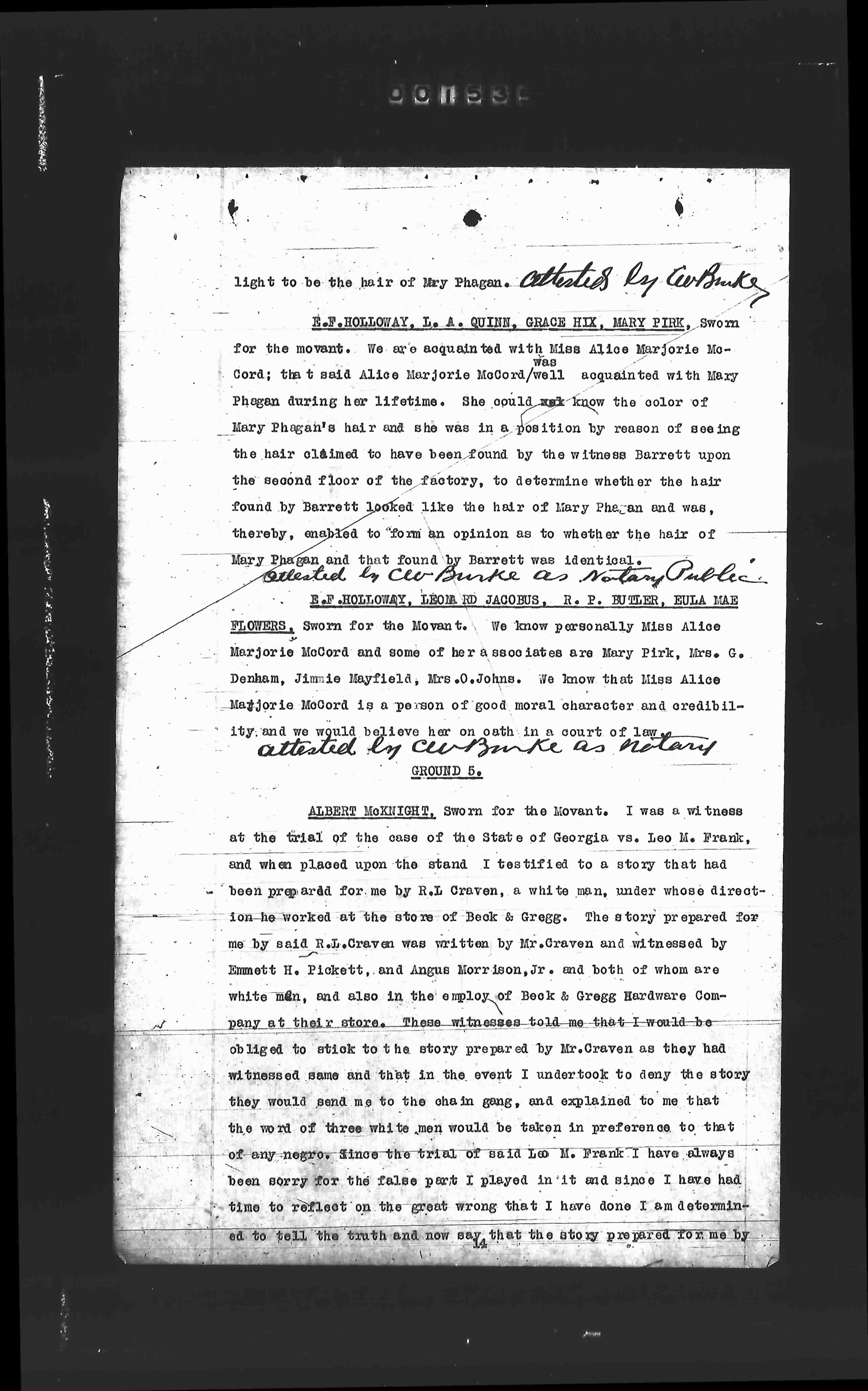 E.F.HOLLOWAY, L.A.QUINN, GRACE HIX, MARY PIRK, Sworn for the movant. We are acquainted with Miss Alice Marjorie MoCord; that said Alice Marjorie MoCord was well acquainted with Mary Phagan during her lifetime. She could well know the color of Mary Phagan's hair and she was in a position by reason of seeing the hair claimed to have been found by the witness Barrett upon the second floor of the factory, to determine whether the hair found by Barrett looked like the hair of Mary Phagan and was, thereby, enabled to form an opinion as to whether the hair of Mary Phagan and that found by Barrett was identical. Attested by Geo. Burke as Notary Public.