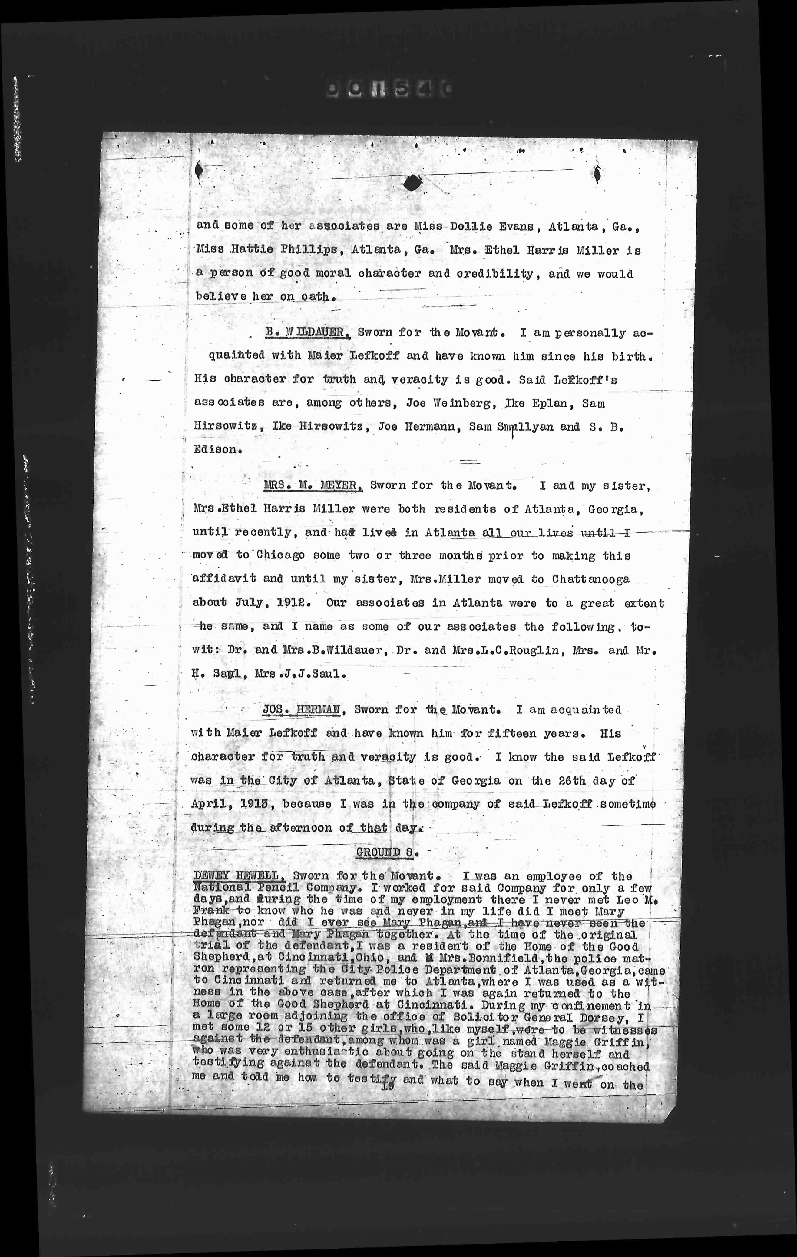 DEWEY HEWELL, Sworn for the Movant. I was an employee of the National Pencil Company. I worked for said Company for only a few days and during the time of my employment there I never met Leo M. Frank, nor knew who he was and never in my life did I meet Mary Phagan, nor did I ever see Mary Phagan. I have never seen the defendant - and Mary Phagan together at the time of the original trial of the defendant, I was a resident of the Home of the Good Shepherd, 646 Clinton Avenue, Cincinnati, Ohio, and Mrs. Bonifield, the police matron representing the Police Department of Atlanta, Georgia, came to Cincinnati and returned me to Atlanta where I was used as a witness in the above case, after which I was returned to the Home of the Good Shepherd at Cincinnati. During my confinement in a large room adjoining the office of Solicitor General Dorsey, I met some 12 or 15 other girls who, like myself, were to be witnesses against the defendant among whom was a girl named Maggie Griffin, who was very enthusiastic about going on the stand herself and testifying against the defendant. The said Maggie Griffin coached me and told me how to testify and what to say when I went on the