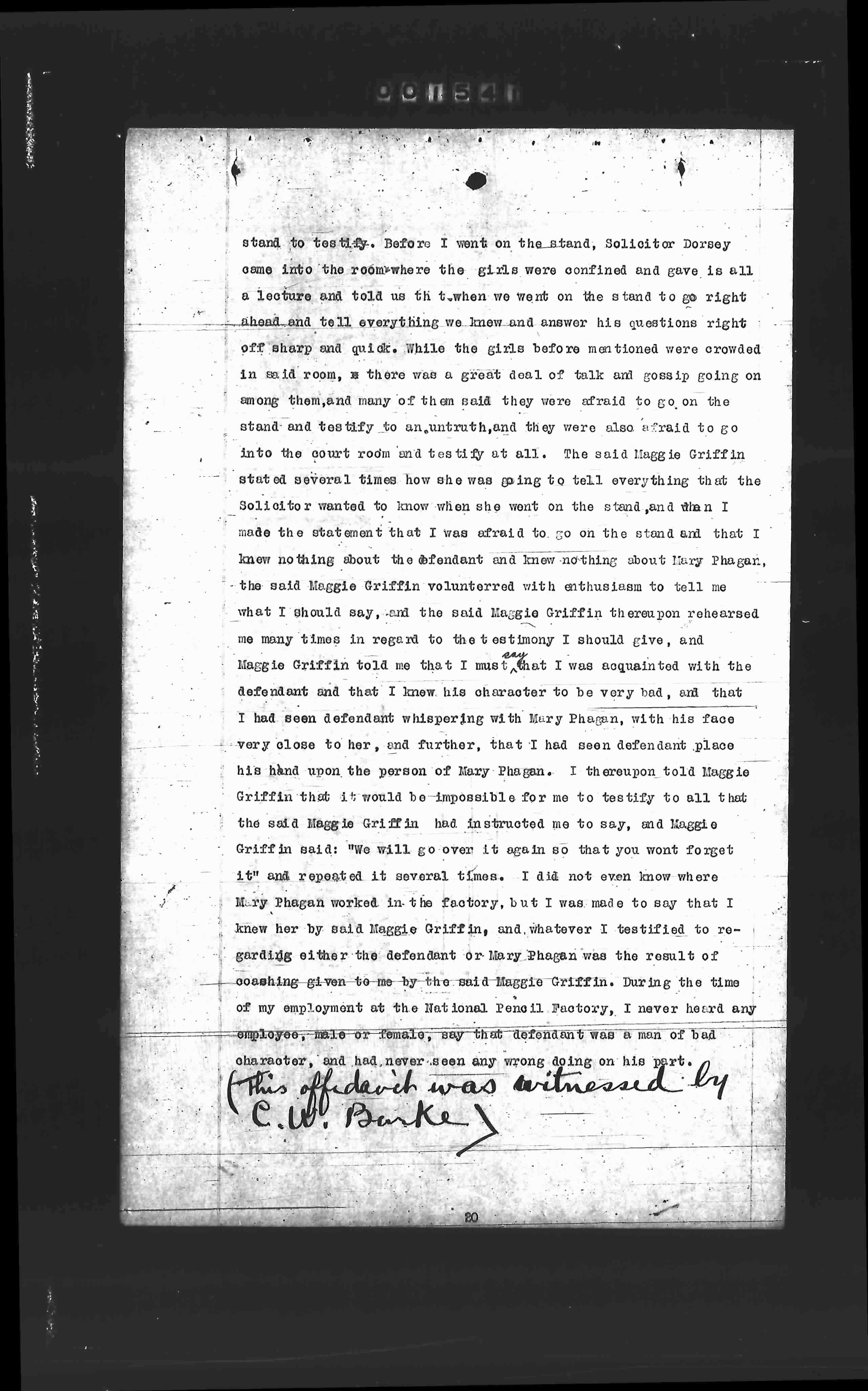 stand to testify. Before I went on the stand, Solicitor Dorsey came into the room where the girls were confined and gave us all a lecture and told us that when we went on the stand to go right ahead and tell everything we knew and answer his questions right off sharp and quick. While the girls before mentioned were crowded in said room, a great deal of talk and gossip going on among them, and many of them said they were afraid to go on the stand and testify to an untruth and they were also afraid to go into the court room and testify at all. The said Maggie Griffin stated several times how she was going to tell everything that the Solicitor wanted to know when she went on the stand, and then I made the statement that I was afraid to go on the stand and that I knew nothing about the offense and knew nothing about Mary Phagan. The said Maggie Griffin volunteered with enthusiasm to tell me what I should say, and the said Maggie Griffin thereupon rehearsed me many times in regard to the testimony I should give, and Maggie Griffin told me that I must say that I was acquainted with the defendant and that I knew his character to be very bad, and that I had seen defendant whispering with Mary Phagan, with his face very close to her, and further, that I had seen defendant place his hand upon the person of Mary Phagan. I thereupon told Maggie Griffin that it would be impossible for me to testify to all that the said Maggie Griffin had instructed me to say, and Maggie Griffin said: "We will go over it again so that you won't forget it," and repeated it several times. I did not even know where Mary Phagan worked in the factory, but I was made to say that I knew her by said Maggie Griffin, and whatever I testified to regarding either the defendant or Mary Phagan was the result of coaching given to me by the said Maggie Griffin. During the time of my employment at the National Pencil Factory, I never heard any employee, male or female, say that defendant was a man of bad character, and had never seen any wrong doing on his part.