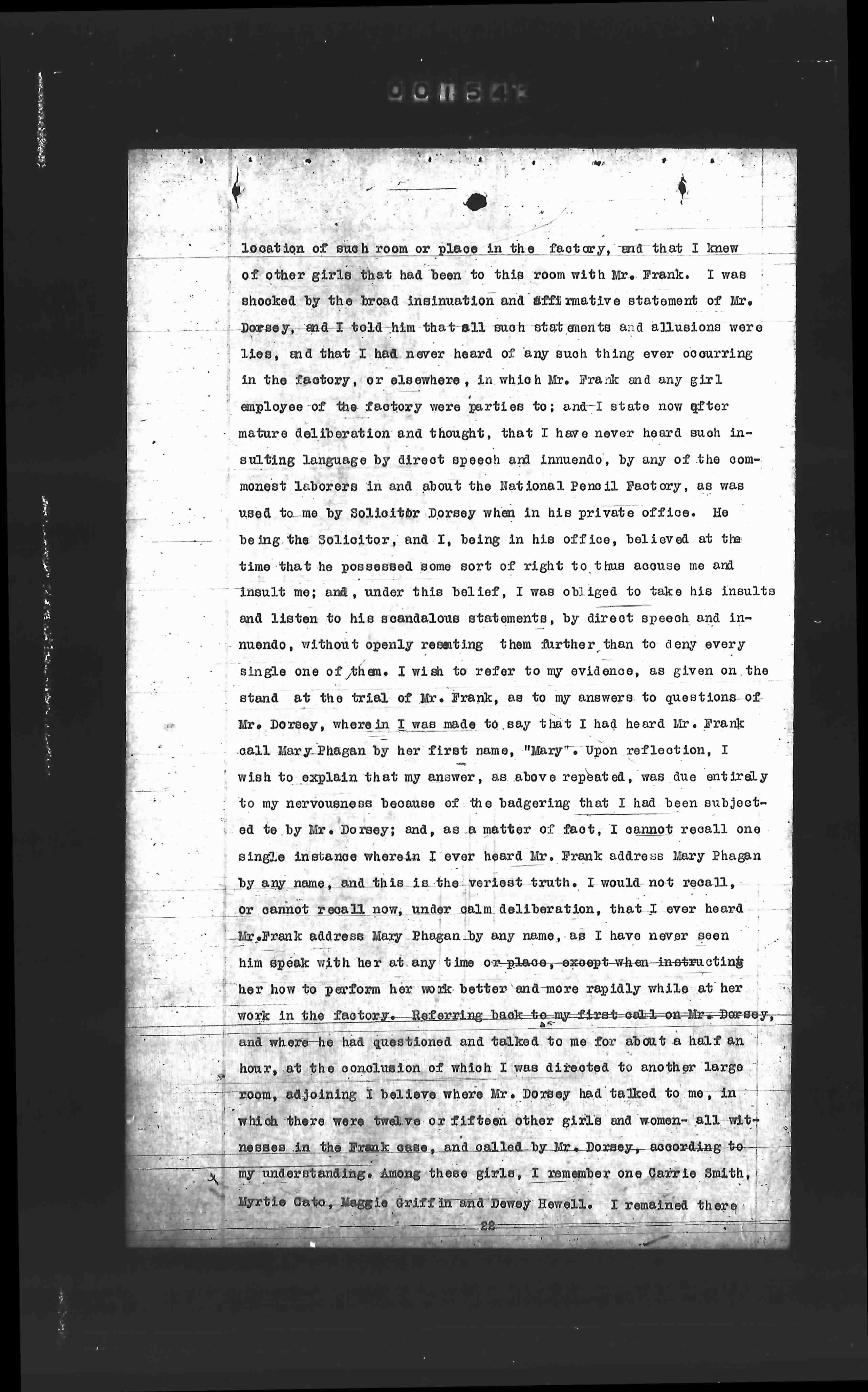 location of such room or place in the factory, and that I knew of other girls that had been to this room with Mr. Frank. I was shocked by the broad insinuation and affirmative statement of Mr. Dorsey, and I told him that all such statements and allusions were lies, and that I had never heard of any such thing ever occurring in the factory, or elsewhere, as to Mr. Frank and any girl employee of the factory were parties to; and-I state now after mature deliberation and thought, that I have never heard such insulting language by direct speech and innuendo, by any of the commonest laborers in and about the National Pencil Factory, as was used to-me by Solicitor Dorsey when in his private office. He being the Solicitor, and I being in his office, believed at the time that he possessed some sort of right to thus accuse me and insult me; and, under this belief, I was obliged to take his insults and listen to his scandalous statements, by direct speech and innuendo, without openly resenting them further than to deny every single one of them. I wish to refer to my evidence, as given on the stand at the trial of Mr. Frank, as to my answers to questions of Mr. Dorsey, where in I was made to say that I had heard Mr. Frank call Mary Phagan by her first name, "Mary". Upon reflection, I wish to explain that my answer, as above repeated, was due entirely to my nervousness because of the badgering that I had been subjected to by Mr. Dorsey; and, as a matter of fact, I cannot recall one single instance wherein I ever heard Mr. Frank address Mary Phagan by any name, and this is the veriest truth. I would not recall, or cannot recall now, under calm deliberation, that I ever heard Mr. Frank address Mary Phagan by any name, as I have never seen him speak with her at any time or place, except when instructing her how to perform her work better and more rapidly while at her work in the factory. Referring back to my first call on Mr. Dorsey, where he had questioned and talked to me for about a half an hour, at the conclusion of which I was directed to another large room, adjoining I believe where Mr. Dorsey had talked to me, in which there were twelve or fifteen other girls and women - all witnesses in the Frank case, and called by Mr. Dorsey, according to my understanding. Among these girls, I remember one Gerrie Smith, Myrtle Cato, Hattie Griffin and Dewey Howell. I remained there