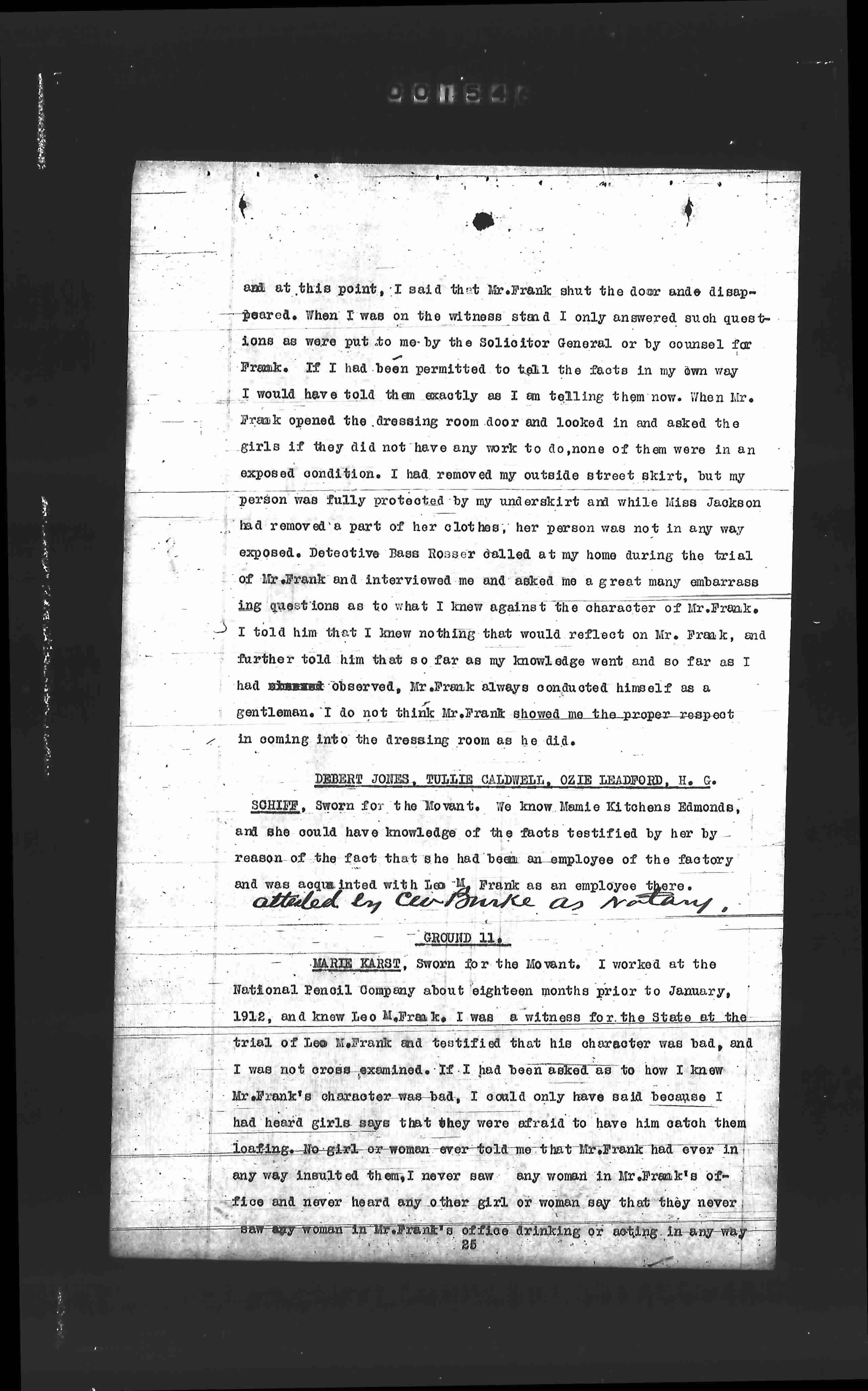 and at this point, I said that Mr.Frank shut the door and disappeared. When I was on the witness stand I only answered such questions as were put to me by the Solicitor General or by counsel for Frank. If I had been permitted to tell the facts in my own way I would have told them exactly as I am telling them now. When Mr. Frank opened the dressing room door and looked in and asked the girls if they did not have any work to do, none of them were in an exposed condition. I had removed my outside street skirt, but my person was fully protected by my underskirt and while Miss Jackson had removed a part of her clothes, her person was not in any way exposed. Detective Bass Rosser called at my home during the trial of Mr.Frank and interviewed me and asked me a great many embarrassing questions as to what I knew against the character of Mr.Frank. I told him that I knew nothing that would reflect on Mr. Frank, and further told him that so far as my knowledge went and so far as I had observed, Mr.Frank always conducted himself as a gentleman. I do not think Mr.Frank showed me the proper respect in coming into the dressing room as he did.