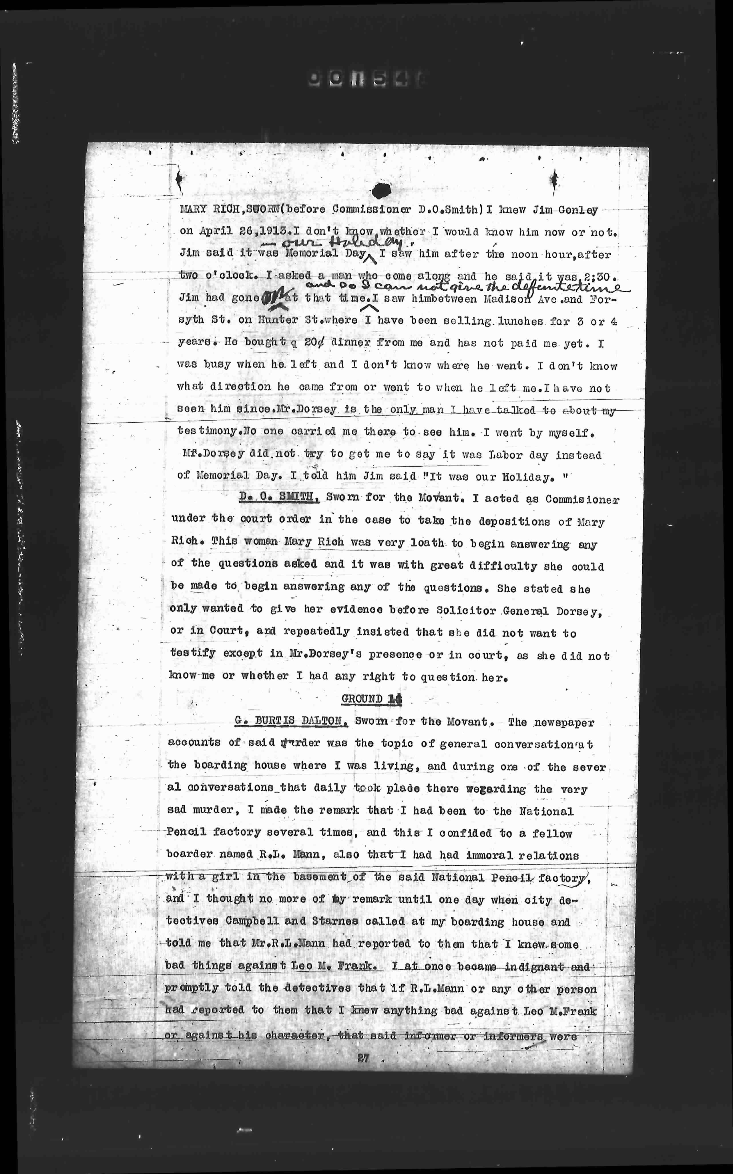 MARY RICH, SWORN (Before Commissioner D.O.Smith) I knew Jim Conley on April 26,1913. I don't know whether I would know him now or not. Jim said it was Memorial Day. I saw him after the noon hour, after two o'clock. I asked a man who some along and he said, it was 2:30. Jim had gone before that time. I saw him between Madison Ave and Forsyth St. on Hunter St where I have been selling lunches for 3 or 4 years. He bought a 20¢ dinner from me and has not paid me yet. I was busy when he left and I don't know where he went. I don't know what direction he came from or went to when he left us. I have not seen him since. Mr. Dorsey is the only man I have talked to about my testimony. No one carried me there to see him. I went by myself. Mr. Dorsey did not try to get me to say it was Labor day instead of Memorial Day. I told him Jim said it was our Holiday.