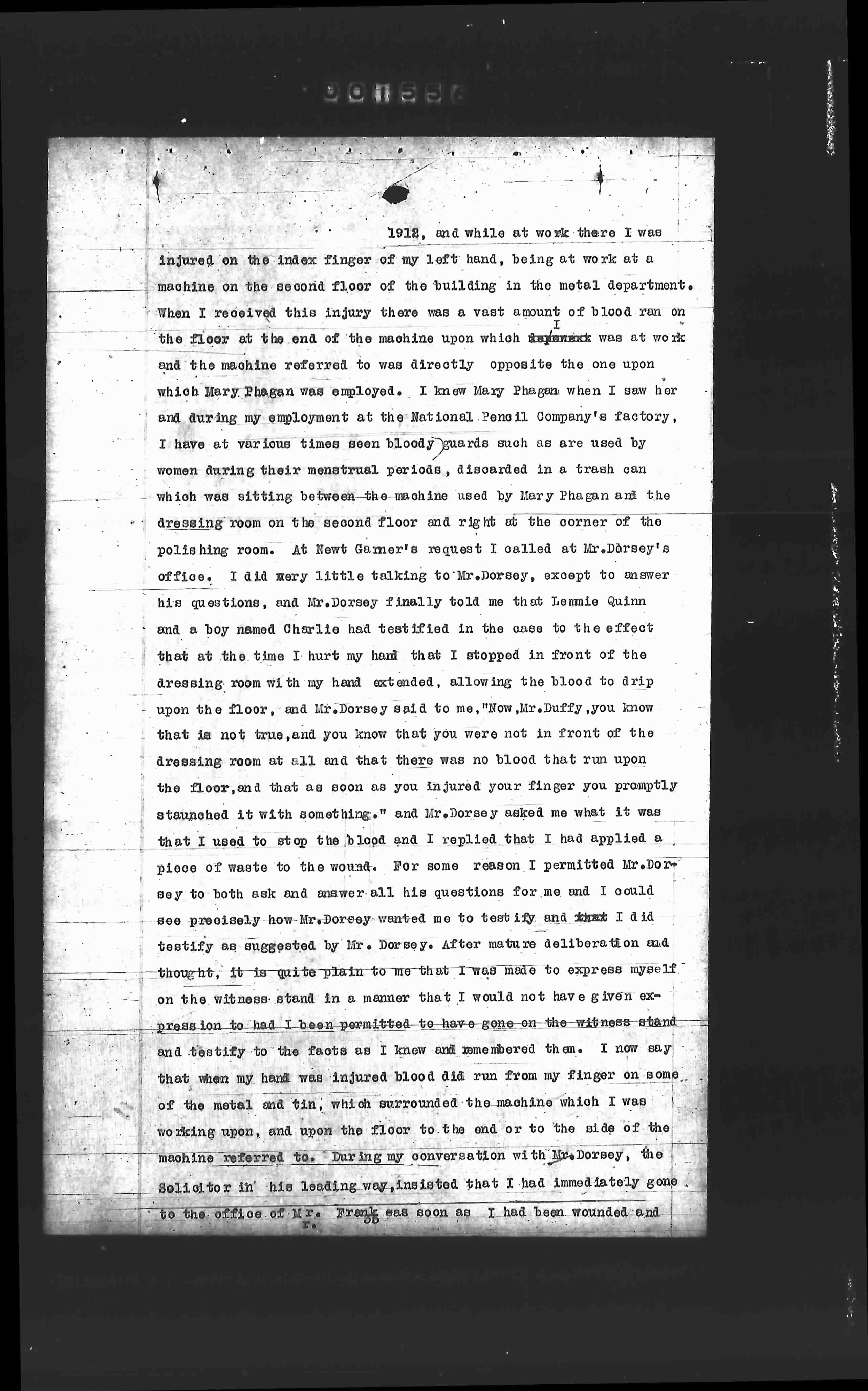 1913, and while at work there I was injured on the index finger of my left hand, being at work at a machine on the second floor of the building in the metal department. When I received this injury there was a vast amount of blood run on the floor at the end of the machine upon which I was at work and the machine referred to was directly opposite the one upon which Mary Phagan was employed. I knew Mary Phagan when I saw her and during my employment at the National Pencil Company's factory, I have at various times seen bloody pads such as are used by women during their menstrual periods, discarded in a trash can which was sitting between the machine used by Mary Phagan and the dressing room on the second floor and right at the corner of the polishing room. At Newt Garner's request I called at Mr.Dorsey's office, I did very little talking to Dorsey, except to answer his questions, and Mr.Dorsey finally told me that Lemie Quinn and a boy named Charlie had testified in the case to the effect that at the time I hurt my hand that I stopped in front of the dressing room with my hand extended, allowing the blood to drip upon the floor, and Mr.Dorsey said to me "Now, Mr.Duffy, you know that is not true, and you know that you were not in front of the dressing room at all and that there was no blood that run upon the floor, and that as soon as you injured your finger you promptly staunched it with something." and Mr.Dorsey asked me what it was that I used to stop the blood and I replied that I had applied a piece of waste to the wound. For some reason I permitted Mr.Dorsey to both ask and answer all his questions for me and I could see precisely how Mr.Dorsey wanted me to testify, and that I did testify as suggested by Mr. Dorsey. After mature deliberation and thought, it is quite plain to me that I was made to express myself on the witness stand in a manner that I would not have given expression to had I been permitted to have gone on the witness stand and testify to the facts as I knew and remembered them. I now say that when my hand was injured blood did run from my finger on some of the metal and tin, which surrounded the machine which I was working upon, and upon the floor to the end or to the side of the machine referred to. During my conversation with Mr.Dorsey, the Solicitor in his leading way, insisted that I had immediately gone to the office of Mr. Frank as soon as I had been wounded and