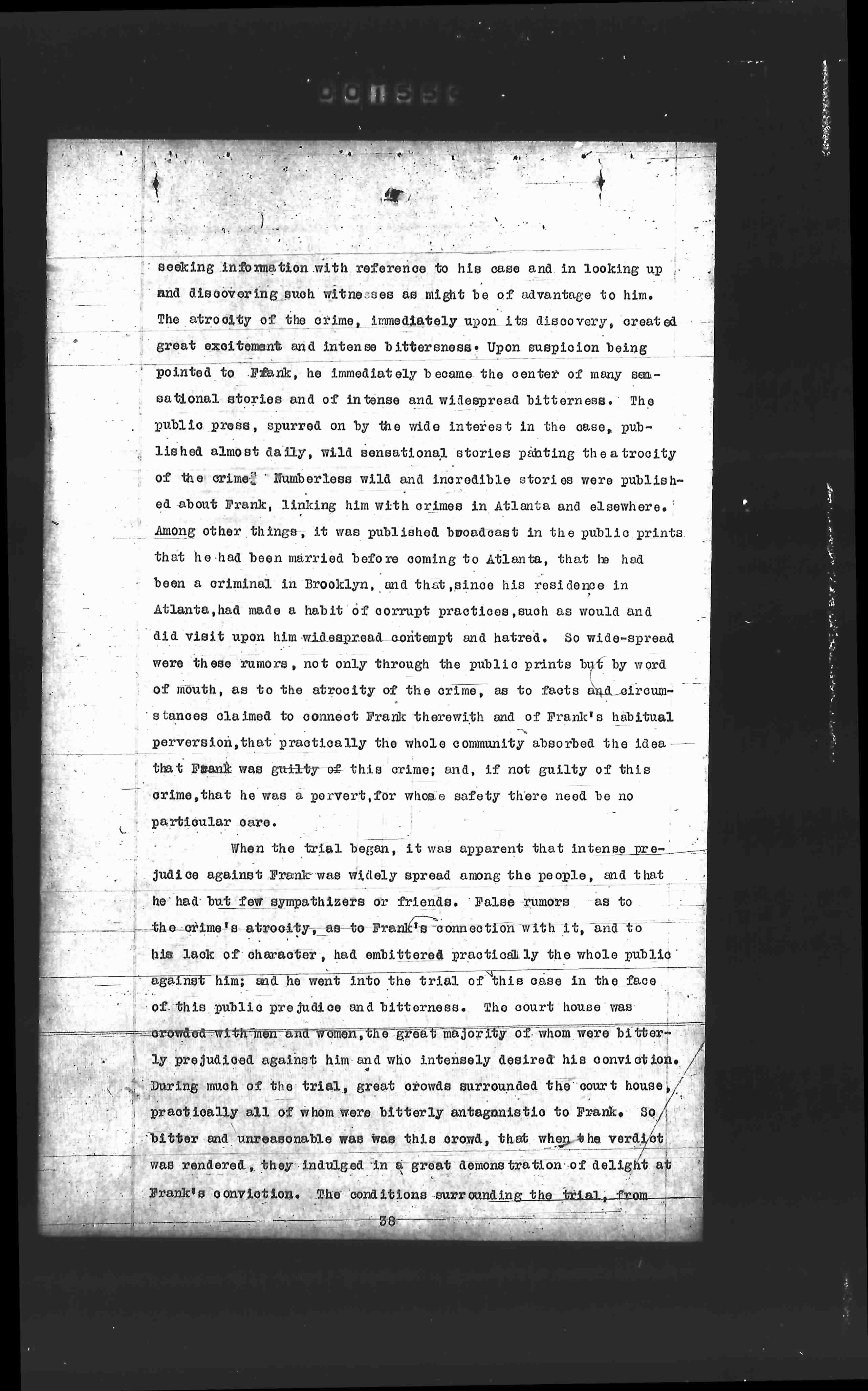 seeking information with reference to his case and in looking up and discovering such witnesses as might be of advantage to him. The atrocity of the crime, immediately upon its discovery, created great excitement and intense bitterness. Suspicion being pointed to Frank, he immediately became the center of many sensational stories and of intense and widespread bitterness. The public press, spurred on by the wide interest in the case, published almost daily, wild sensational stories painting the atrocity of the crime. Numberless wild and incredible stories were published about Frank, linking him with crimes in Atlanta and elsewhere. Among other things, it was published broadcast in the public prints that he had been married before coming to Atlanta, that he had been a criminal in Brooklyn, and that, since his residence in Atlanta, had made a habit of corrupt practices, such as would and did visit upon him widespread contempt and hatred. So wide-spread were these rumors, not only through the public prints but by word of mouth, as to the atrocity of the crime, as to facts and circumstances claimed to connect Frank therewith and of Frank's habitual perversion, that practically the whole community absorbed the idea that Frank was guilty of this crime and, if not guilty of this crime, that he was a pervert, for whose safety there need be no particular care.
