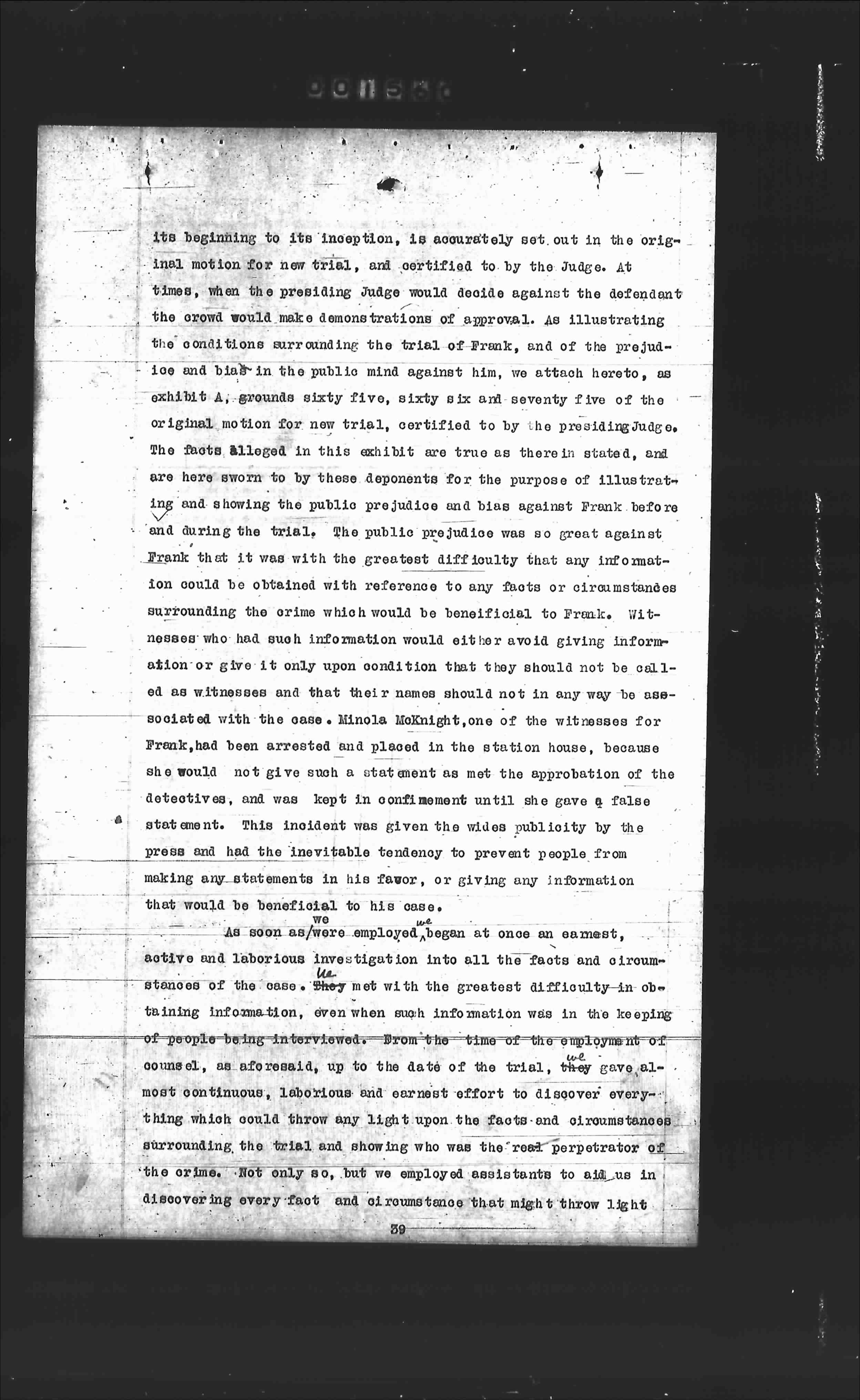 its beginning to its inception, is accurately set out in the original motion for new trial, and certified to by the Judge. At times, when the presiding Judge would decide against the defendant the crowd would make demonstrations of approval. As illustrating the conditions surrounding the trial of Frank, and of the prejudice and bias in the public mind against him, attention hereto, as exhibit A, grounds sixty five, sixty six and seventy five of the original motion for new trial, certified to by the presiding Judge. The facts alleged in this exhibit are true as therein stated, and are here sworn to by these deponents for the purpose of illustrating and showing the public prejudice and bias against Frank before and during the trial. The public prejudice was so great against Frank that it was with the greatest difficulty that any information could be obtained with reference to any facts or circumstances surrounding the crime which would be beneficial to Frank. Witnesses who had such information either avoid giving information or give it only upon condition that they should not be called as witnesses and that their names should not in any way be associated with the case. Minola McKnight, one of the witnesses for Frank, had been arrested and placed in the station house, because she would not give such a statement as met the approbation of the detectives, and was kept in confinement until she gave a false statement. This incident was given the widest publicity by the press and had the inevitable tendency to prevent people from making any statements in his favor, or giving any information that would be beneficial to his case.