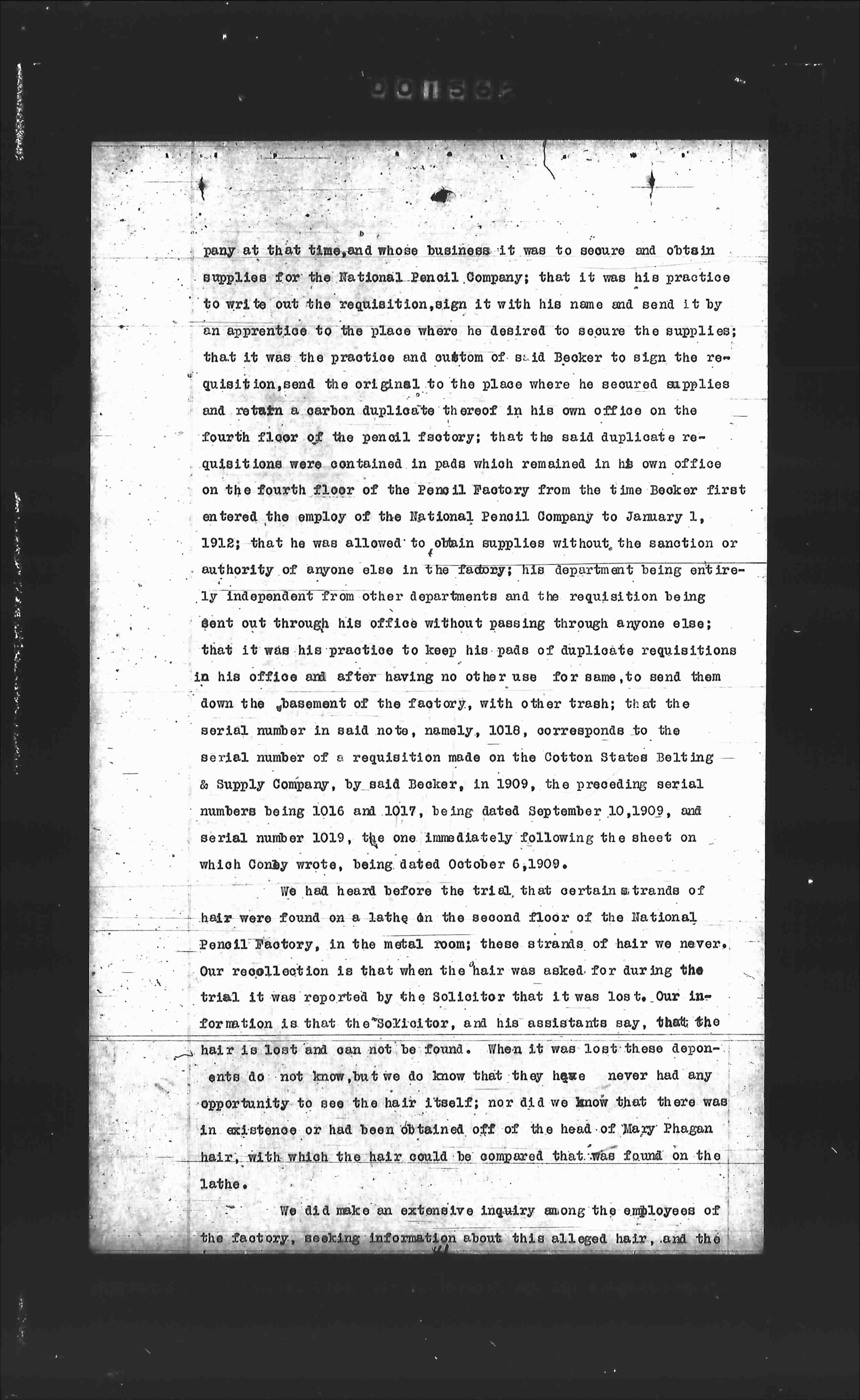 pany at that time, and whose business it was to secure and obtain supplies for the National Pencil Company; that it was his practice to write out the requisition, sign it with his name and send it by an apprentice to the place where he desired to secure the supplies; that it was the practice and custom of Mr. Becker to sign the requisition, send the original to the place where he secured supplies and retain a carbon duplicate thereof in his own office on the fourth floor of the pencil factory; that the said duplicate requisitions were contained in pads which remained in his own office on the fourth floor of the Pencil Factory from the time Becker first entered the employ of the National Pencil Company to January 1, 1912; that he was allowed to obtain supplies without the sanction or authority of anyone else in the factory; his department being entirely independent from other departments and the requisition being sent out through his office without passing through anyone else; that it was his practice to keep his pads of duplicate requisitions in his office and after having no other use for same, to send them down the basement of the factory, with other trash; that the serial number in said note, namely, 1018, corresponds to the serial number of a requisition made on the Cotton States Belting & Supply Company, by said Becker, in 1909, the preceding serial numbers being 1016 and 1017, being dated September 10, 1909, and serial number 1019, the one immediately following the sheet on which Conley wrote, being dated October 6, 1909.