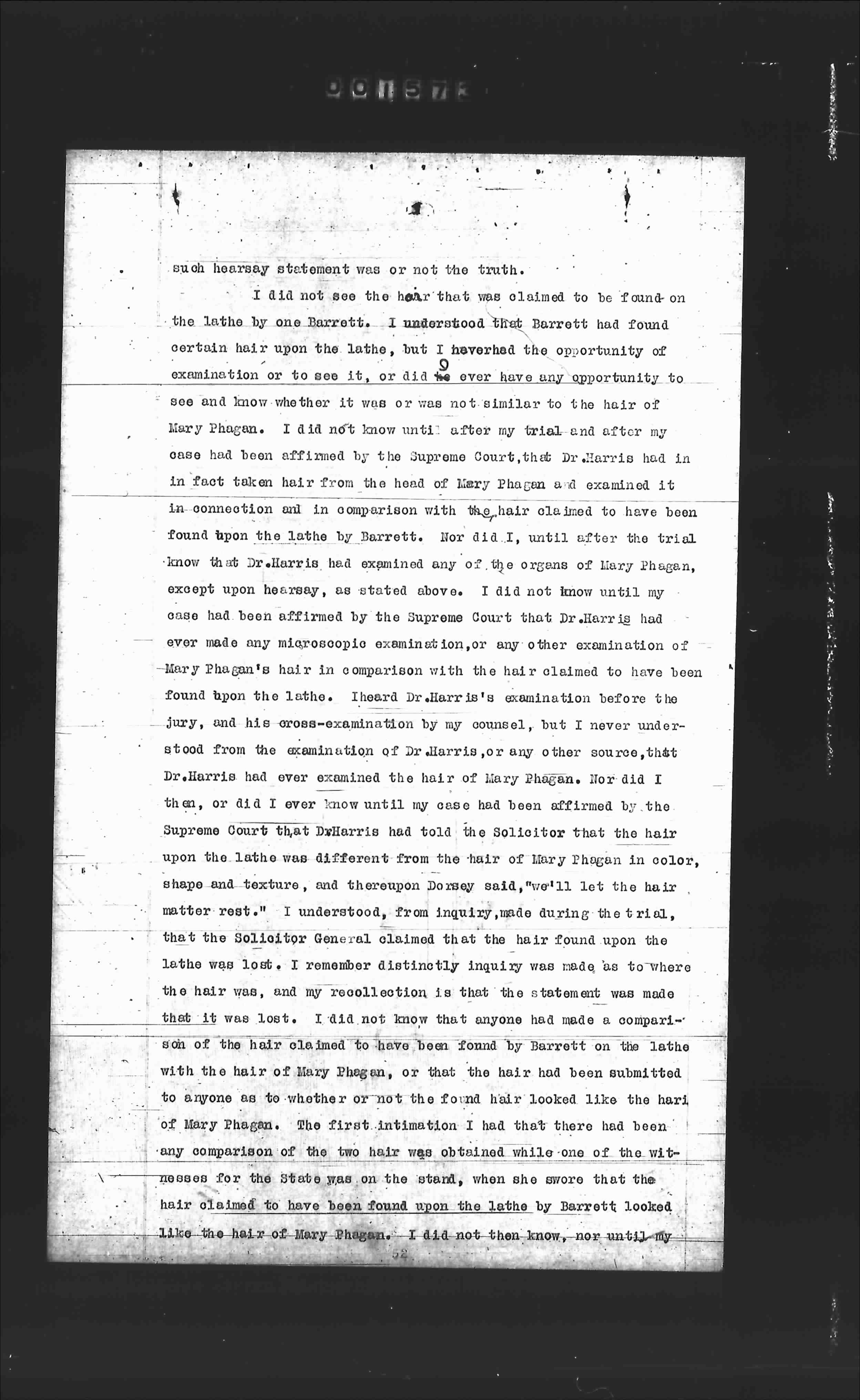 I did not see the hair that was claimed to be found on the lathe by one Barrett. I understood that Barrett had found certain hair upon the lathe, but I have never had any opportunity of examination or to see it, or did the officers or any opportunity to see and know whether it was or was not similar to the hair of Mary Phagan. I did not know until after my trial, and after my case had been affirmed by the Supreme Court, that Dr.Harris had in fact taken hair from the head of Mary Phagan and examined it in connection and in comparison with the hair claimed to have been found upon the lathe by Barrett. Nor did I, until after the trial, know that Dr.Harris had examined any of the organs of Mary Phagan, except upon hearsay, as stated above. I did not know until my case had been affirmed by the Supreme Court that Dr.Harris had ever made any microscopic examination, or any other examination of Mary Phagan's hair in comparison with the hair claimed to have been found upon the lathe. I heard Dr.Harris's examination before the jury, and his cross-examination by my counsel, but I never understood from the examination of Dr.Harris, or any other source, that Dr.Harris had ever examined the hair of Mary Phagan, nor did I then, or did I ever know until my case had been affirmed by the Supreme Court that Dr.Harris had told the jury, or that the hair upon the lathe was different from the hair of Mary Phagan in color, shape and texture, and thereupon Dorsey said "we'll let the hair matter rest." I understood, from inquiry, made during the trial, that the Solicitor General claimed that the hair found upon the lathe was lost, I remember distinctly inquiry was made as to where the hair was, and my recollection is that the statement was made that it was lost. I did not know that anyone had made a comparison of the hair claimed to have been found by Barrett on the lathe with the hair of Mary Phagan, or that the hair had been submitted to anyone as to whether or not the found hair looked like the hair of Mary Phagan. The first intimation I had that there had been any comparison of the two hair was obtained while one of the witnesses for the State was on the stand, when she swore that the hair claimed to have been found upon the lathe by Barrett looked like the hair of Mary Phagan. I did not then know, nor until my
