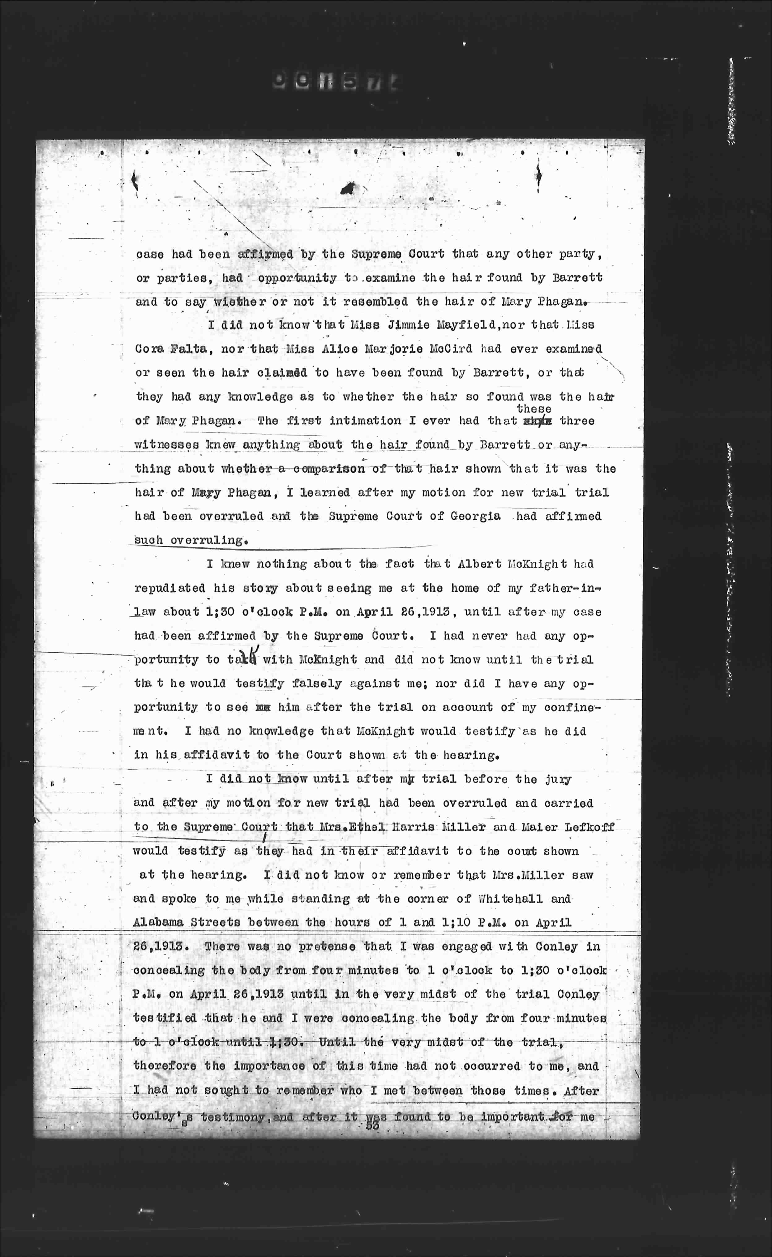 I did not know until after my trial before the jury and after my motion for new trial had been overruled and carried to the Supreme Court that Mrs. Ethel Harris Miller and Miss LeoKoff would testify as they had in their affidavit to the court shown at the hearing. I did not know or remember that Mrs. Miller saw and spoke to me while standing at the corner of Whitehall and Alabama Streets between the hours of 1 and 1:10 P.M. on April 26, 1913. There was no pretense that I was engaged with Conley in concealing the body from four minutes to 1 o'clock to 1:30 o'clock P.M. on April 26, 1913 until in the very midst of the trial Conley testified that he and I were concealing the body from four minutes to 1 o'clock until 1:30. Until the very midst of the trial, therefore the importance of this time had not occurred to me, and I had not sought to remember who I met between those times. After Conley's testimony, and after it was found to be important for me
