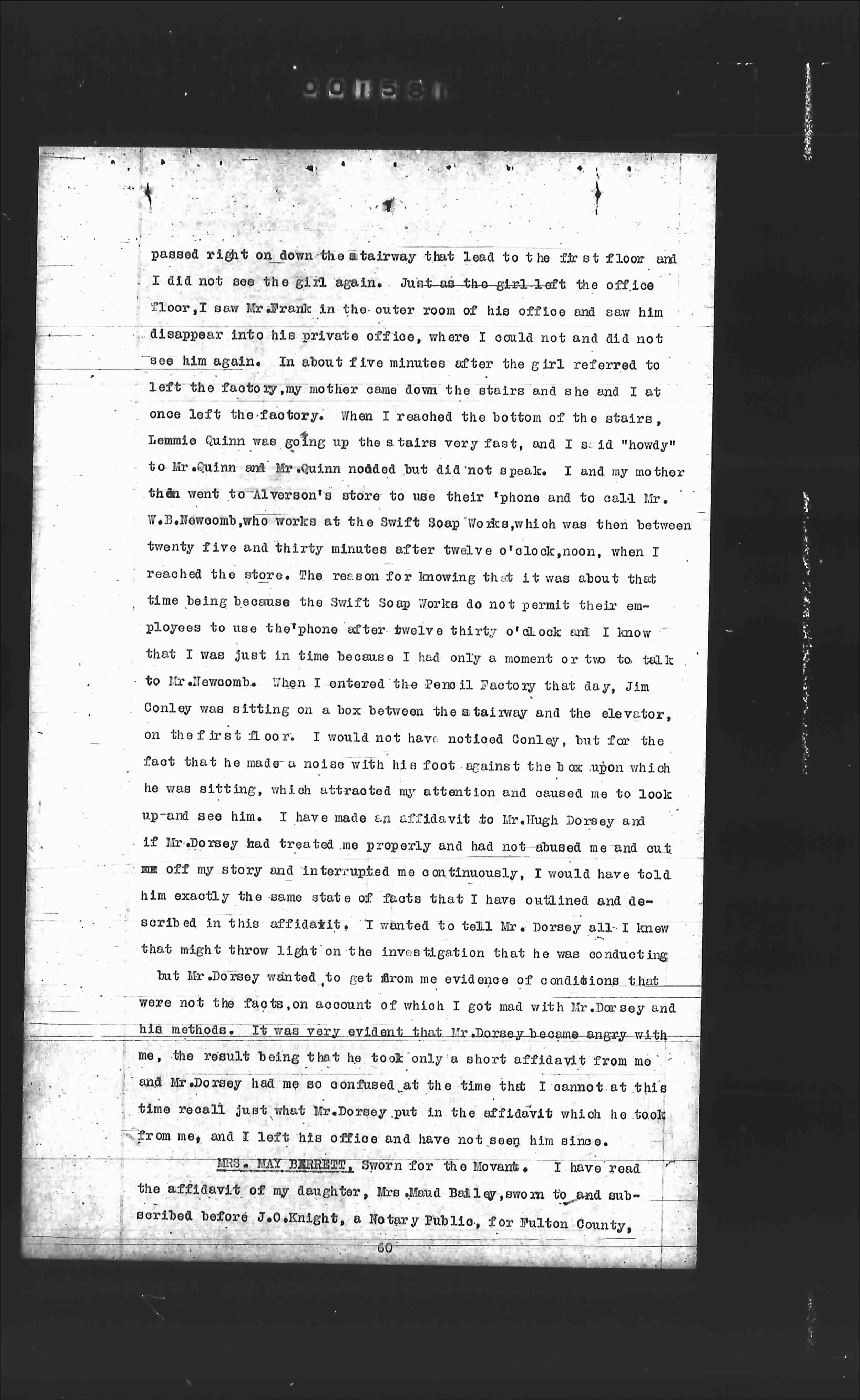 passed right on down the stairway that lead to the 1st floor and I did not see the girl again. Just as the girl left the office floor, I saw Mr.Frank in the outer room of his office and saw him disappear into his private office, where I could not and did not see him again. In about five minutes after the girl referred to left the factory, my mother came down the stairs and she and I at once left the factory. When I reached the bottom of the stairs, Lemmie Quinn was going up the stairs very fast, and I said "howdy" to Mr.Quinn and Mr.Quinn nodded but did not speak. I and my mother then went to Alverson's store to use their 'phone and to call Mr. W.B.Newcomb, who works at the Swift Soap Works, which was then between twenty five and thirty minutes after twelve o'clock, noon, when I reached the store. The reason for knowing that it was about that time being because the Swift Soap Works do not permit their employees to use the 'phone after twelve thirty o'clock and I know that I was just in time because I had only a moment or two to talk to Mr.Newcomb. When I entered the Pencil Factory that day, Jim Conley was sitting on a box between the stairway and the elevator, on the first floor. I would not have noticed Conley, but for the fact that he made a noise with his foot against the box upon which he was sitting, which attracted my attention and caused me to look up and see him. I have made an affidavit to which Dorsey and Mr.Dorsey had treated me improperly and had abused me and cut me off my story and interrupted me continuously, I would have told him exactly the same state of facts that I have outlined and described in this affidavit. I wanted to tell Mr.Dorsey all I knew that might throw light on the investigation that he was conducting but Mr.Dorsey wanted to get from me evidence of conditions that were not the facts, on account of which I got mad with Mr.Dorsey and his methods. It was very evident that Mr.Dorsey became angry with me, the result being that he took only a short affidavit from me and Mr.Dorsey had me so confused at the time that I cannot at this time recall just what Mr.Dorsey put in the affidavit which he took from me, and I left his office and have not seen him since.