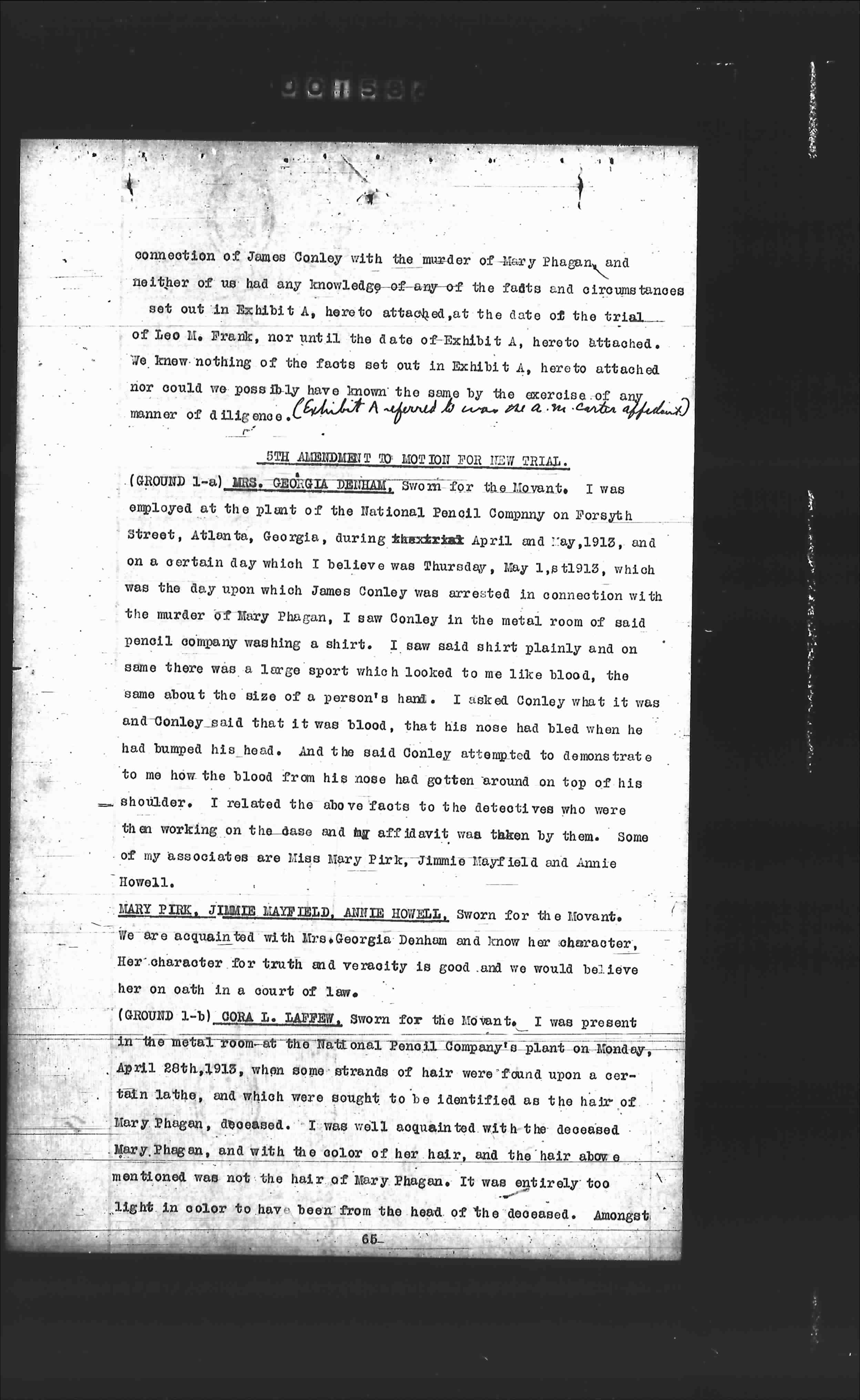 (GROUND 1-a) MRS. GEORGIA DENHAM, Sworn for the Movant. I was employed at the plant of the National Pencil Company on Forsyth Street, Atlanta, Georgia, during the month of April and May, 1913, and on a certain day which I believe was Thursday, May 1, 1913, which was the day upon which James Conley was arrested in connection with the murder of Mary Phagan, I saw Conley in the metal room of said pencil company washing a shirt. I saw said shirt plainly and on same there was a large spot which looked to me like blood, the same about the size of a person's hand. I asked Conley what it was and Conley said that it was blood, that his nose had bled when he had bumped his head, and the said Conley attempted to demonstrate to me how the blood from his nose had gotten around on top of his shoulder. I related the above facts to the detectives who were then working on the case and my affidavit was taken by them. Some of my associates are Miss Mary Fink, Jimmie Mayfield and Annie Howell.