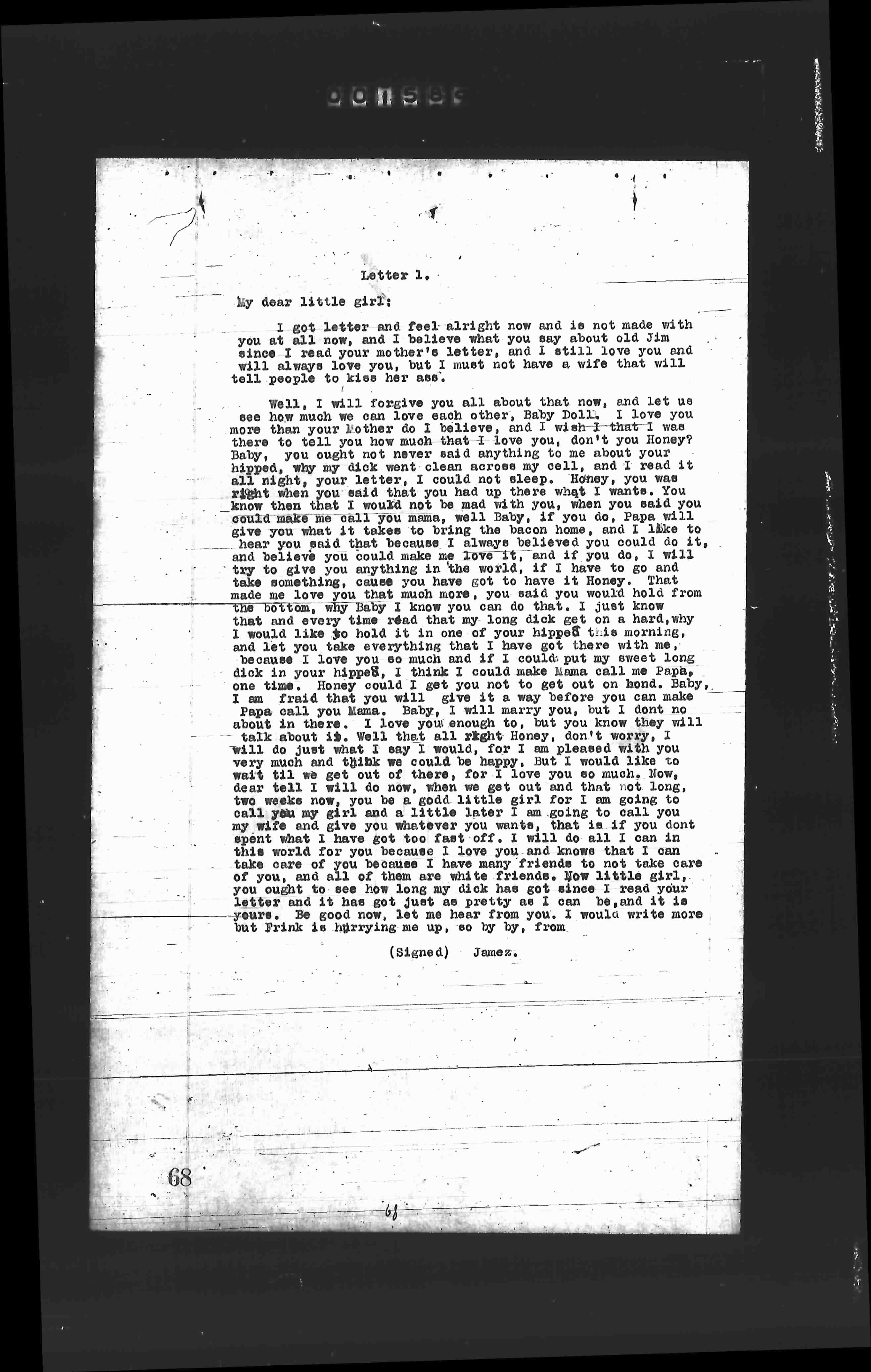 Well, I will forgive you all about that now, and let us see how much we love each other Baby Doll. I love you more than you can know. I love you with all my heart and I wish--that I was there to set you now how much that I love you, don't you Honey? Baby, you ought not say anything to me about your hipped, why my dick went clean across my cell, and I read it all night, your letter, I could not sleep. Honey, you was right when you said that you had up there what I wanted. You know then that I would not be mad with you, when you said you could make me call you mama. I will Baby, if you do. Papa will give you what you want because the baby believed you could do it, hear, and you could make me say it, and if you do, I will try to give you anything in the world. If I have to go and take something, cause you have got to have it Honey. That made me love you that much more, you said you would hold from the bottom, why Baby I know you can do that. I just know that and every time I read that my long dick get on hard, why I would like to hold it in one of your hipped tits morning, and let you take everything that I have got there with me because I love you so much and I could put my sweet long dick in your hipped, I think you ought to come to see me one more time and stay all night with me all night in a room and bond Baby, one more time that you will say it a way before you can make, Papa call you Mama. Baby, I will marry you, but I don't no about in there. I love you enough to, but you know they will talk about it. Well they all right Honey, don't worry, I will do just what I say I would, for I am pleased with you very much and think we could be happy, but would like to wait till we get out of there, for I love you so much, how dear tell I will do now, when we get out and not long, because I love you with all my heart and soul, and I want my wife and give you whatever you want, that is if you don't spent what I have got too fast. You will do all I can in this world for you because I love you and know that I can take care of you because I have many friends now to not take care of you, and all of them are white friends. Now little girl, you ought to see how long my dick has got since I read your letter and it has got all pretty since you come, and it is yours. Be good now, tell me hear from you. I would write more but Frank is hurrying me up so by, by,