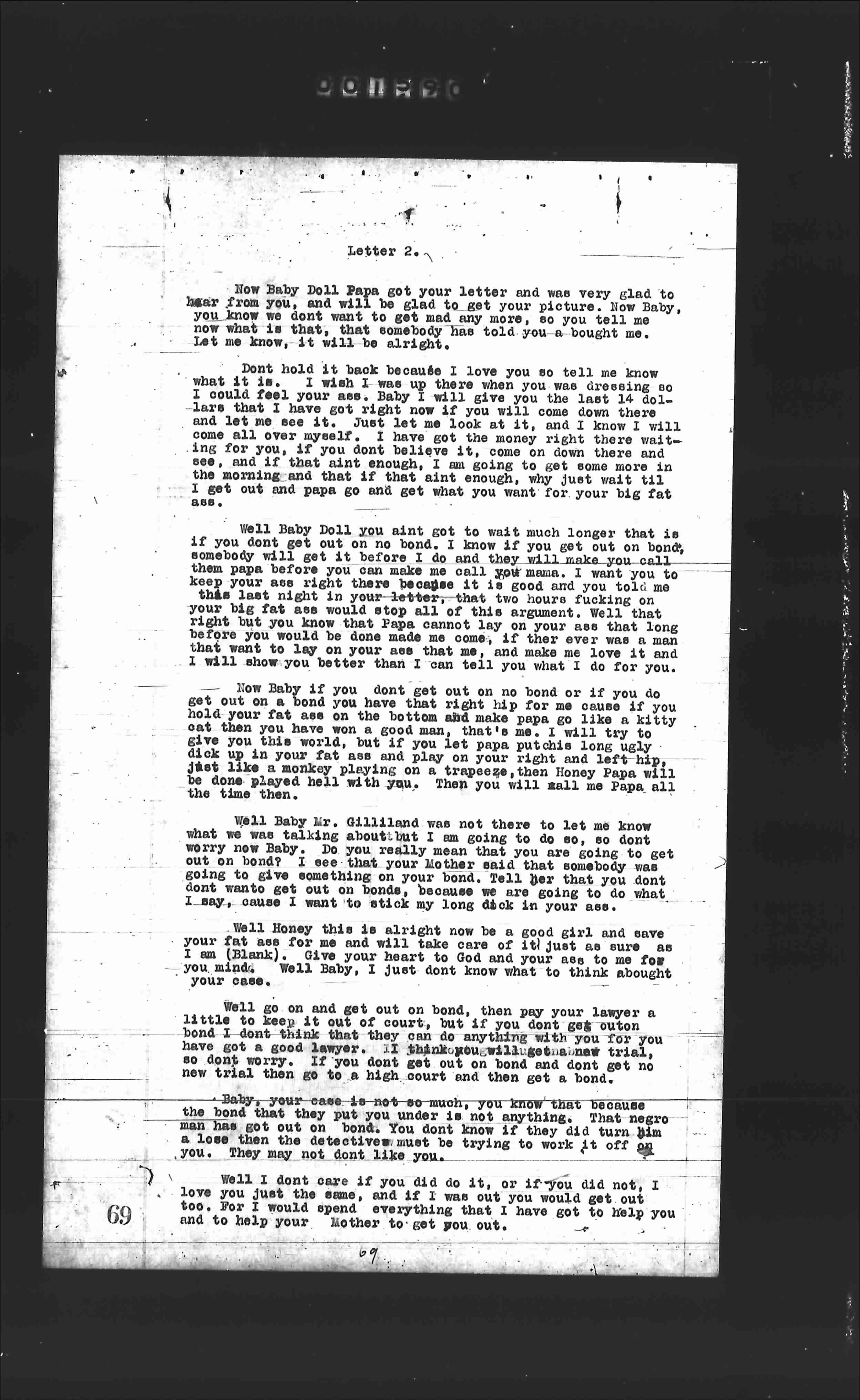 Dont hold it back because I love you so to tell me know what it is. I wish I was up there with you was dressing so I could feel your ass. Baby I will give you the last 14 dol- lars I have if you will let me fuck you. Now if you come down there and let me have it just one more look at it, and I know I will come all over myself. I have no money right now but wait- ing for you, if you dont believe it, come on down there and see, and if that aint enough, I am to come over and the morning and that if that aint enough, why just wait till I get out and papa go and get what you want for your big fat ass.