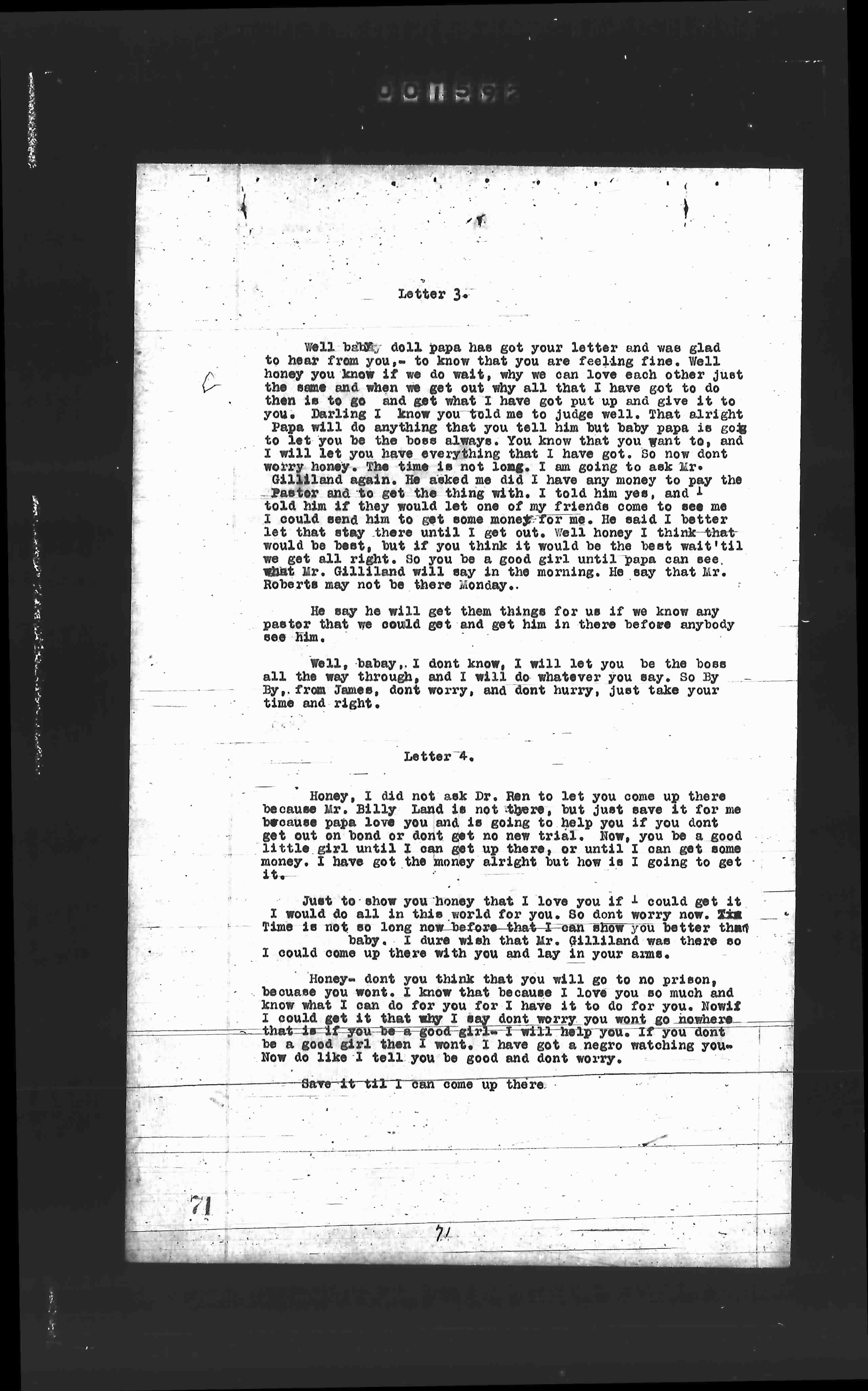 Honey, I did not ask Dr. Ben to let you come up there because Mr. Billy Land is not there, but just save it for me because papa love you and I want you to help you if you dont get out on bond or dont get no one to trial. Now, you be a good little girl until I can get some more, or until I can get some money. I have got the money alright but how is I going to get it.