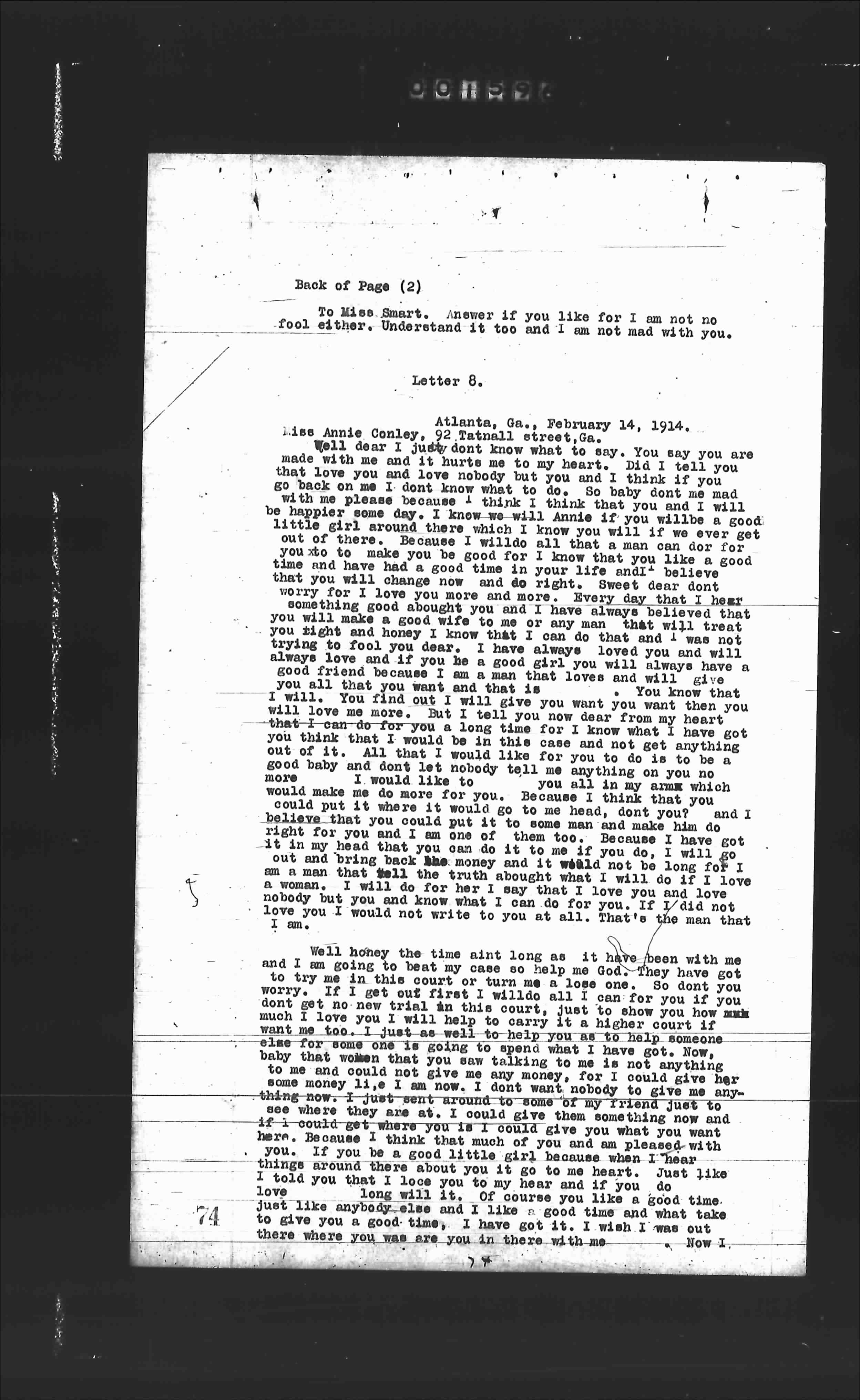 Well dear I Judst don't know what to say. You say you are made with me and it hurt me to my heart. Did I tell you that love you and love nobody but you and I think if you Go back on me I don't know what to do. So baby dont me mad be with me please because I think I think that you and I will be happyer day. I know we will Annie if you will be a good little girl around there which I know you will if we ever get out of this scrape because I will do all that a man can dor for you to do to make you good girl for I know that you like a good time and have had good time and will have good time and will change now and do all your life and believe that you will change now and more right. Every dear dont worry for I love you more and more every day that I hear something good about you and I have always believed that you will make a good wife to me or any man that will treat you right and honey I know that I can do that and I want you always to fool you dear. I have always loved you and will always love you and if you be a good girl you will always have a good friend because I am a man that loves and will give all I have for you and that is all I can do. You know that I will all that I can give you want you want then you will love me more. But I will give you more than you think I can do for you a long time now dear from my heart you think that I would be in this or I know what I have got out of it. All that I would like for you to get anything good baby and dont let nobody tell me anything one to be a more I would like to you all in my arms which would make me do more for you. Because I think that you could put it where it would do me good me and make him do right for you and I am one of the too. Because I have got it out my head that you cant do wrong me if you do. I will go out with the man back man and it would not be long for I am a man. I will do for you bought what I will do if I love a woman. I will do for when you know that you and love nobody but you and know what I love you and love you. I would not write to you at all that. If I did not love you. I would not write to you at all. It's the man that I am.