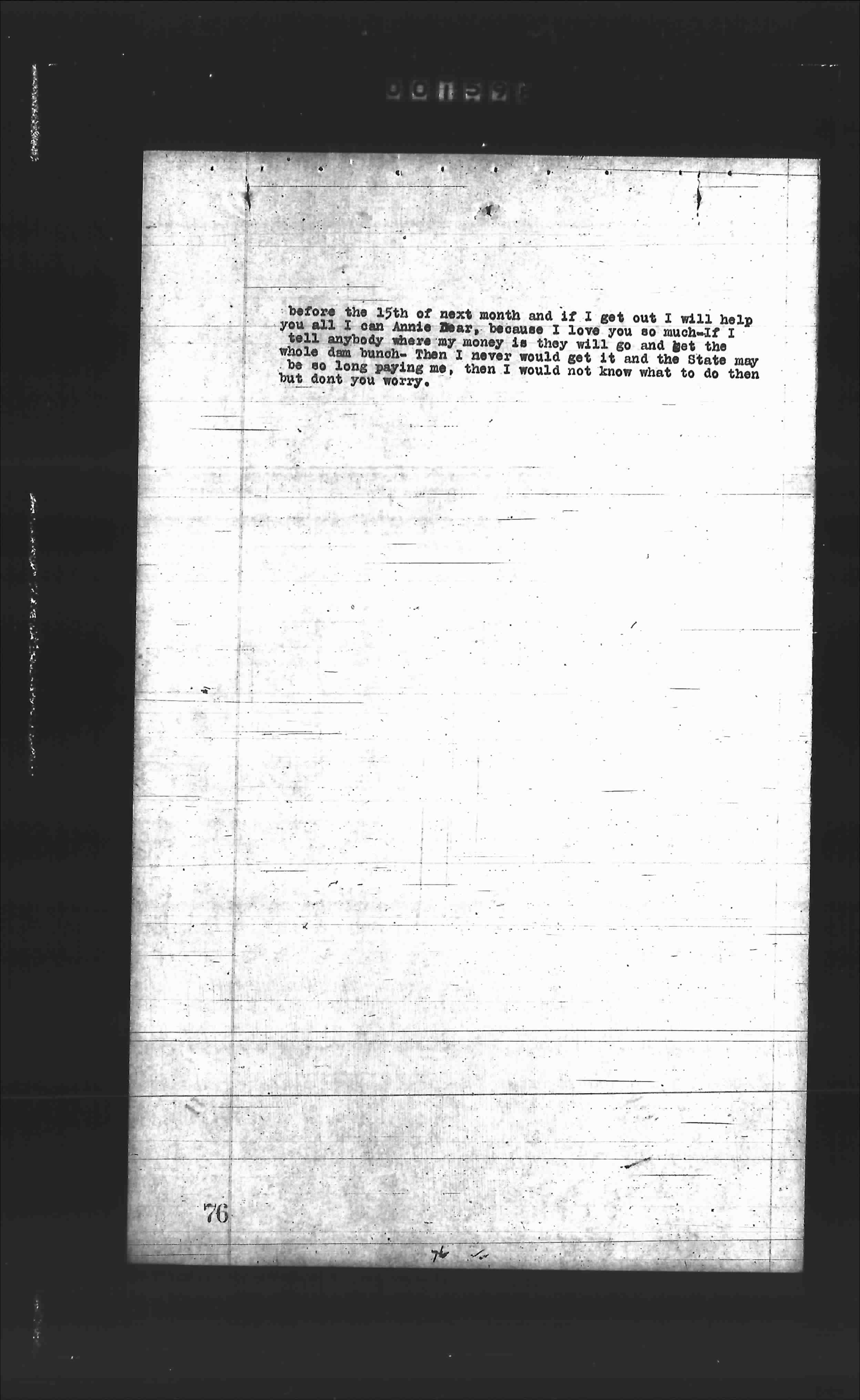 before the 15th of next month and if I get out I will help you all. I can Annie Bear, because I love you so much=If I tell anybody where my money is they will go and get the whole dam bunch= Then I never would get it and the State may be so long paying me, they would not know what to do then but dont you worry.