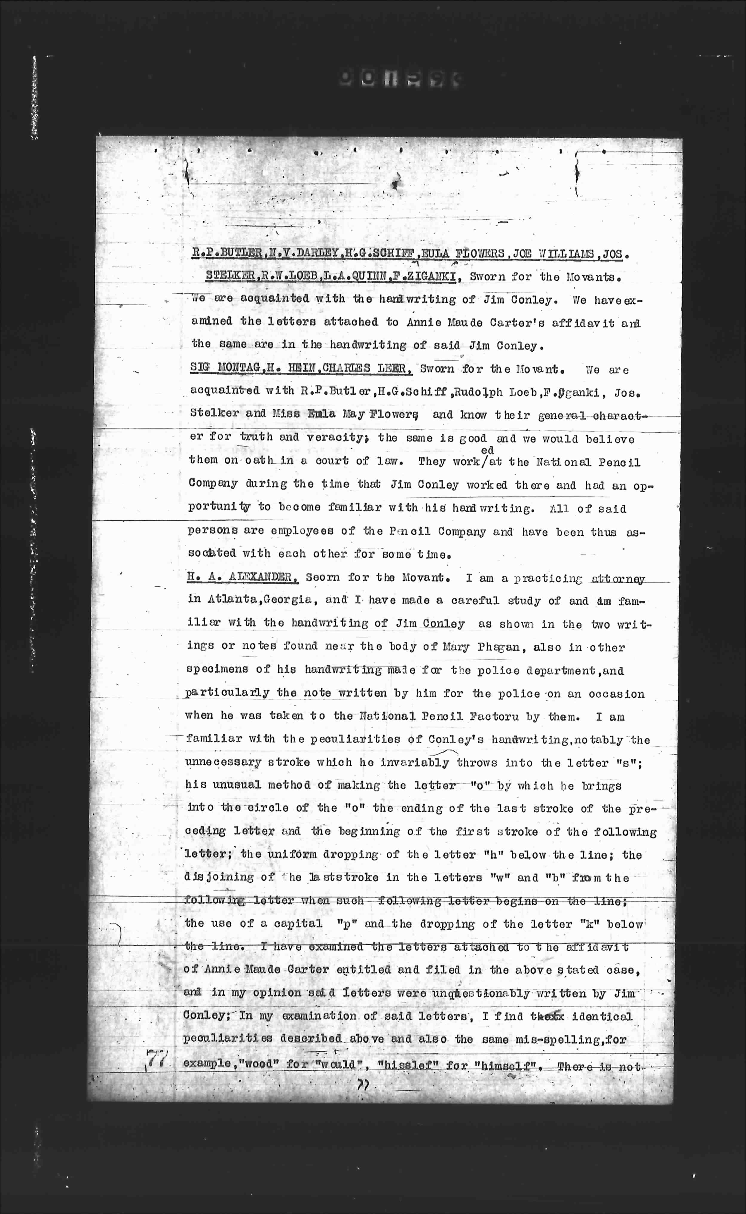 H. A. ALEXANDER, Sworn for the Movant. I am a practicing attorney in Atlanta, Georgia, and I have made a careful study of and am familiar with the handwriting of Jim Conley as shown in the two writings or notes found near the body of Mary Phagan, also in other specimens of his handwriting made for the police department, and particularly the note written by him for the police on an occasion when he was taken to the National Pencil Factory by them. I am familiar with the peculiarities of Conley's handwriting, notably the unnecessary stroke which he invariably throws into the letter "s"; his unusual method of making the letter "o" by which he brings the line into the circle of the "o"; the ending of the last stroke of the preceding letter and the beginning of the first stroke of the following letter; the uniform dropping of the letter "h" below the line; the disjoining of the last stroke in the letters "m" and "n" from the following letter when such following letter begins on the line; the use of a capital "p" and the dropping of the letter "k" below the line. I have examined the letters attached to the affidavit of Annie Maude Carter entitled and filed in the above stated case, and in my opinion said letters were unquestionably written by Jim Conley. In my examination of said letters, I find the identical peculiarities described above and also the same mis-spelling, for example, "wood" for "would", "hisself" for "himself". There is not
