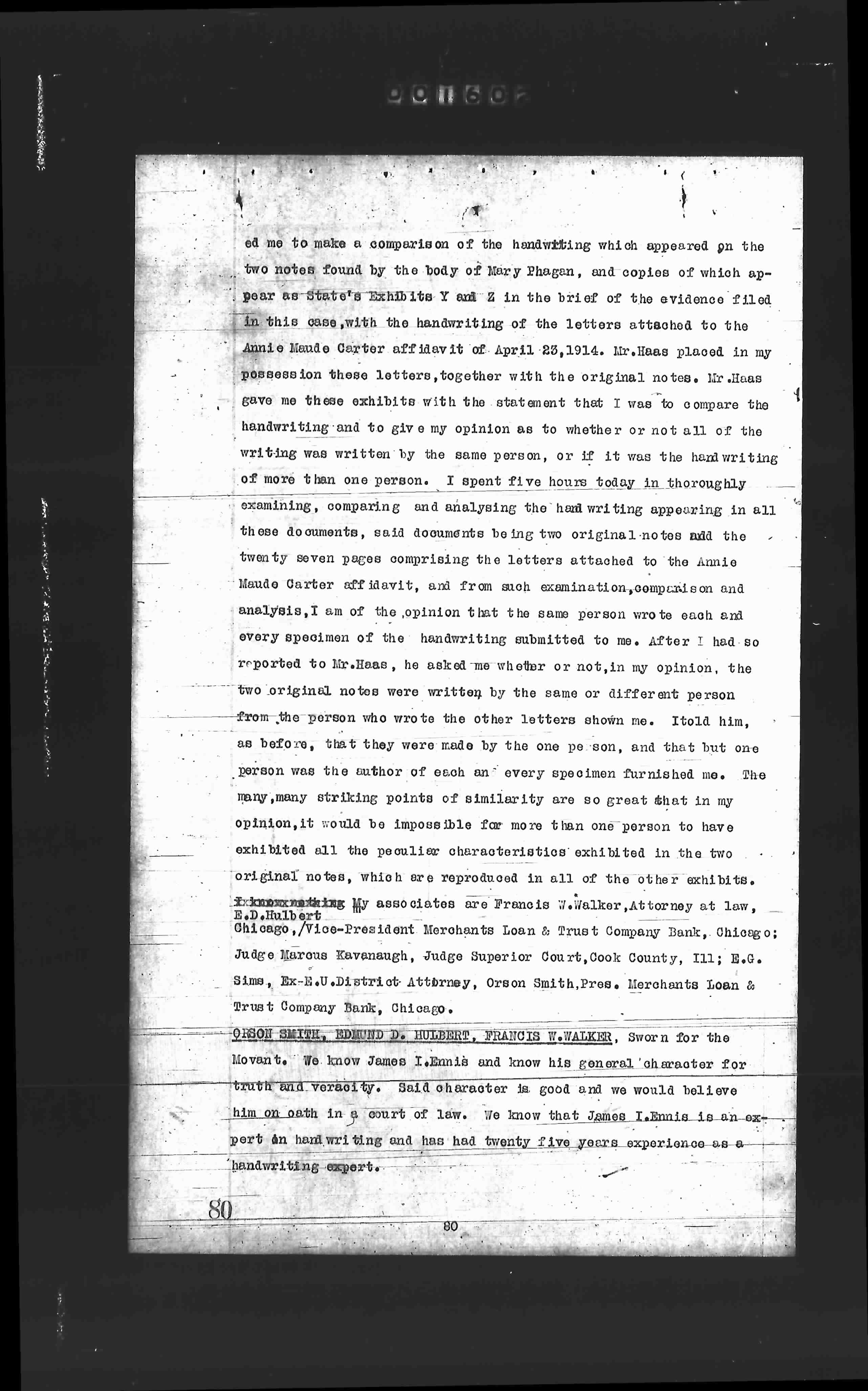 ed me to make a comparison of the handwriting which appeared on the two notes found by the body of Mary Phagan, and copies of which appear as State's Exhibits Y and Z in the brief of the evidence filed in this case, with the handwriting of the letters attached to the Annie Maude Carter affidavit of date, 28,1914. Mr. Haas placed in my possession these letters, together with the original notes. Mr. Haas gave me these exhibits with the statement that I was to compare the handwriting and to give my opinion as to whether or not all of the writing was written by the same person, or if it was the handwriting of more than one person. I spent five hours today in thoroughly examining, comparing and analyzing the handwriting appearing in all these documents, said documents being two original notes and the twenty seven pages comprising the letters attached to the Annie Maude Carter affidavit, and from such examination, comparison and analysis, I am of the opinion that the same person wrote each and every specimen of the handwriting submitted to me. After I had so reported to Mr. Haas, he asked me whether or not, in my opinion, the two original notes were written by the same or different person from the person who wrote the other letters shown me. I told him, as before, that they were made by the one person, and that but one person was the author of each and every specimen furnished me. The many many striking points of similarity are so great that in my opinion, it would be impossible for more than one person to have exhibited all the peculiar characteristics exhibited in the two original notes, which are reproduced in all of the other exhibits. The following of my associates are Francis W. Walker, Attorney at Law, Chicago; Vice-President Merchants Loan & Trust Company Bank, Chicago; Judge Marcus Kavanaugh, Judge Superior Court, Cook County, Ill; E.G. Sims, Ex-U.S. District Attorney, Oregon Smith, Pres. Merchants Loan & Trust Company Bank, Chicago.