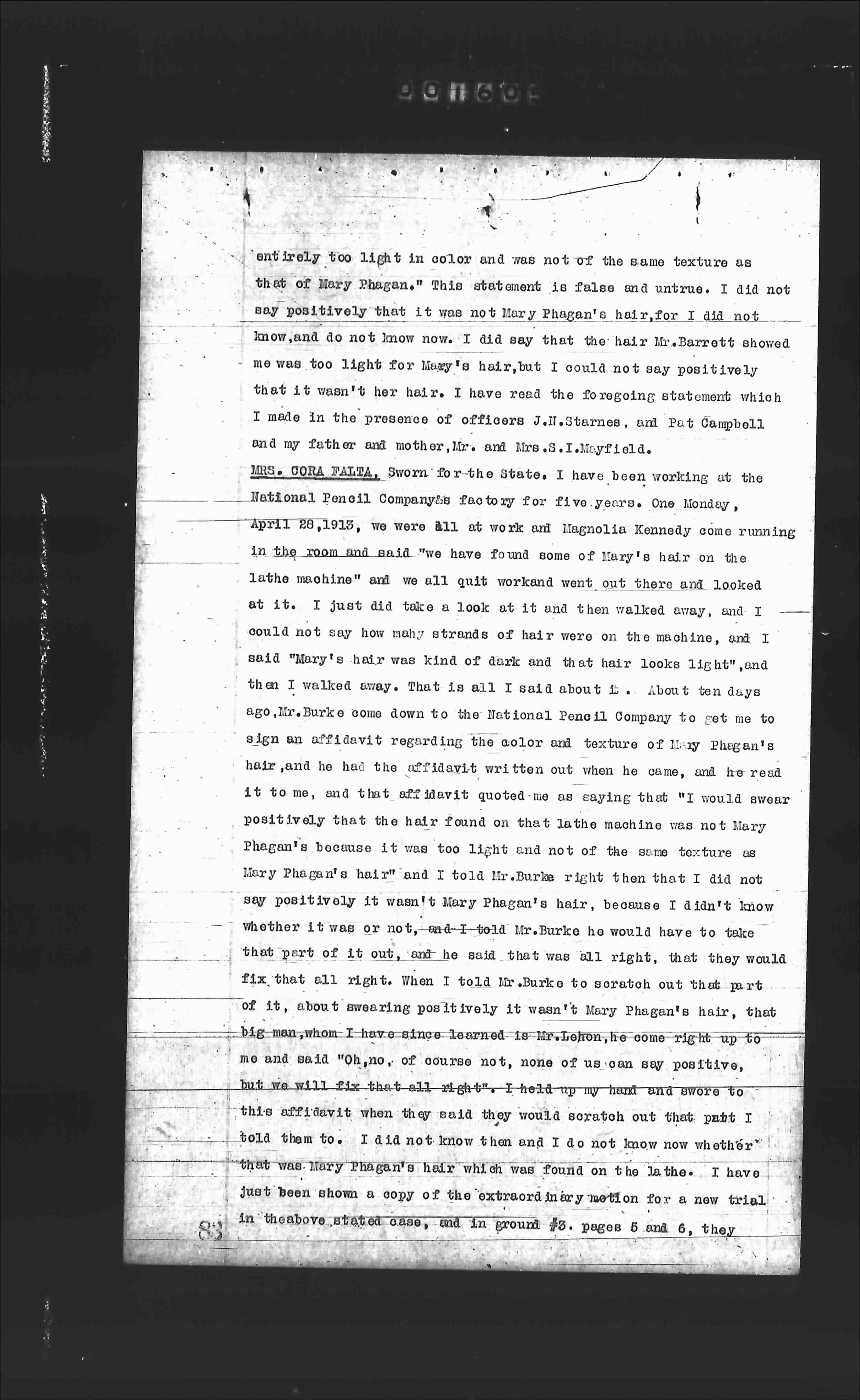MRS. CORA FALTA, Sworn for the State. I have been working at the National Pencil Company's factory for five years. One Monday, April 28, 1913, we were all at work and Magnolia Kennedy come running in the room and said "we have found some of Mary's hair on the lathe machine" and we all quit work and went out there and looked at it. I just did take a look at it and then walked away, and I could not say how many strands of hair were on the machine, and I said "Mary's hair was kind of dark and that hair looks light" and then I walked away. That is all I said about it. About ten days ago, Mr. Burke come down to the National Pencil Company to get me to sign an affidavit regarding the color and texture of Mary Phagan's hair and he had the affidavit written out when he came, and he read it to me, and that affidavit quoted me as saying that "I would swear positively that the hair found on the lathe machine was not Mary Phagan's because it was too light and not of the same texture as Mary Phagan's hair" and I told Mr. Burke right then that I did not say positively it wasn't Mary Phagan's hair, because I didn't know whether it was or not, and I told Mr. Burke he would have to take that part of it out, and he said that was all right, that they would fix that all right. When I told Mr. Burke to scratch out that part of it, about swearing positively it wasn't Mary Phagan's hair, that big man whom I have since learned is Mr. Lehon, he come right up to me and said "Oh, no, of course not, none of us can say positive, but we will fix that all right." I held up my hand and swore to this affidavit when they said they would scratch out that part I told them to. I did not know then and I do not know now whether that was Mary Phagan's hair which was found on the lathe. I have just been shown a copy of the extraordinary motion for a new trial in the above stated case, and in ground 45, pages 5 and 6, they
