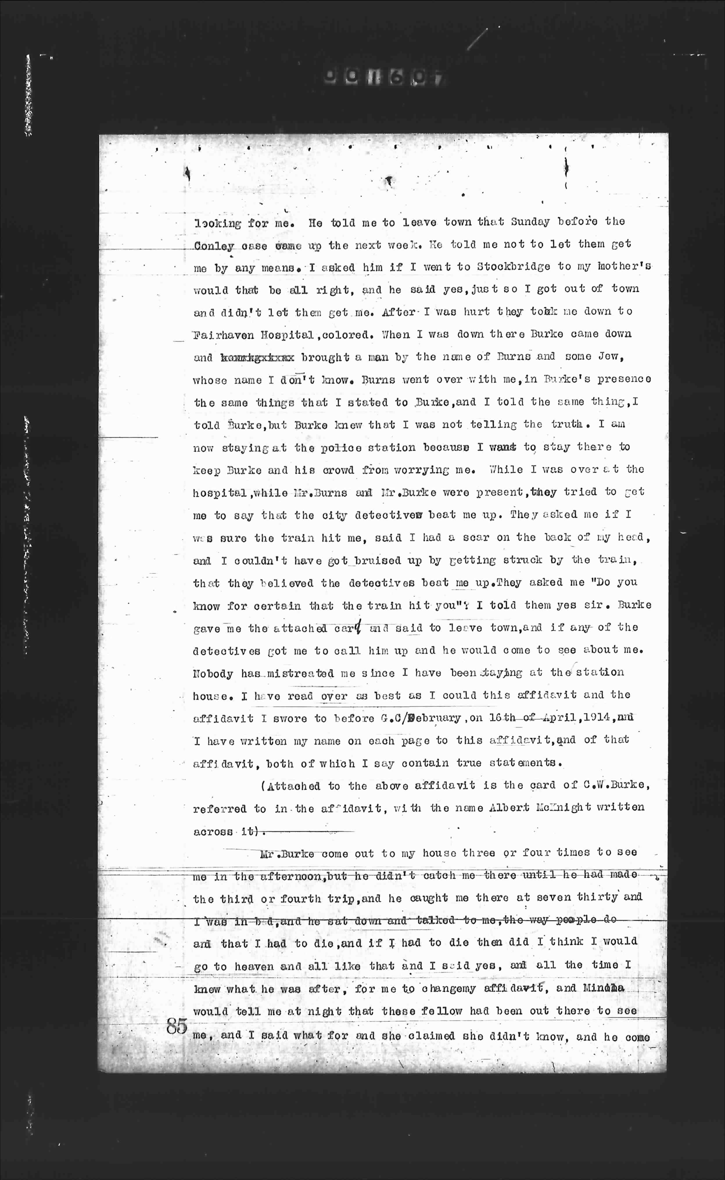 looking for me. He told me to leave town that Sunday before the Conley case came up the next week. He told me not to let them get me by any means. I asked him if I went to Stockbridge to my mother's would that be all right, and he said yes, just so I got out of town and didn't let them get me. After I was hurt they took me down to Fairhaven Hospital, colored. When I was down there Burke came down and brought a man by the name of Burns and some Jew, whose name I don't know. Burns went over with me, in Burke's presence the same things that I stated to Burke, and I told the same thing. I told Burke, but Burke knew that I was not telling the truth. I am now staying at the police station because I want to stay there to keep Burke and his crowd from worrying me. While I was over at the hospital, while Mr. Burns and Mr. Burke were present, they tried to get me to say that the officers detectives beat me up. They asked me if I was sure the train hit me, said I had a scar on the back of my head, and I couldn't have got bruised up by getting struck by the train, that they believed the detectives beat me up. They asked me "Do you know for certain that the train hit you?" I told them yes sir. Burke gave me the attached card and said to leave town, and if any of the detectives got me to call him up and he would come to see about me. Nobody has mistreated me since I have been staying at the station house. I have read over as best as I could this affidavit and the affidavit I swore to before G. W. Burey, on 16th of April, 1914, and I have written my name on each page to this affidavit, and of that affidavit, both of which I say contain true statements.