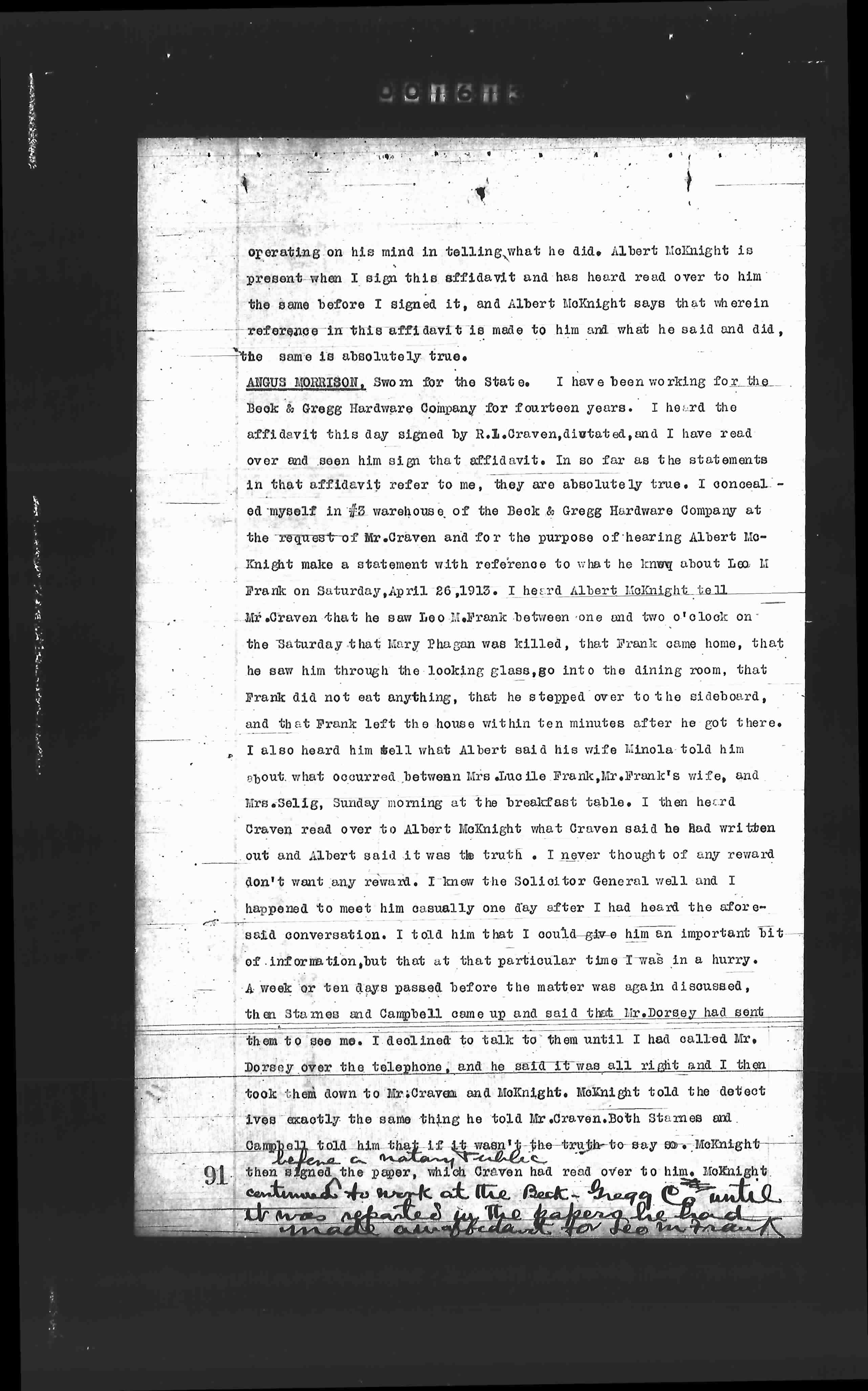 ANGUS MORRISON, sworn for the State. I have been working for the Book & Gregg Hardware Company for fourteen years. I heard the affidavit this day signed by R.L.Craven, dictated, and I have read over and seen him sign the affidavit. In so far as the statements in that affidavit refer to me, they are absolutely true. I concealed myself in the warehouse of the Book & Gregg Hardware Company at the request of Mr.Craven and for the purpose of hearing Albert McKnight make a statement with reference to what he knew about Leo M. Frank on Saturday, April 26, 1913. I heard Albert McKnight tell Mr.Craven that he saw Leo M.Frank between one and two o'clock on the Saturday that Mary Phagan was killed, that Frank came home, that he saw him through the looking glass, go into the dining room, that Frank did not eat anything, that he stepped over to the sideboard, and that Frank left the house within ten minutes after he got there. I also heard him tell what Albert said his wife Minola told him about what occurred between Mrs. Minola Frank, Mr.Frank's wife, and Mrs.Selig, Sunday morning at the breakfast table. I then heard Craven read over to Albert McKnight what Craven said he had written out and Albert said it was the truth. I never thought of any reward, don't want any reward. I know the Solicitor General well and I happened to meet him casually one day after I had heard the aforesaid conversation. I told him that I could give him an important bit of information but that at that particular time I was in a hurry. A week or ten days passed before the matter was again discussed, then 3 names and Campbell came up and said that Mr.Dorsey had sent them to see me. I declined to talk to them until I had called Mr. Dorsey over the telephone, and he said it was all right and I then took them down to Mr.Craven and McKnight. McKnight told the detectives exactly the same thing he told Mr.Craven.Both Starnes and Campbell told him that if he went the truth, to say so. McKnight then signed the paper, which Craven had read over to him. McKnight continued to work at the Book & Gregg Co. until it was affected by the papers being read.