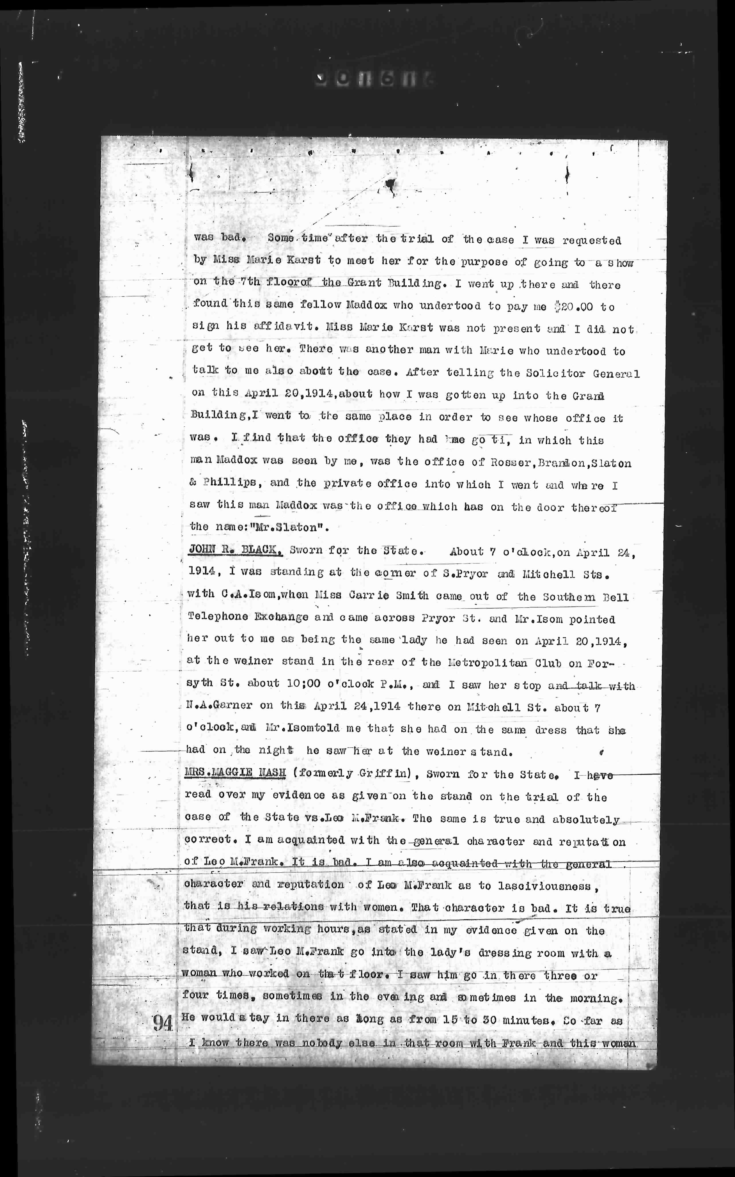 was bad. Some time after the trial of the case I was requested by Miss Marie Karst to meet her for the purpose of going to a show on the 7th floor of the Grant Building. I went up there and there found this same fellow Maddox who undertook to pay me $20.00 to sign his affidavit. Miss Marie Karst was not present and I did not get to see her. There was another man with Lurie who undertook to talk to me also about the case. After telling the Solicitor General on this April 20, 1914, about how I was gotten up into the Grant Building, I went to the same place in order to see whose office it was. I found that the office they had me go to, in which this man Maddox was seen by me, was the office of Rosser, Brandon, Slaton & Phillips, and the private office into which I went and where I saw this man Maddox was the office which has on the door thereof the name "Mr. Slaton".