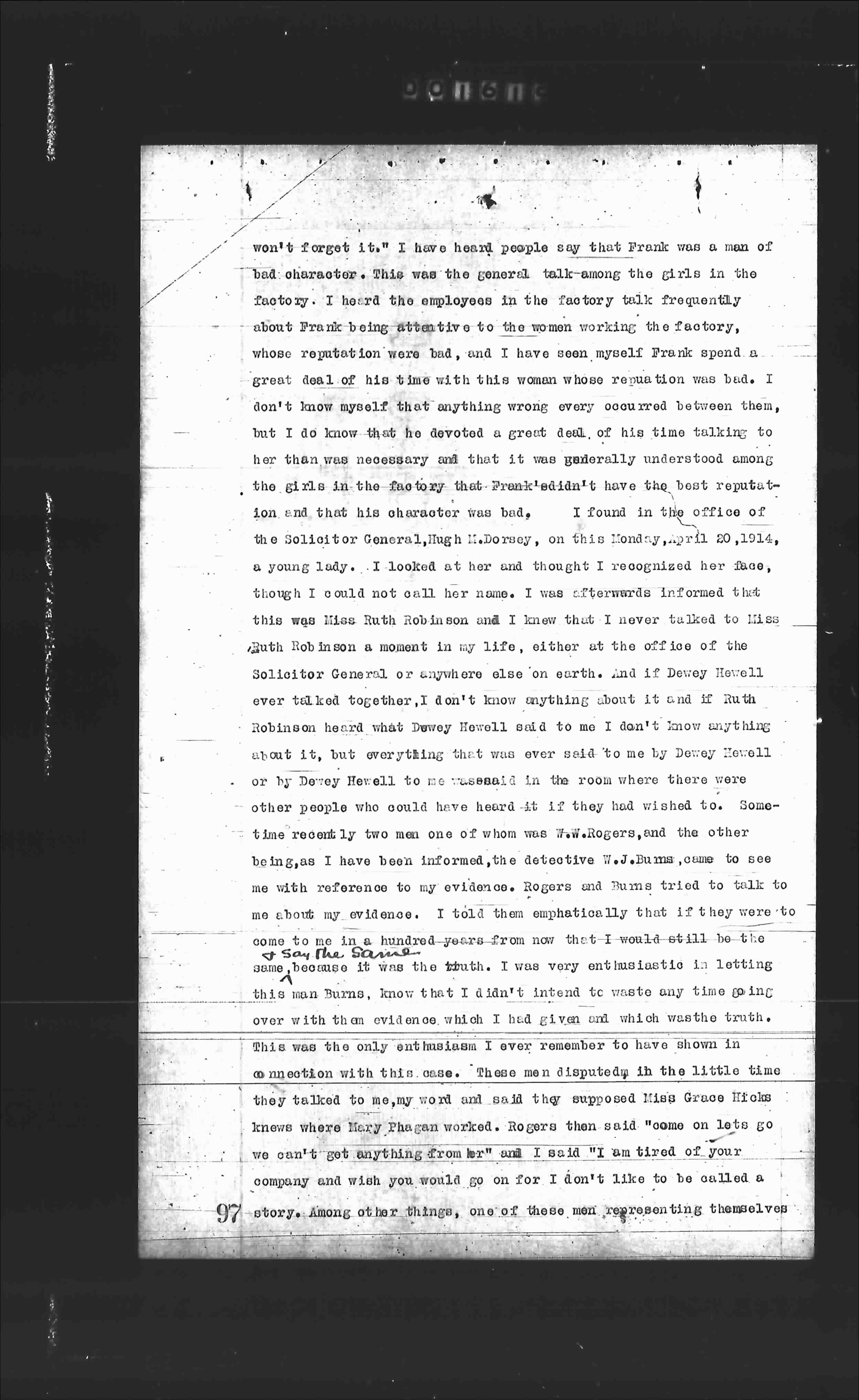 won't forget it." I have heard people say that Frank was a man of bad character. This was the general talk among the girls in the factory. I heard the employees in the factory talk frequently about Frank being attentive to the women working the factory, whose reputation were bad, and I have seen myself Frank spend a great deal of his time with this woman whose reputation was bad. I don't know myself that anything wrong every occurred between them, but I do know that he devoted a great deal of his time talking to her than was necessary and that it was generally understood among the girls in the factory that Frank didn't have the best reputation and that his character was bad. I found in the office of the Solicitor General, Hugh M. Dorsey, on this Monday, April 20, 1914, a young lady. I looked at her and thought I recognized her face, though I could not call her name. I was afterwards informed that this was Miss Ruth Robinson and I knew that I never talked to Miss Ruth Robinson a moment in my life, either at the office of the Solicitor General or anywhere else on earth. And if Dewey Hewell ever talked together, I don't know anything about it and if Ruth Robinson heard what Dewey Hewell said to me I don't know anything about it, but everything that was ever said to me by Dewey Hewell or by Dewey Hewell to me was said in the room where there were other people who could have heard it if they had wished to. Sometime recently two men, one of whom was W. W. Rogers, and the other being as I have been informed, the detective W. J. Burns, came to see me with reference to my evidence. Rogers and Burns tried to talk to me about my evidence. I told them emphatically that if they were to come to me in a hundred years from now that I would still be the same because it was the truth. I was very enthusiastic in telling this man Burns, how that I didn't intend to waste any time going over with him evidence which I had given and which was the truth. This was the only enthusiasm I ever remember to have shown in connection with this case. These men disputed the little time they talked to me, my word and said they supposed Miss Grace Hicks knew where Mary Phagan worked. Rogers then said "come on lets go we can't get anything from her" and I said "I am tired of your company and wish you would go on for I don't like to be called a 97 story. Among other things, one of these men representing themselves