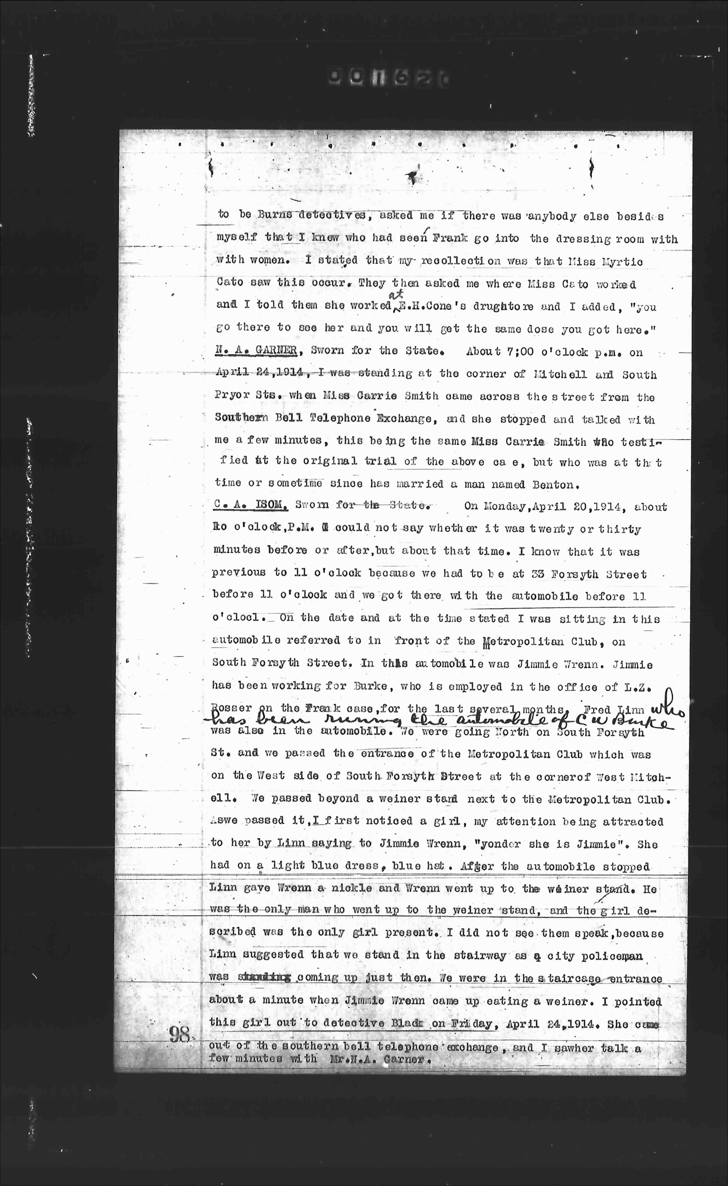 C. A. ISOM, Sworn for the State. On Monday, April 20, 1914, about 10 o'clock, P.M. I could not say whether it was twenty or thirty minutes before or after, but about that time. I know that it was previous to 11 o'clock because we had to be at 13 Forsyth Street before 11 o'clock and we got there with the automobile before 11 o'clock. On the date and at the time stated I was sitting in this automobile referred to in front of the Metropolitan Club, on South Forsyth Street. In this automobile was Jimmie Wrenn. Jimmie has been working for Burke, who is employed in the office of L. Z. Rosser on the Frank case, for the past several months. Fred Linn who was also in the automobile, we were going north on South Forsyth St. and we passed the entrance of the Metropolitan Club which was on the West side of South Forsyth Street at the corner of West Mitchell. We passed beyond a weiner stand next to the Metropolitan Club. As we passed it, I first noticed a girl, my attention being attracted to her by Linn saying to Jimmie Wrenn, "Yonder she is Jimmie". She had on a light blue dress, blue hat. After the automobile stopped Linn gave Wrenn a nickel and Wrenn went up to the weiner stand. He was the only man who went up to the weiner stand, and the girl described was the only girl present. I did not see them speak, because Linn suggested that we stand in the stairway as a city policeman was coming up just then. We were in the tailor's entrance about a minute when Jimmie Wrenn came up eating a weiner. I pointed this girl out to detective Black on Friday, April 24, 1914. She came out of the Southern Bell telephone exchange, and I saw her talk a few minutes with Mr. H. A. Garner.