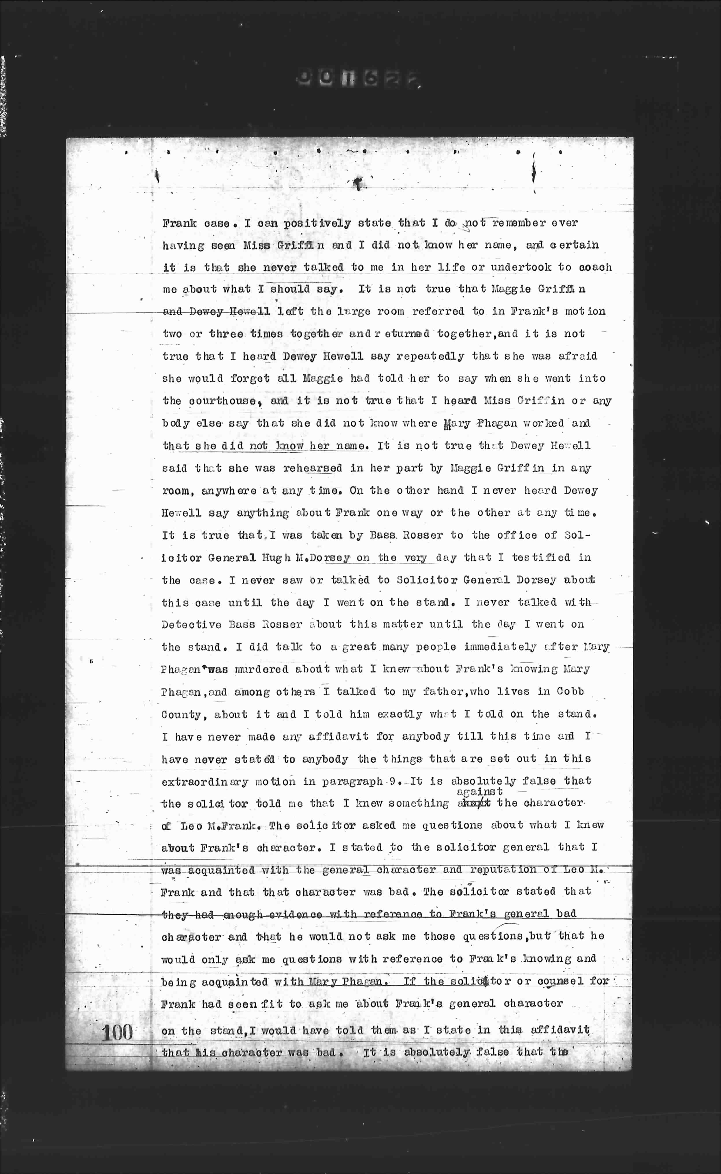 Frank case. I can positively state that I do not remember ever having seen Miss Griffin and I did not know her name, and certain it is that she never talked to me in her life or undertook to coach me about what I should say. It is not true that Maggie Griffin and Dewey Howell left the large room referred to in Frank's motion two or three times together and returned together, and it is not true that I heard Dewey Howell say repeatedly that she was afraid she would forget all Maggie had told her to say when she went into the courthouse, and it is not true that I heard Miss Griffin or anybody else say that she did not know where Mary Phagan worked and that she did not know her name. It is not true that Dewey Howell said that she was rehearsed in her part by Maggie Griffin in any room, anywhere at any time. On the other hand I never heard Dewey Howell say anything about Frank one way or the other at any time. It is true that I was taken by Bass Rosser to the office of Solicitor General Hugh M.Dorsey on the very day that I testified in the case. I never saw or talked to Solicitor General Dorsey about this case until the day I went on the stand. I never talked with Detective Bass Rosser about this matter until the day I went on the stand. I did talk to a great many people immediately after Mary Phagan was murdered about what I knew about Frank's knowing Mary Phagan, and among others I talked to my brother, who lives in Cobb County, about it and I told him exactly what I told on the stand. I have never made any affidavit for anybody till this time and I have never stated to anybody the things that are set out in this extraordinary motion in paragraph 9. It is absolutely false that the solicitor told me that I knew something against the character of Leo M.Frank. The solicitor asked me questions about what I knew about Frank's character. I stated to the solicitor general that I was acquainted with the general character and reputation of Leo M. Frank and that that character was bad. The solicitor stated that they had enough evidence with reference to Frank's general bad character and that he would not ask me those questions, but that he would only ask me questions with reference to Frank's knowing and being acquainted with Mary Phagan. If the solicitor or counsel for Frank had seen fit to ask me about Frank's general character on the stand, I would have told them as I state in this affidavit that his character was bad. It is absolutely false that the