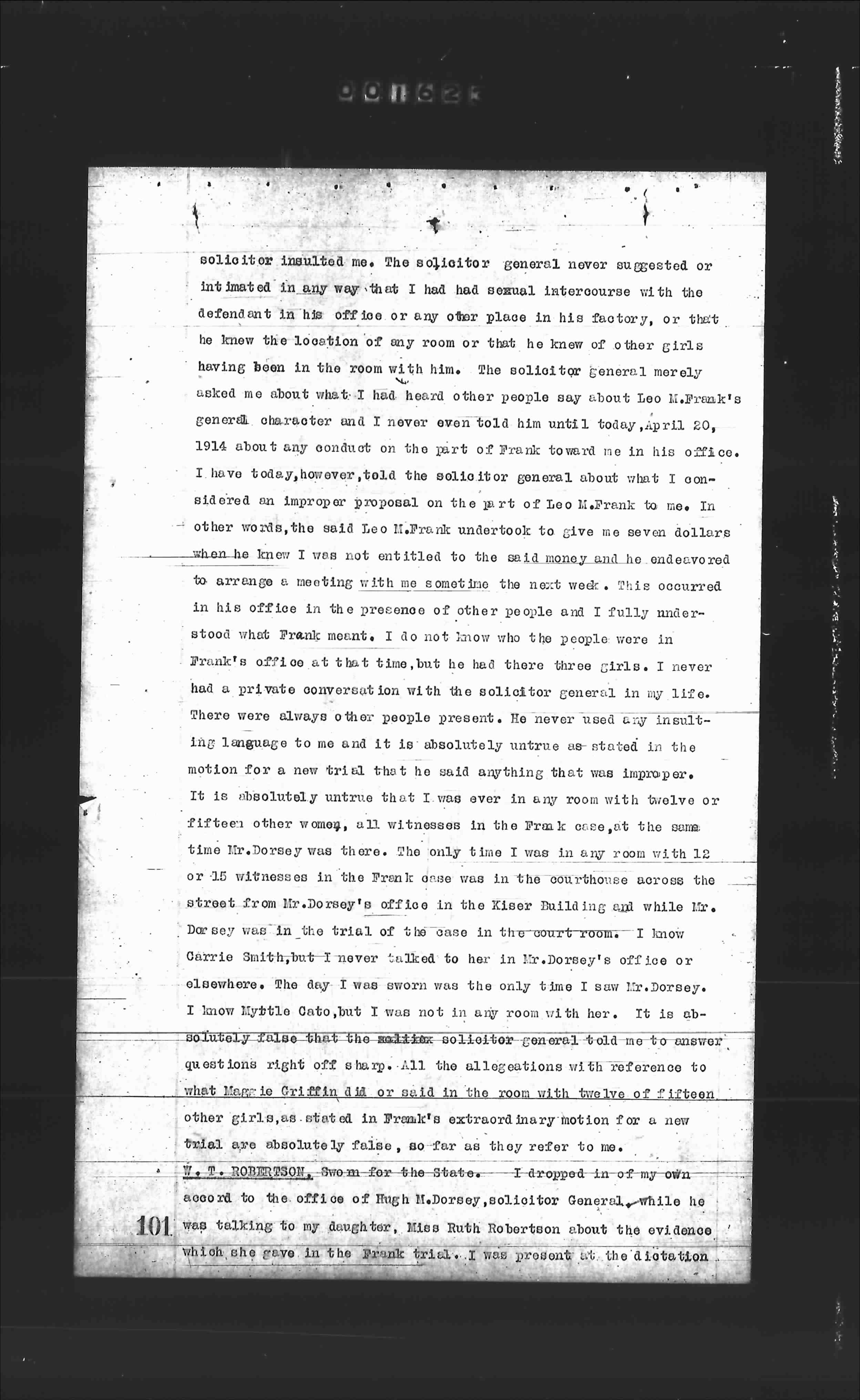solicitor insulted me. The solicitor general never suggested or intimated in any way that I had had sexual intercourse with the defendant in his office or any other place in his factory, or that he knew the location of any room or that he knew of other girls having been in the room with him. The solicitor general merely asked me about what I had heard other people say about Leo M.Frank's general character and I never even told him until today, April 20, 1914 about any conduct on the part of Frank toward me in his office. I have today, however, told the solicitor general about what I considered an improper proposal on the part of Leo M.Frank to me. In other words, he said Leo M.Frank undertook to give me seven dollars when he knew I was not entitled to the said money and he endeavored to arrange a meeting with me sometime the next week. This occurred in his office in the presence of other people and I fully understood what Frank meant. I do not know who the people were in Frank's office at that time, but he had there three girls. I never had a private conversation with the solicitor general in my life. There were always other people present. He never used any insulting language to me and it is absolutely untrue as stated in the motion for a new trial that he said anything that was improper. It is absolutely untrue that I was ever in any room with twelve or fifteen other women, all witnesses in the Frank case, at the same time Mr.Dorsey was there. The only time I was in any room with 12 or 15 witnesses in the Frank case was in the courthouse across the street from Mr.Dorsey's office in the Kaiser Building and while Mr. Dorsey was in the trial of the case in the courtroom. I know Carrie Smith, but I never talked to her in Mr.Dorsey's office or elsewhere. The day I was sworn was the only time I saw Mr.Dorsey. I know Myrtle Cato, but I was not in any room with her. It is absolutely false that the solicitor general told me to answer questions right off sharp. All the allegations with reference to what Mrs. E.Griffin did or said in the room with twelve or fifteen other girls, as stated in Frank's extraordinary motion for a new trial are absolutely false, so far as they refer to me.