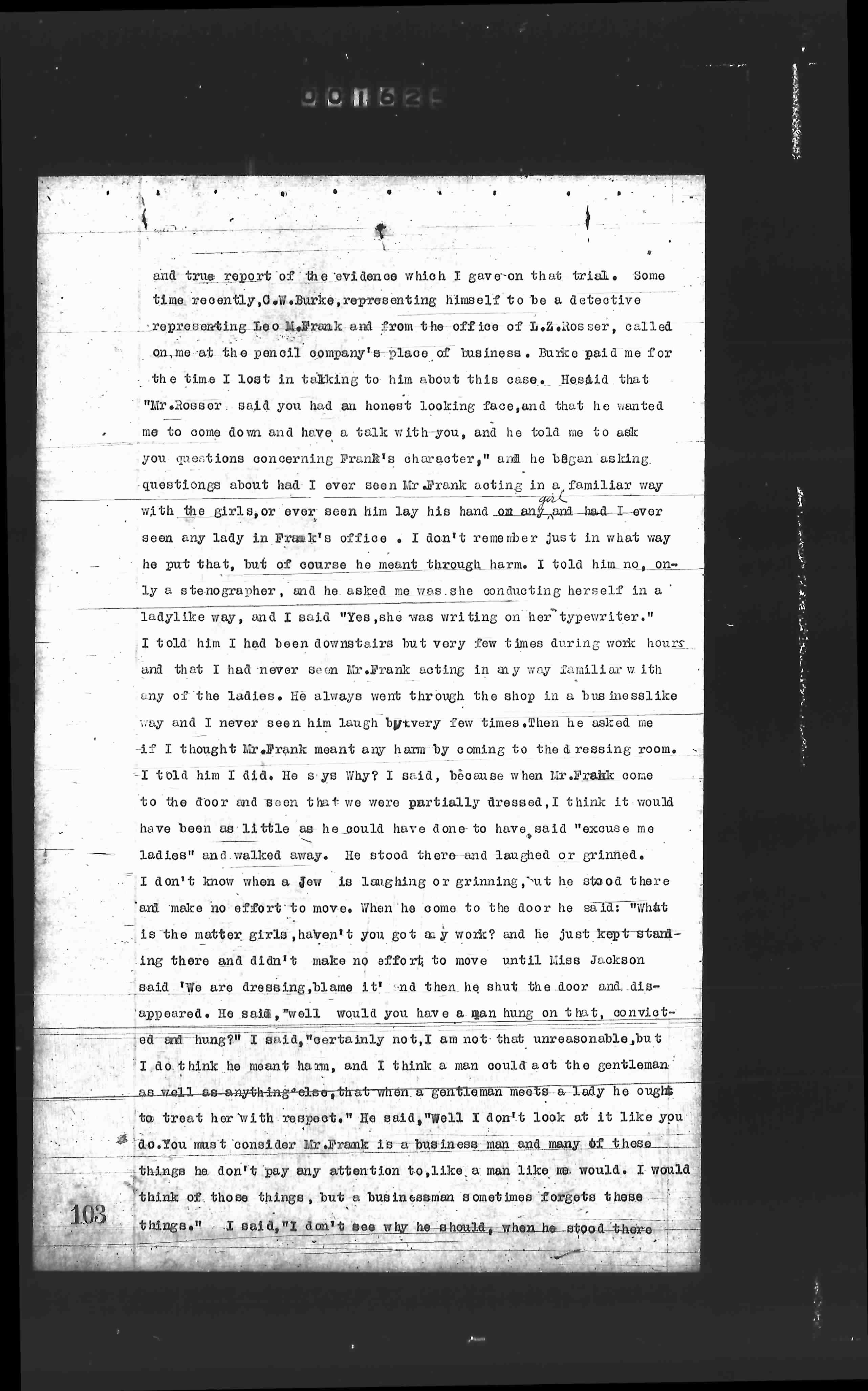 and true report of the evidence which I gave on that trial. Some time recently, C.W.Burke, representing himself to be a detective representing Leo M.Frank and from the office of L.Z.Rosser, called on me at the pencil company's place of business. Burke paid me for the time I lost in talking to him about this case. He said that Mr.Rosser said you had an honest looking face and that he wanted me to come down and have a talk with you, and he told me to ask you questions concerning Frank's character." And he began asking questions about had I ever seen Mr.Frank acting in a familiar way with the girls, or ever seen him lay his hand on any, and had I ever seen any lady in Frank's office. I don't remember just in what way he put that, but of course he meant through harm. I told him no, only a stenographer, and he asked me was she conducting herself in a ladylike way, and I said "Yes, she was writing on her typewriter." I told him I had been downstairs but very few times during work hours and that I had never seen Mr.Frank acting in any way familiar with any of the ladies. He always went through the shop in a businesslike way and I never seen him laugh by way for times. Then he asked me if I thought Mr.Frank meant any harm by coming to the dressing room. I told him I did. He says why? I said, because when Mr.Frank come to the door and seen that we were partially dressed, I think it would have been as little as he could have done. Then he said "excuse me ladies" and walked away. He stood there and laughed or grinned. I don't know when a Jew is laughing or grinning, but he stood there and made no effort to move. When he come to the door he said: "What is the matter girls, haven't you got a job yet?" and he just kept standing there and didn't make no effort to move until Miss Jackson said "We are dressing, blame it" and then he shut the door and disappeared. He said, "Well, would you have me hang on that, convicted and hung?" I said, "certainly not; I am not that unreasonable, but I do think he meant harm, and I think a man could act the gentleman as well as anything else, that when a gentleman meets a lady he ought to treat her with respect." He said, "Well, I don't look at it like you do. You must consider Mr.Frank is a business man and many of these things he don't pay any attention to, like a man like me would. I would think of those things, but a businessman sometimes forgets these things." I said, "I don't see why he should, when he stood there