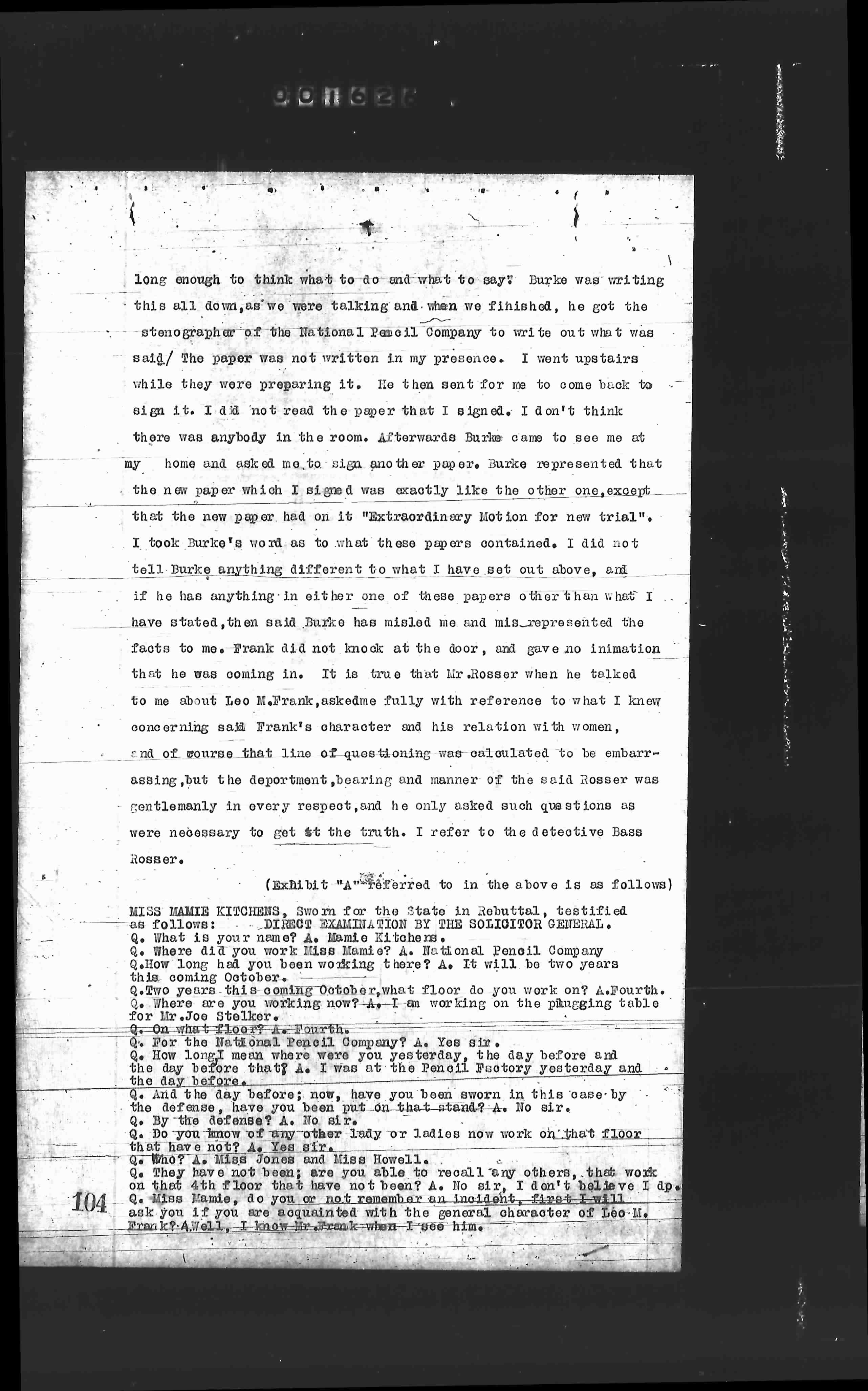 long enough to think what to do and what to say. Burke was writing this all down, as we were talking and when we finished, he got the stenographer of the National Pencil Company to write out what was said. The paper was not written in my presence. I went upstairs while they were preparing it. He then sent for me to come back to sign it. I did not read the paper after that I signed. I don't think there was anybody in the room. Afterwards Burke came to see me at my home and asked me to sign another paper. Burke represented that the new paper which I signed was exactly like the other one, except that the new paper had on it "extraordinary Motion for new trial". I took Burke's word as to what these papers contained. I did not tell Burke anything different to what I have set out above, and if he has anything in either one of these papers other than what I have stated, then said Burke has misled me and misrepresented the facts to me. Frank did not knock at the door, and gave no intimation that he was coming in. It is true that Mr. Rosser when he talked to me about Leo M. Frank, asked me fully with reference to what I knew concerning said Frank's character and his relation with women, and of course that line of questioning was calculated to be embarrassing, but the deportment, bearing and manner of the said Rosser was gentlemanly in every respect, and he only asked such questions as were necessary to get at the truth. I refer to the detective Bass Rosser.