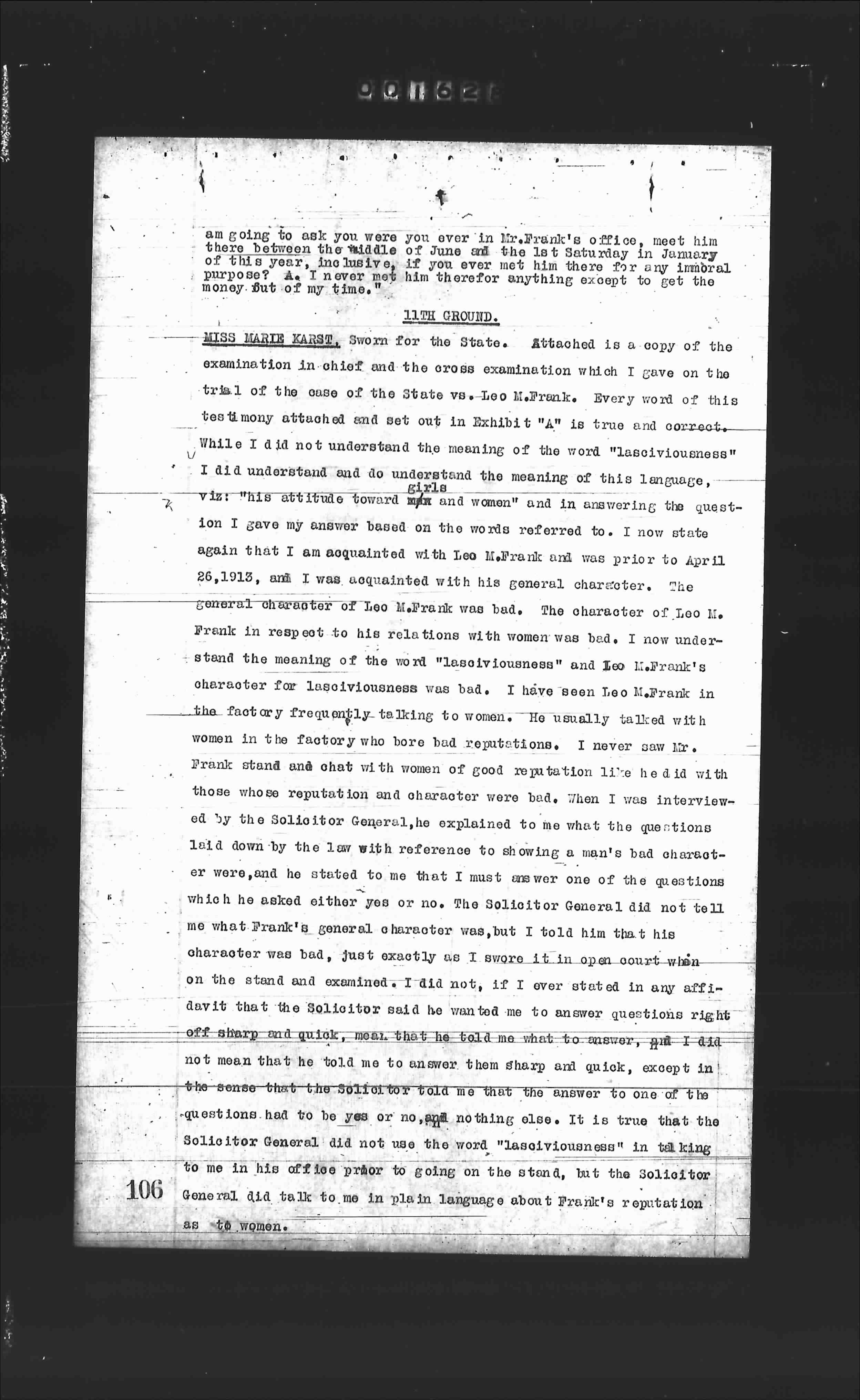 While I did not understand the meaning of the word "lasciviousness" I did understand and do understand the meaning of this language, viz: "his attitude toward girls and women" and in answering the question I gave my answer based on the words referred to. I now state again that I am acquainted with Leo M.Frank and was prior to April 26, 1913, and I was acquainted with his general character. The general character of Leo M.Frank was bad. The character of Leo M. Frank in respect to his relations with women was bad. I now understand the meaning of the word "lasciviousness" and Leo M.Frank's character for lasciviousness was bad. I have seen Leo M.Frank in the factory frequently talking to women. He usually talked with women in the factory who bore bad reputations. I never saw Mr. Frank stand and chat with women of good reputation like he did with those whose reputation and character were bad. When I was interviewed by the Solicitor General, he explained to me what the questions laid down by the law with reference to fixing a man's bad character were, and he asked me that I must answer one of the questions which he asked either yes or no. The Solicitor General did not tell me what Frank's general character was, but I told him that his character was bad, just exactly as I swore it in open court when on the stand and examined. I did not, if I ever stated in any affidavit that the Solicitor said he wanted me to answer questions right off sharp and quick, mean that he told me what to answer, but I did not mean that he told me to answer them sharp and quick, except in the sense that the Solicitor told me that the answer to one of the questions had to be yes or no, and nothing else. It is true that the Solicitor General did not use the word "lasciviousness" in talking to me in his office prior to going on the stand, but the Solicitor General did talk to me in plain language about Frank's reputation as to women.