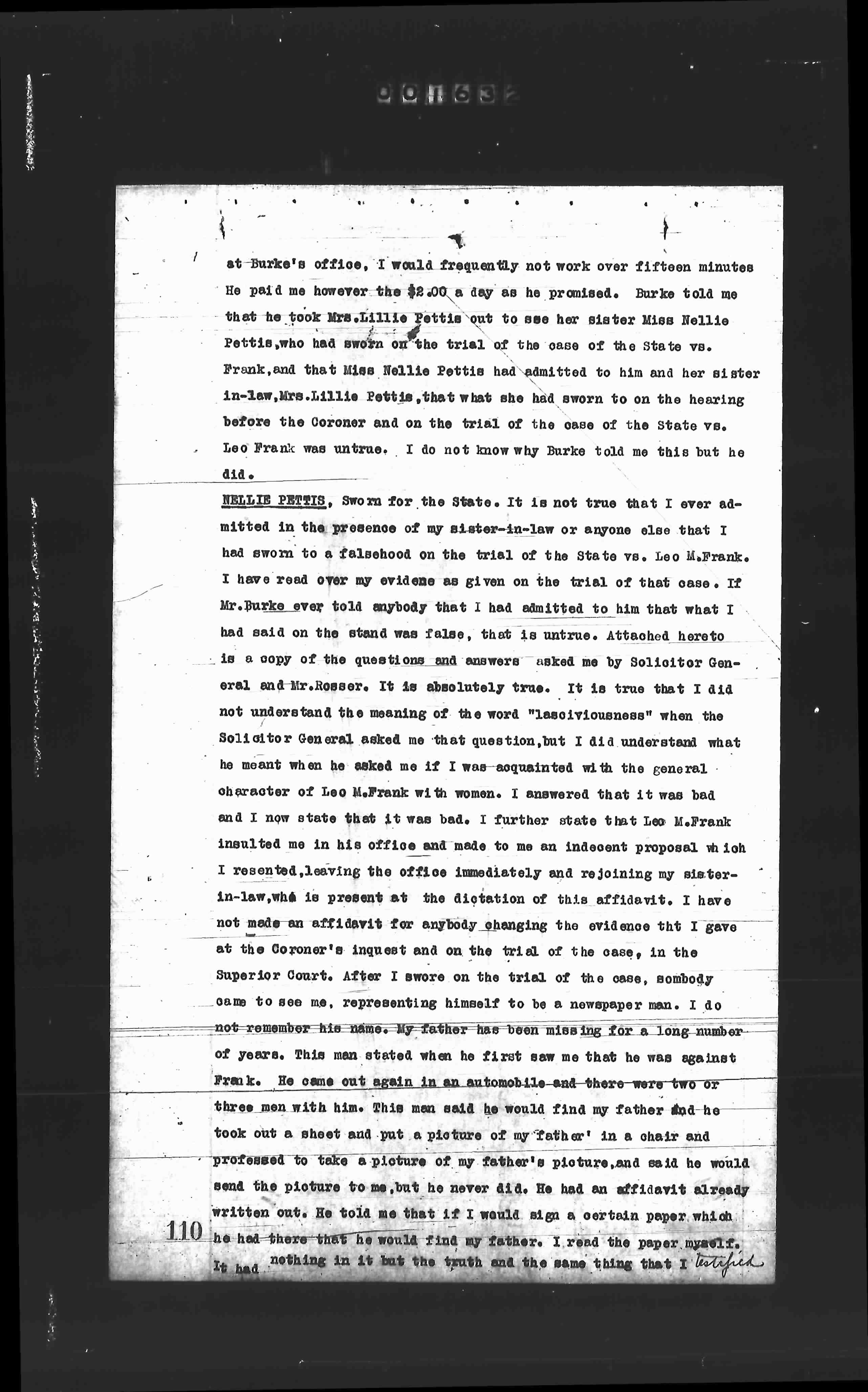 NELLIE PETTIS. Sworn for the State. It is not true that I ever admitted in the presence of my sister-in-law or anyone else that I had sworn to a falsehood on the trial of the State vs. Leo M.Frank. I have read over my evidence as given on the trial of that case. If Mr.Burke ever told anybody that I had admitted to him that what I had said on the stand was false, that is untrue. Attached hereto is a copy of the questions and answers asked me by Solicitor General and Mr.Rosser. It is absolutely true. It is true that I did not understand the meaning of the word "lasciviousness" when the Solicitor General asked me that question,but I did understand what he meant when he asked me if I was acquainted with the general character of Leo M.Frank with women. I answered that it was bad and I now state that it was bad. I further state that Leo M.Frank insulted me in his office and made me an indecent proposal which I resented,leaving the office immediately and rejoining my sister-in-law,who is present at the dictation of this affidavit. I have not made an affidavit for anybody changing the evidence that I gave at the Coroner's inquest and on the trial of the case, in the Superior Court. After I swore on the trial of the case, somebody came to see me, representing himself to be a newspaper man. I do not remember his name. My father has been missing for a long number of years. This man stated when he first saw me that he was against Frank. He came out again in an automobile and there were two or three men with him. This man said he would find my father and he took out a sheet and put a picture of my father in a chair and proposed to take a picture of my father's picture,and said he would send the picture to me,but he never did. He had an affidavit already written out. He told me that if I would sign a certain paper which he had there that he would find my father. I read the paper myself. It had nothing in it but the truth and the same thing that I testified.