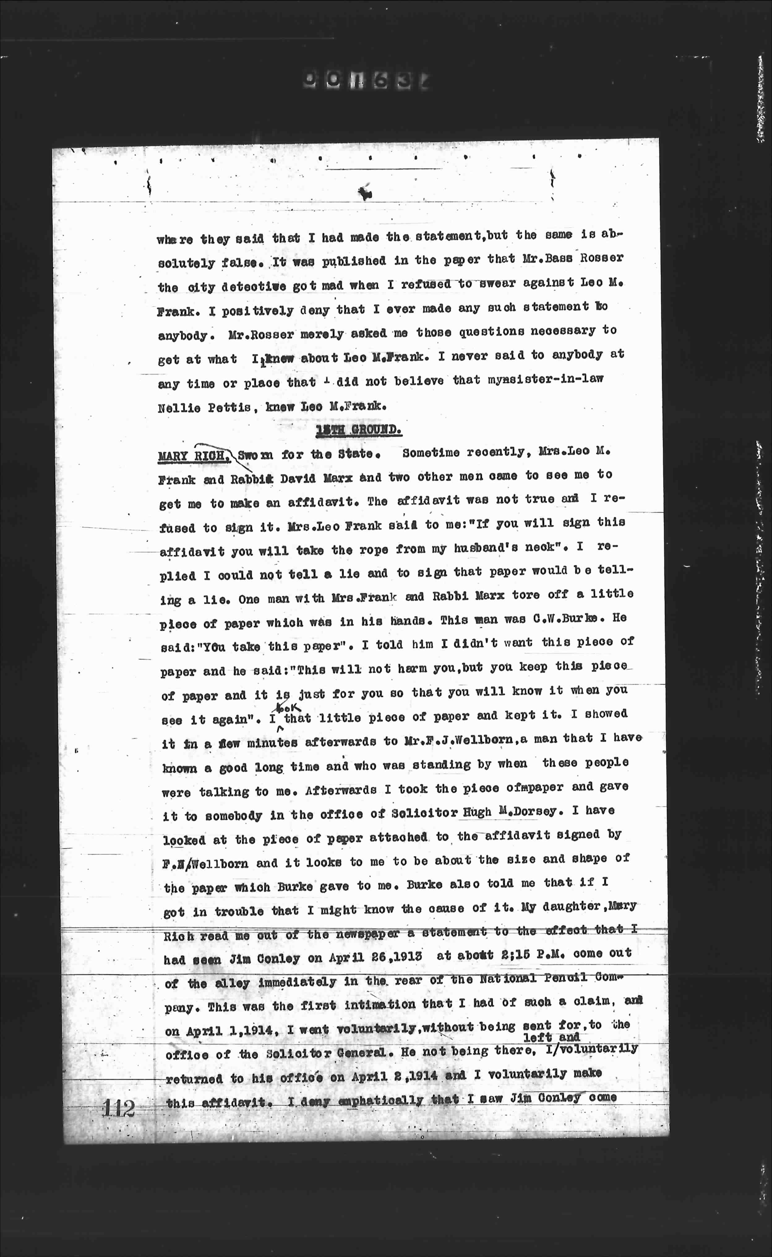 MARY RICH, Sworn for the State. Sometime recently, Mrs.Leo M. Frank and Rabbi David Marx and two other men came to see me to get me to make an affidavit. The affidavit was not true and I refused to sign it. Mrs.Leo Frank said to me: "If you will sign this affidavit you will take the rope from my husband's neck". I replied I could not tell a lie and to sign that paper would be telling a lie. One man with Mrs.Frank and Rabbi Marx tore off a little piece of paper which was in his hands. This man was C.W.Burns. He said: "You take this paper". I told him I didn't want this piece of paper and he said: "This will not harm you,but you keep this piece of paper and it is just for you so that you will know it when you see it again". I took that little piece of paper and kept it. I showed it in a few minutes afterwards to Mr. F. P. Wellborn, a man that I have known a good long time and who was standing by when these people were talking to me. Afterwards I took the piece of paper and gave it to somebody in the office of Solicitor Hugh M.Dorsey. I have looked at the piece of paper attached to the affidavit signed by F. P. Wellborn and it looks to me to be about the size and shape of the paper which Burke gave to me. Burke also told me that if I got in trouble that I might know the cause of it. My daughter,Mary Rich read me out of the newspaper a statement to the effect that I had seen Jim Conley on April 26,1913 at about 1:15 P.M. come out of the alley immediately in the rear of the National Pencil Company. This was the first intimation that I had of such a claim, and on April 1,1914, I went voluntarily,without being sent for, to the office of the Solicitor General. He not being there, I voluntarily returned to his office on April 2,1914 and I voluntarily made this affidavit. I deny emphatically that I saw Jim Conley come
