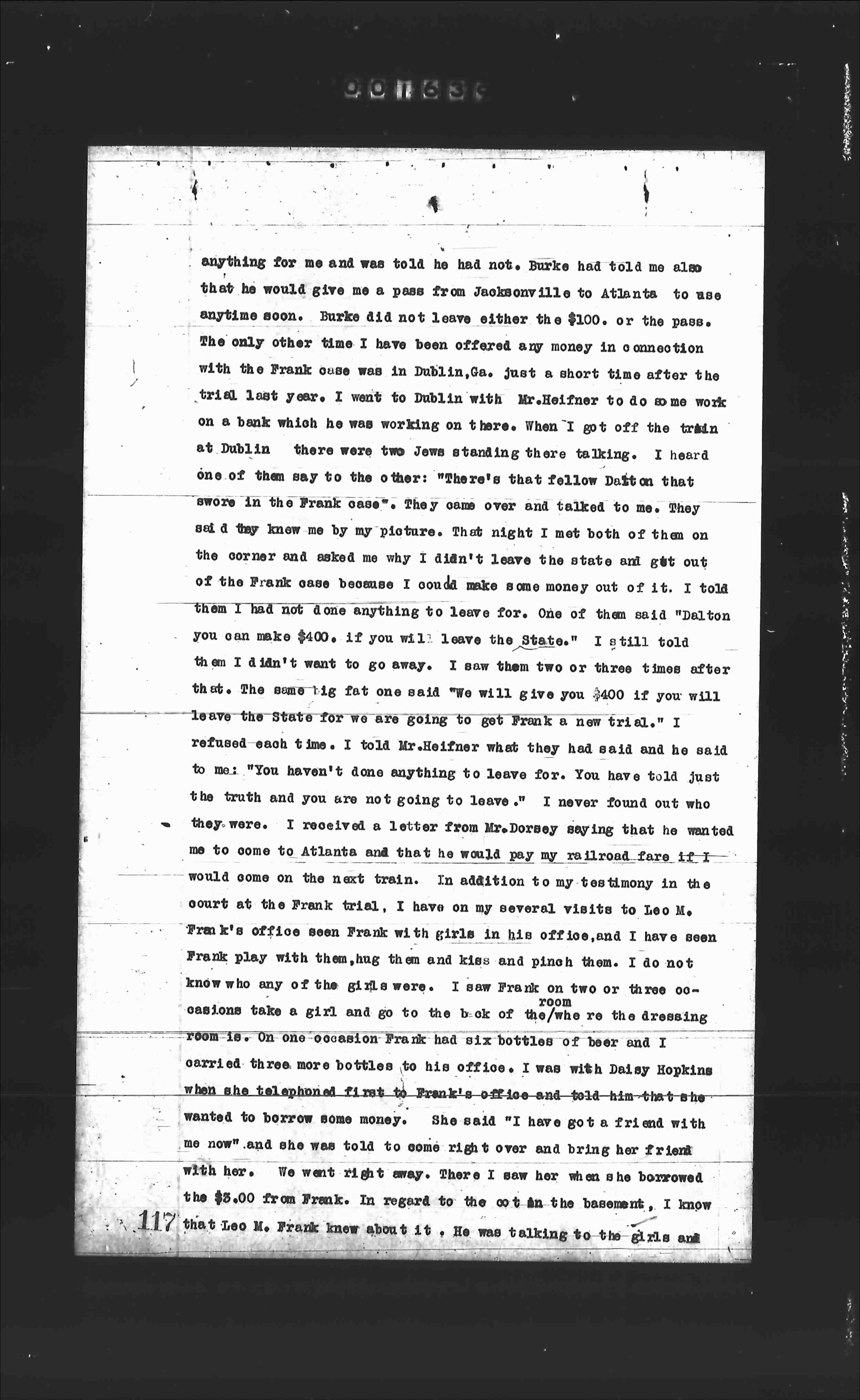 anything for me and was told he had not. Burke had told me also that he would give me a pass from Jacksonville to Atlanta to use anytime soon. Burke did not leave either the $100. or the pass. The only other time I have been offerew any money in connection with the Frank case was in Dublin, Ga. Just a short time after the trial last year, I went to Dublin with Mr. Heifner to do some work on a bank which he was working on here. When I got off the train at Dublin there were two Jews standing there talking. I heard one of them say to the other: "There's that fellow Dalton that swore in the Frank case". They came over and talked to me. They said they knew me by my picture. That night I met both of them on the corner and asked me why I didn't leave the state and get out of the Frank case because I could make some money out of it. I told them I had not done anything to leave for. One of them said "Dalton you can make $400. if you will leave the State." I still told them I didn't want to go away. I saw them two or three times after that. The same big fat one said "We will give you $400 if you will leave the State for we are going to get Frank a new trial." I refused each time. I told Mr. Heifner what they had said and he said to me: "You haven't done anything to leave for. You have told just the truth and you are not going to leave." I never found out who they were. I received a letter from Jim Conley saying that he wanted me to come to Atlanta and that he would pay my railroad fare if I would come on the next train. In addition to my testimony in the court at the Frank trial, I have on my several visits to Leo M. Frank's office seen Frank with girls in his office, and I have seen Frank play with them, hug them and kiss on them. I do not know who any of the girls were. I saw Frank on two or three occasions take a girl and go to the back of the room where the dressing room is. On one occasion Frank had six bottles of beer and I carried three more bottles to his office. I was with Daisy Hopkins when she telephoned first to Frank's office and told him that she wanted to borrow some money. She said "I have got a friend with me now" and she was told to come right over and bring her friend with her. We went right away. There I saw her when she borrowed the $5.00 from Frank. In regard to the cot in the basement, I know that Leo M. Frank knew about it. He was talking to the girls and