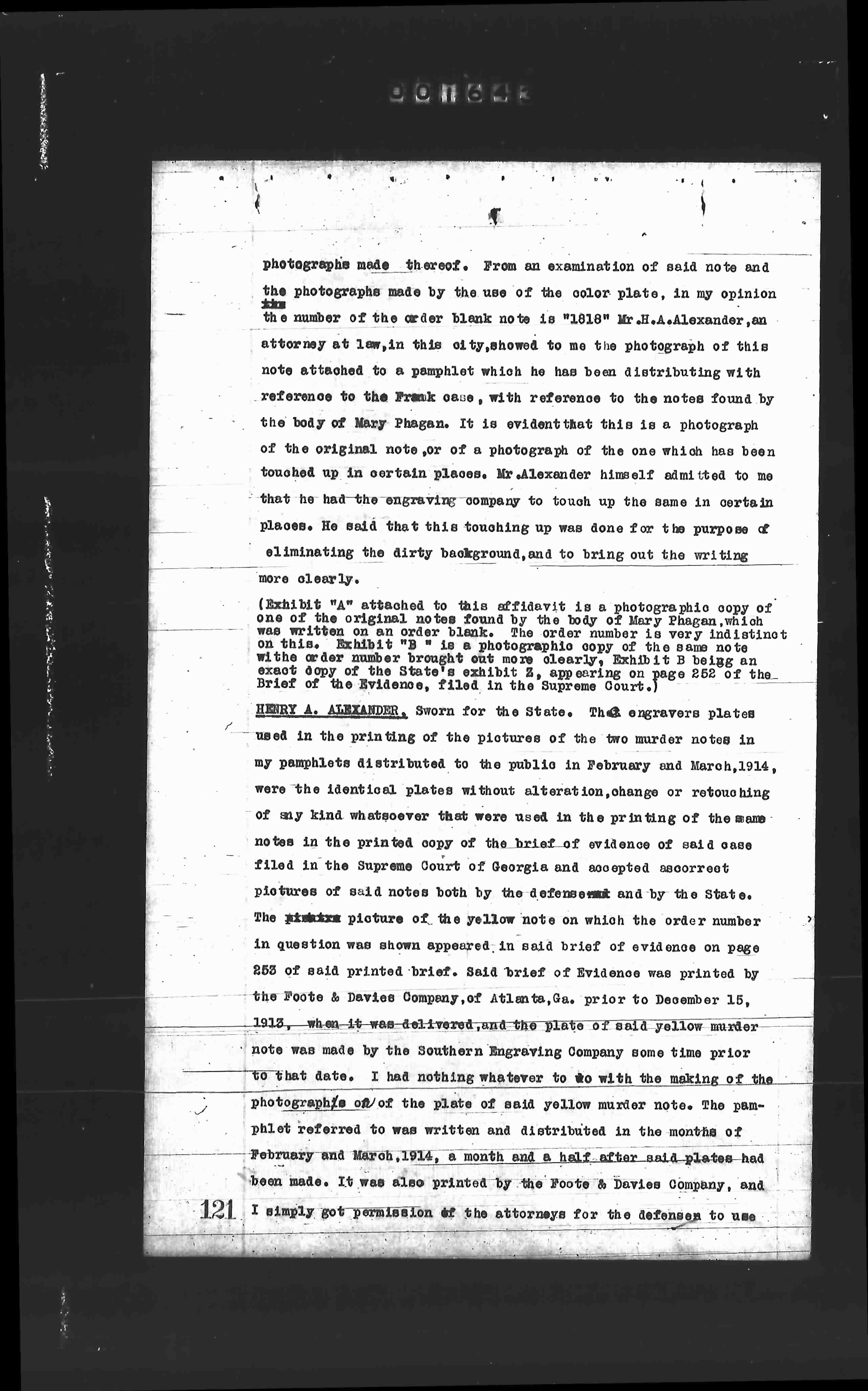 HENRY A. ALEXANDER, Sworn for the State. The engravers plates used in the printing of the pictures of the two murder notes in my pamphlets distributed to the public in February and March, 1914, were the identical plates without alteration, change or retouching of any kind whatsoever that were used in the printing of the same notes in the printed copy of the brief of evidence of said case filed in the Supreme Court of Georgia and accepted as correct pictures of said notes both by the defense and by the State. The picture of the yellow note on which the order number in question was shown appeared in said brief of evidence on page 253 of said printed brief. Said brief of Evidence was printed by the Foote & Davies Company, of Atlanta, Ga. prior to December 15, 1913, when it was delivered, and the plate of said yellow murder note was made by the Southern Engraving Company some time prior to that date. I had nothing whatever to do with the making of the photographs or of the plate of said yellow murder note. The pamphlet referred to was written and distributed in the months of February and March, 1914, a month and a half after said plates had been made. It was also printed by the Foote & Davies Company, and I simply got permission of the attorneys for the defense to use