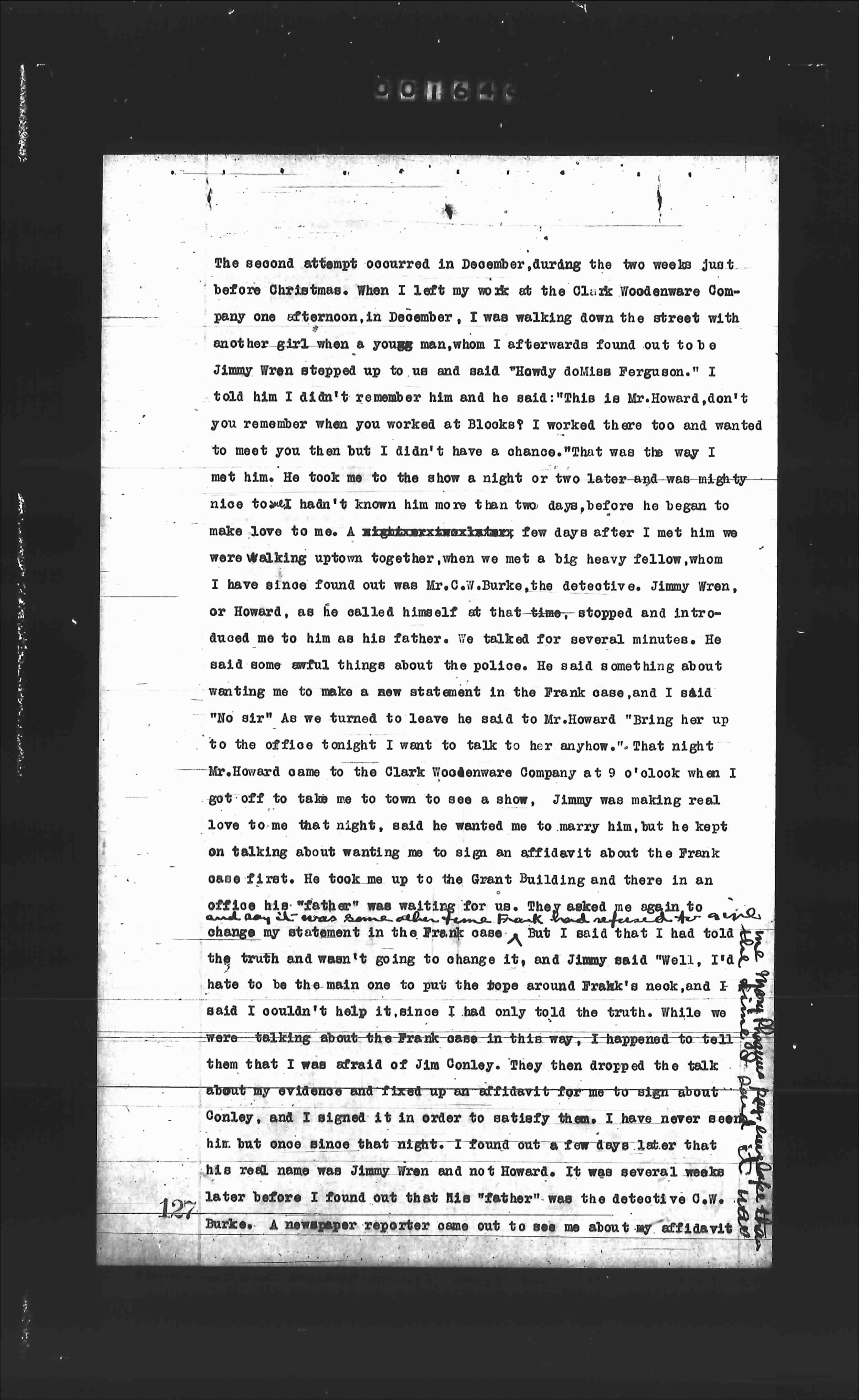 The second attempt occurred in December, during the two weeks just before Christmas. When I left my work at the Clark Woodenware Company one afternoon in December, I was walking down the street with another girl, when a young man, whom I afterwards found out to be Jimmy Wren stepped up to us and said: "Why don't you remember me Miss Ferguson." I told him I didn't remember him and he said: "This is Mr.Howard, don't you remember when you worked at Bloakes? I worked there too and wanted to meet you then but I didn't have a chance. That was the way I met him. He took me to the show a night or two later and was mighty nice to me. I hadn't known him more than two days, before he began to make love to me. A few days after I met him we were walking uptown together, when we met a big heavy fellow, whom I have since found out was Mr.C.W.Burke, the detective. Jimmy Wren, or Howard, as he called himself at that time, stopped and introduced me to him as his father. We talked for several minutes. He said some awful things about the police. He said something about wanting me to make a new statement in the Frank case, and I said "No sir." As we turned to leave he said to Mr.Howard "Bring her up to the office tonight I want to talk to her anyhow." That night Mr.Howard came to the Clark Woodenware Company at 9 o'clock when I got off to take me to town to see a show. Jimmy was making real love to me that night, said he wanted me to marry him, but he kept on talking about wanting me to sign an affidavit about the Frank case first. He took me up to the Grant Building and there in an office his "father" was waiting for us. They asked me again to change my statement in the Frank case, but I said that I had told the truth and wasn't going to change it, and Jimmy said "Well, I'd hate to be the man one to put the rope around Frank's neck, and I said I couldn't help it, since I had only told the truth. While we were talking about the Frank case in this way, I happened to tell them that I was afraid of Jim Conley. They then dropped the talk about my evidence and fixed up an affidavit for me to sign about Conley, and I signed it in order to satisfy them. I have never seen him but once since that night. I found out a few days later that his real name was Jimmy Wren and not Howard. It was several weeks later before I found out that his "father" was the detective C.W. Burke. A newspaper reporter came out to see me about my affidavit