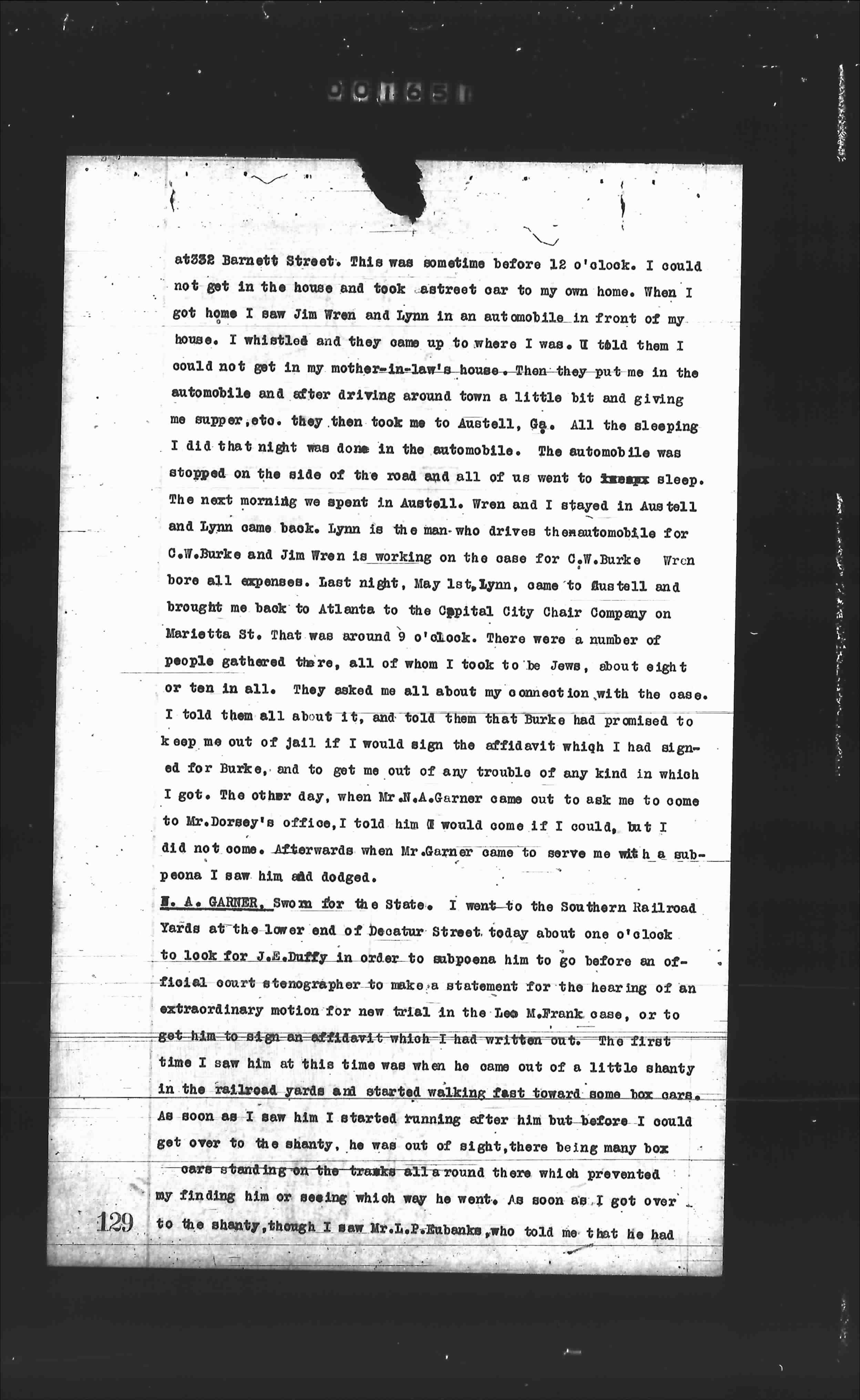 H. A. GARNER, Sworn for the State. I went to the Southern Railroad Yards at the Lower end of Decatur Street today about one o'clock to look for J.E.Duffy in order to subpoena him to go before an official court stenographer to make a statement for the hearing of an extraordinary motion for new trial in the Leo M.Frank case, or to get him to sign an affidavit which I had written out. The first time I saw him at this time was when he came out of a little shanty in the railroad yards and started walking fast toward some box cars. As soon as I saw him I started running after him but before I could get over to the shanty, he was out of sight, there being many box cars standing on the tracks all around there which prevented my finding him or seeing which way he went. As soon as I got over to the shanty, though I saw Mr. J.H.Eubanks who told me that he had