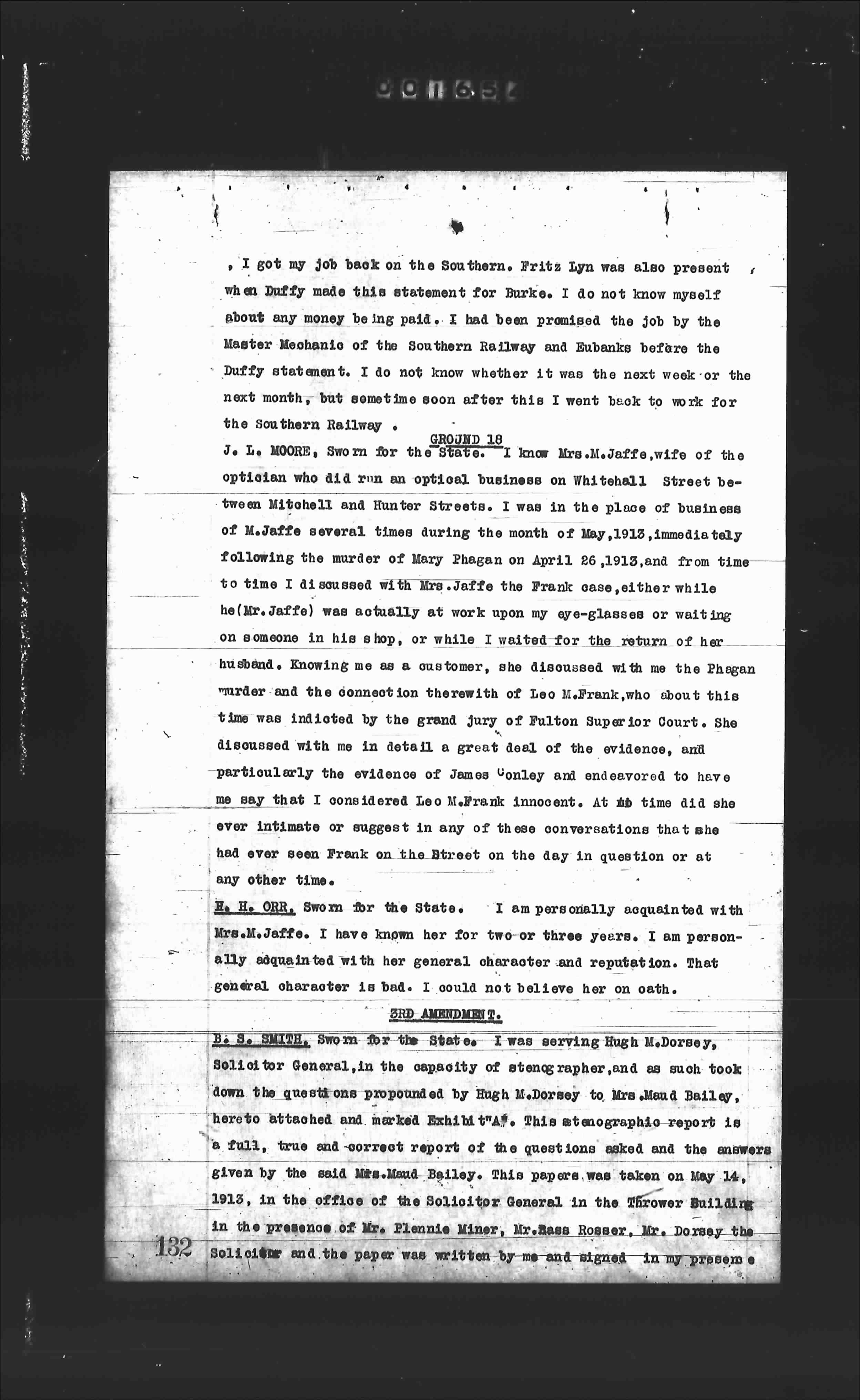 J. D. MOORE, Sworn for the State. I know Mrs. M. Jaffe, wife of the optician who did run an optical business on Whitehall Street between Mitchell and Hunter Streets. I was in the place of business of M. Jaffe several times during the month of May, 1913, immediately following the murder of Mary Phagan on April 26, 1913, and from time to time I discussed with Mrs. Jaffe the Frank case, either while he (Mr. Jaffe) was actually at work upon my eye-glasses or waiting on someone in his shop, or while I waited for the return of her husband. Knowing me as a customer, she discussed with me the Phagan murder and the connection therewith of Leo M. Frank, who about this time was indicted by the grand jury of Fulton Superior Court. She discussed with me in detail a great deal of the evidence, and particularly the evidence of James Conley and endeavored to have me say that I considered Leo M. Frank innocent. At no time did she ever intimate or suggest in any of our conversations that she had ever seen Frank on the street that day in question or at any other time.