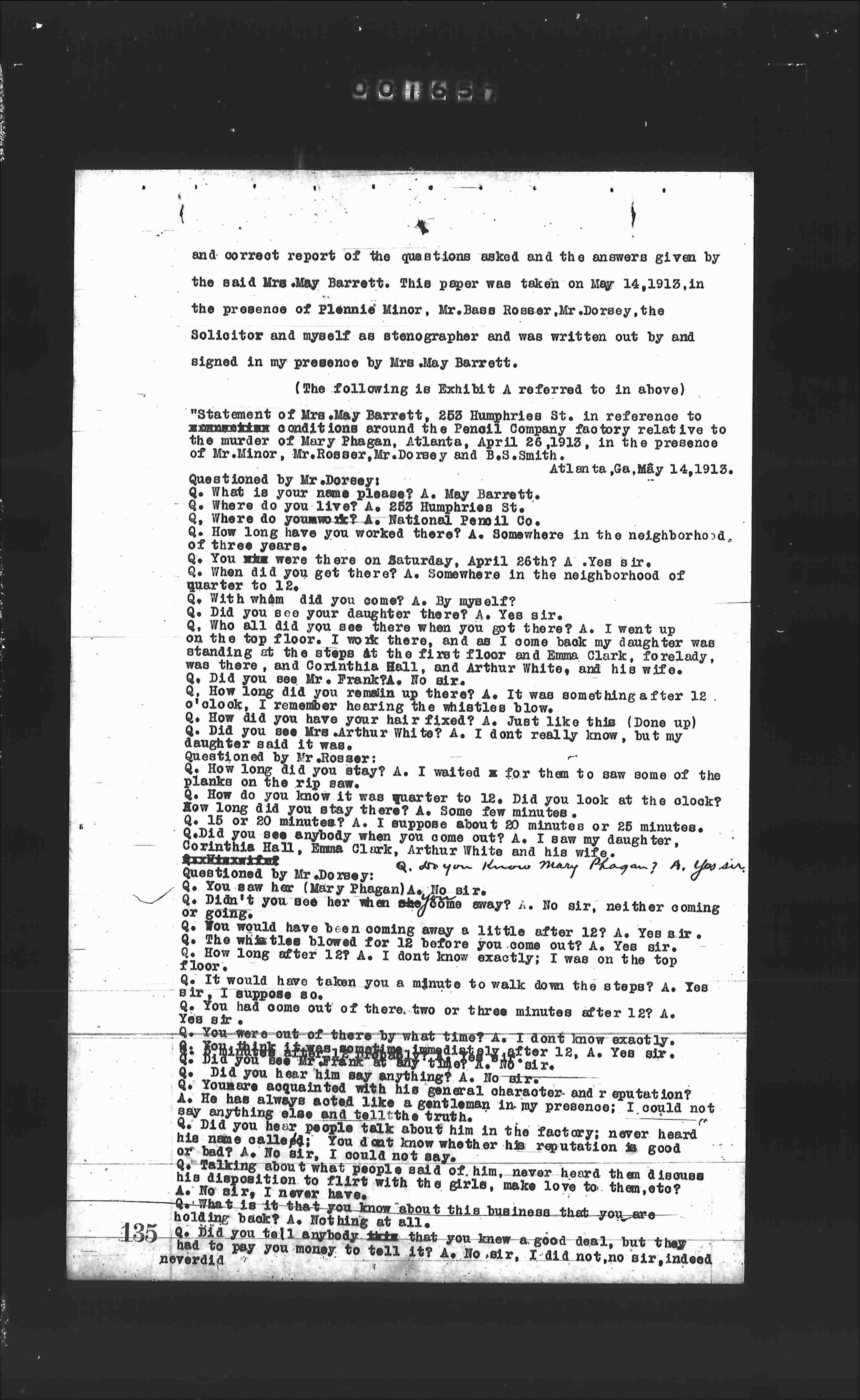 "Statement of Mrs.May Barrett, 225 Humphries St., in reference to the murder of Mary Phagan, Atlanta, April 26, 1913, in the presence of Mr.Minor, Mr.Rosser, Mr.Dorsey and B.S.Smith, was taken May 14,1913. Questioned by Mr.Dorsey: Atlanta, Ga., May 14,1913.