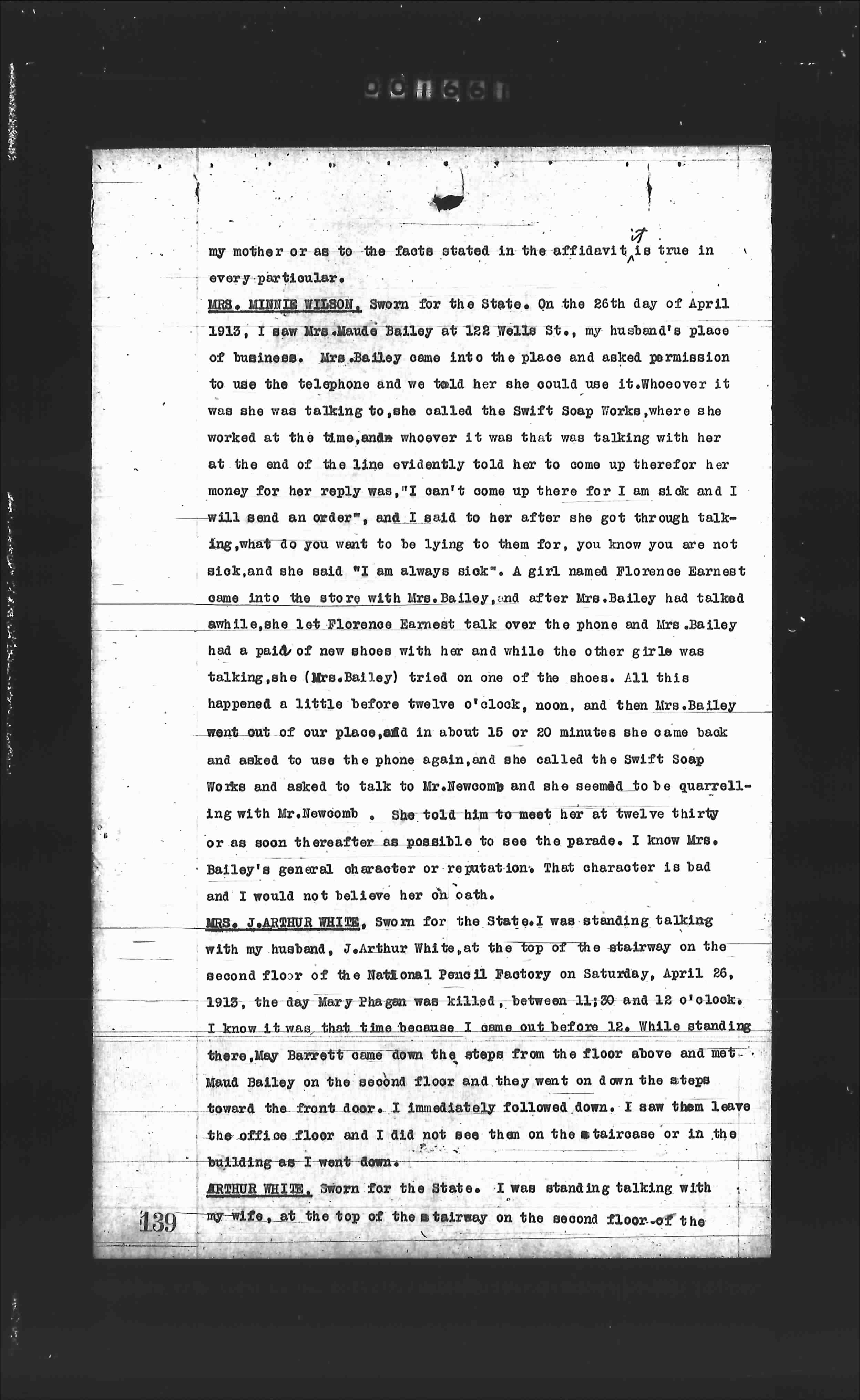 MRS. J. ARTHUR WHITE, Sworn for the State. I was standing talking with my husband, J. Arthur White, at the top of the stairway on the second floor of the National Pencil Factory on Saturday, April 26, 1913, the day Mary Phagan was killed, between 11:30 and 12 o'clock, I know it was that time because I came out before 12. While standing there, May Barrett came down the steps from the floor above and met Maud Bailey on the second floor and they went on down the steps toward the front door. I immediately followed down. I saw them leave the office as I went down.