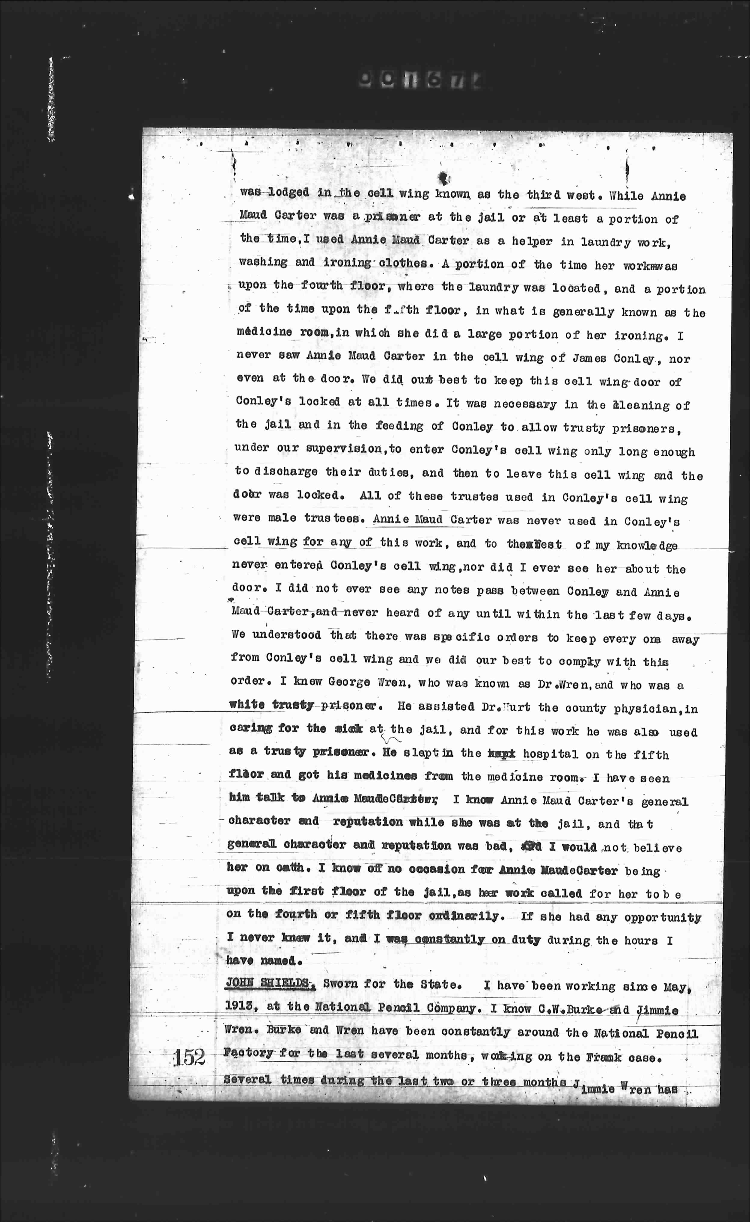 was lodged in the cell wing known as the third west. While Annie Maud Carter was a pickman at the jail or at least a portion of the time, I used Annie Maud Carter as a helper in laundry work, washing and ironing clothes. A portion of the time her work was upon the fourth floor, where the laundry was located, and a portion of the time upon the fifth floor, in what is generally known as the medicine room, in which she did the large portion of her ironing. I never saw Annie Maud Carter in the cell wing of James Conley, nor even at the door. We did our best to keep this cell wing of Conley's locked at all times. It was necessary in the cleaning of the jail and in the feeding of Conley to allow trusty prisoners, under our supervision, to enter Conley's cell wing only long enough to discharge their duties, and then to leave this cell wing and the door was locked. All of these trusties used in Conley's cell wing were male trusties. Annie Maud Carter was never used in Conley's cell wing for any of this work, and to the best of my knowledge never entered Conley's cell wing, nor did I ever see her about the door. I did not over see any notes pass between Conley and Annie Maud Carter, and never heard of any until within the last few days. We understood that there was specific orders to keep every one away from Conley's cell wing and we did our best to comply with this order. I knew George Wren, who was known as Dr.Wren, and who was a white trusty prisoner. He assisted Dr.Hurt, the county physician, in caring for the sick at the jail, and for this work he was also used as a trusty prisoner. He slept in the negro hospital on the fifth floor and got his medicine from the medicine room. I have seen him talk to Annie Maud Carter. I know Annie Maud Carter's general character and reputation while she was at the jail, and that general character and reputation was bad, and I would not believe her on oath. I know of no occasion for Annie Maud Carter being upon the first floor of the jail, as her work called for her to be on the fourth or fifth floor ordinarily. If she had any opportunity I never knew it, and I was constantly on duty during the hours I have named.