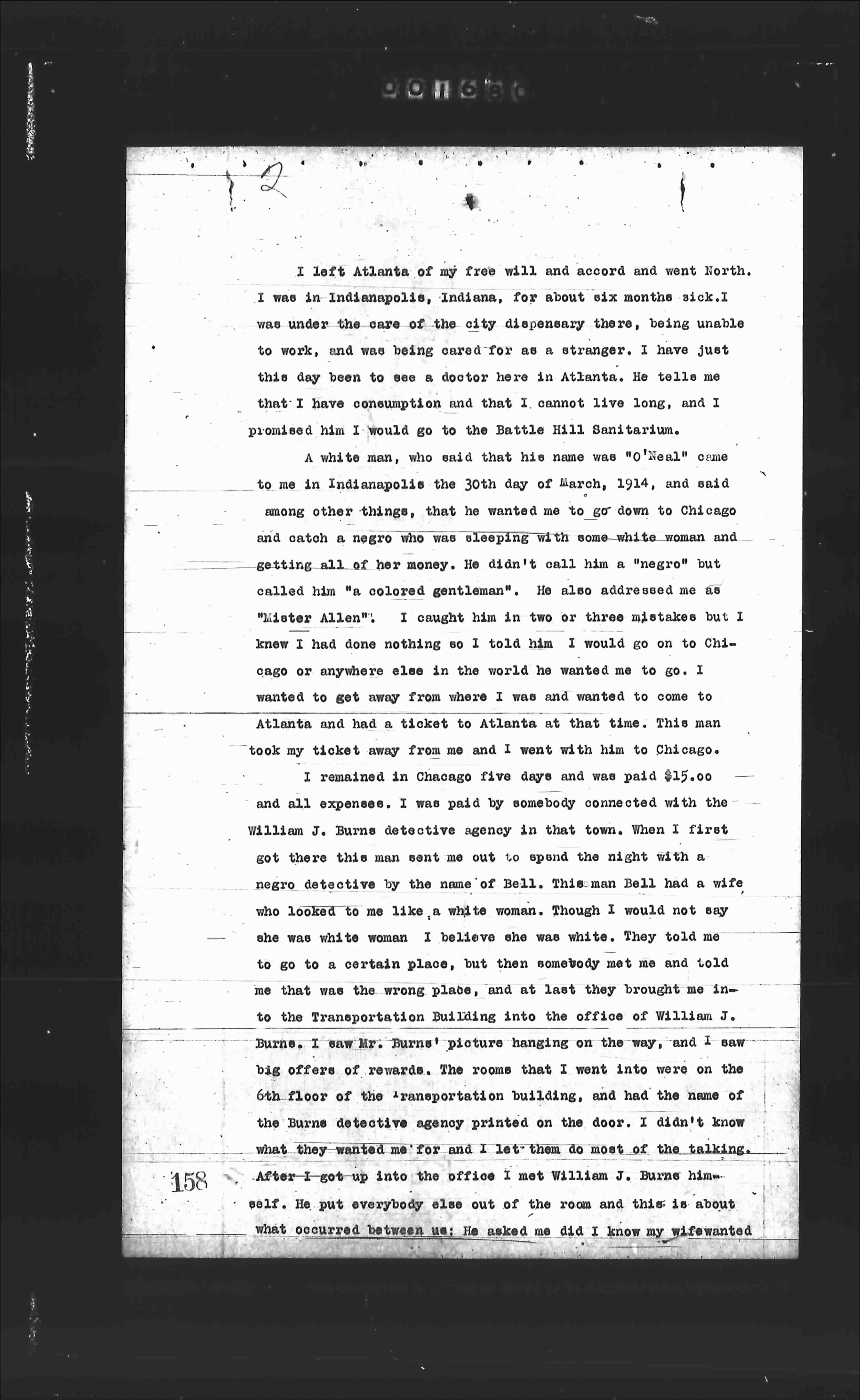 A white man, who said that his name was "O'Neal" came to me in Indianapolis the 30th day of March, 1914, and said among other things, that he wanted me to go down to Chicago and catch a negro who was sleeping with some white woman and getting all of her money. He didn't call him a "negro" but called him a "colored gentleman". He also addressed me as "Mister Allen". I caught him in two or three mistakes but I knew I had done nothing so I told him I would go on to Chicago or anywhere else in the world he wanted me to go. I wanted to get away from where I was and wanted to come to Atlanta and had a ticket to Atlanta at that time. This man took my ticket away from me and I went with him to Chicago.