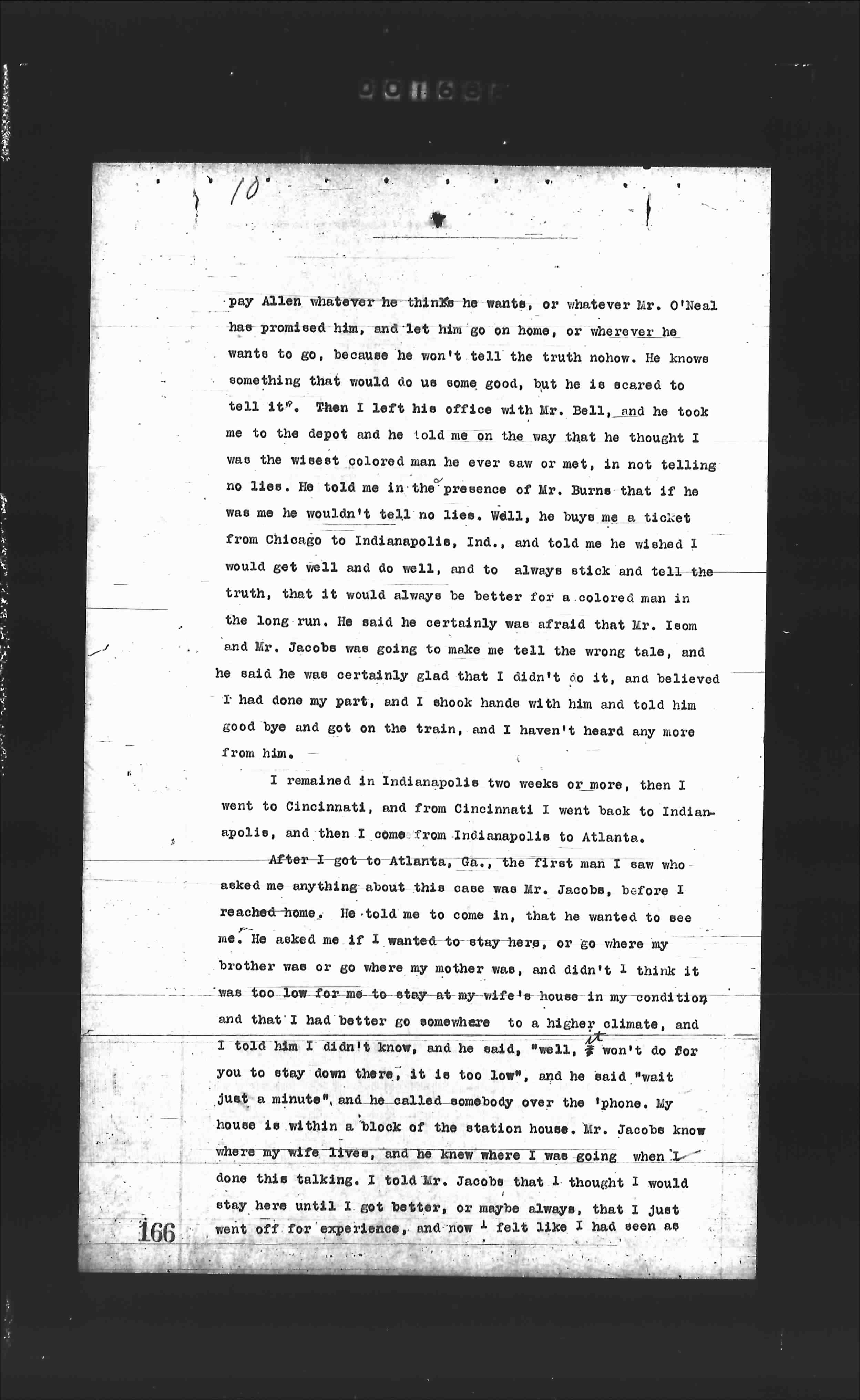 pay Allen whatever he thinks he wants, or whatever Mr. O'Neal has promised him, and let him go on home, or wherever he wants to go, because he won't tell the truth nowhow. He knows something that would do us some good, but he is scared to tell it". Then I left his office with Mr. Bell, and he took me to the depot and he told me on the way that he thought I was the wisest colored man he ever saw or met, in not telling no lies. He told me in the presence of Mr. Burns that if he was me he wouldn't tell no lies. Well, he buys me a ticket from Chicago to Indianapolis, Ind., and told me he wished I would get well and do well, and to always stick and tell the truth, that it would always be better for a colored man in the long run. He said he certainly was afraid that Mr. Leom and Mr. Jacobs was going to make me tell the wrong tale, and he said he was certainly glad that I didn't do it, and believed I had done my part, and I shook hands with him and told him good bye and got on the train, and I haven't heard any more from him.