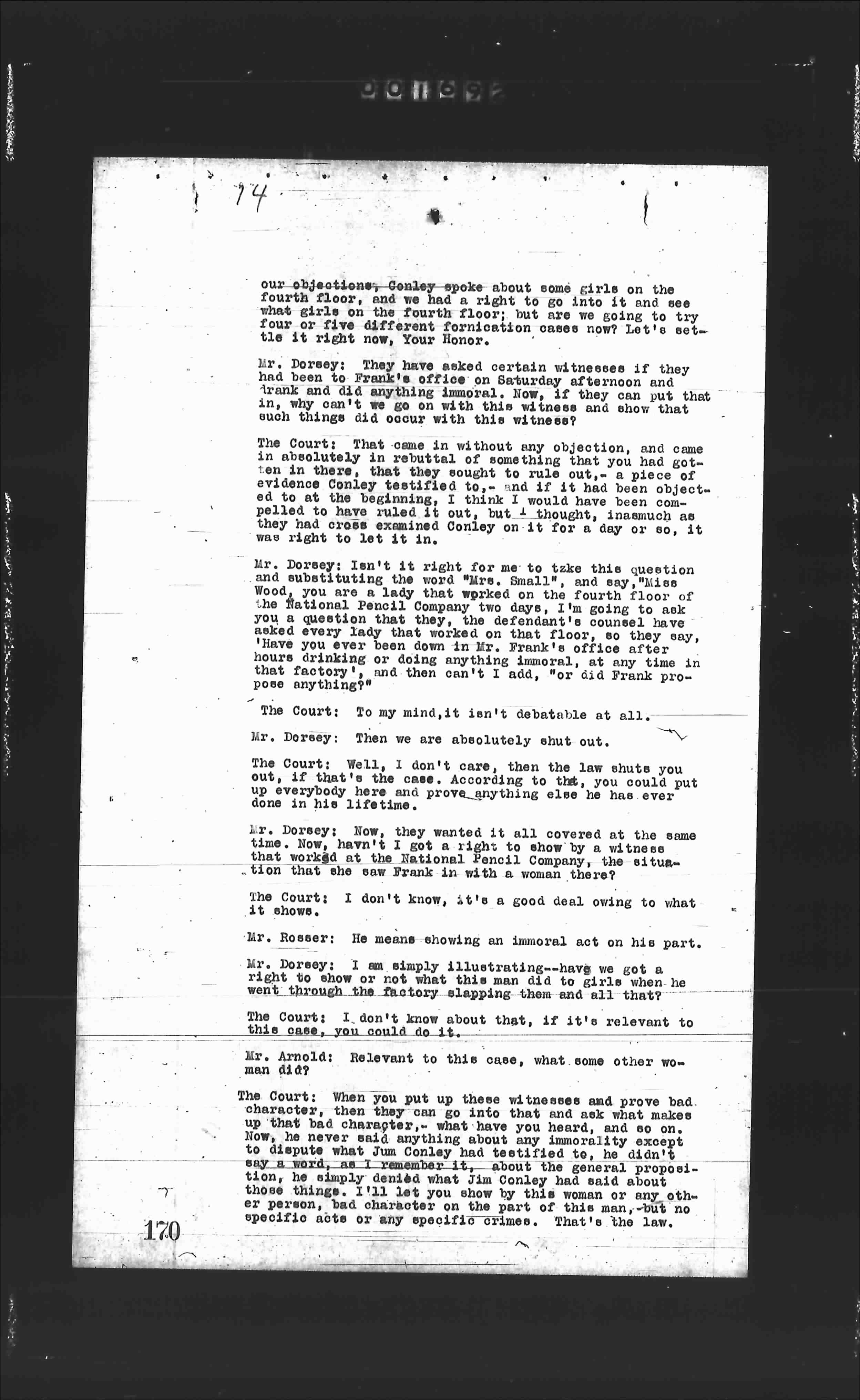 Mr. Dorsey: Isn't it right for me to take this question and substituting the word "Miss" Small" and say "Miss Wood, you are a lady that worked on the fourth floor of the National Pencil Company two days. I'm going to ask you a question that they, the defendant's counsel have asked every lady that worked on that floor, so they say, 'Have you ever been down in Mr. Frank's office after hours drinking or doing anything immoral, or at any time in that factory?', and then can't I add, 'or did Frank propose anything?'"