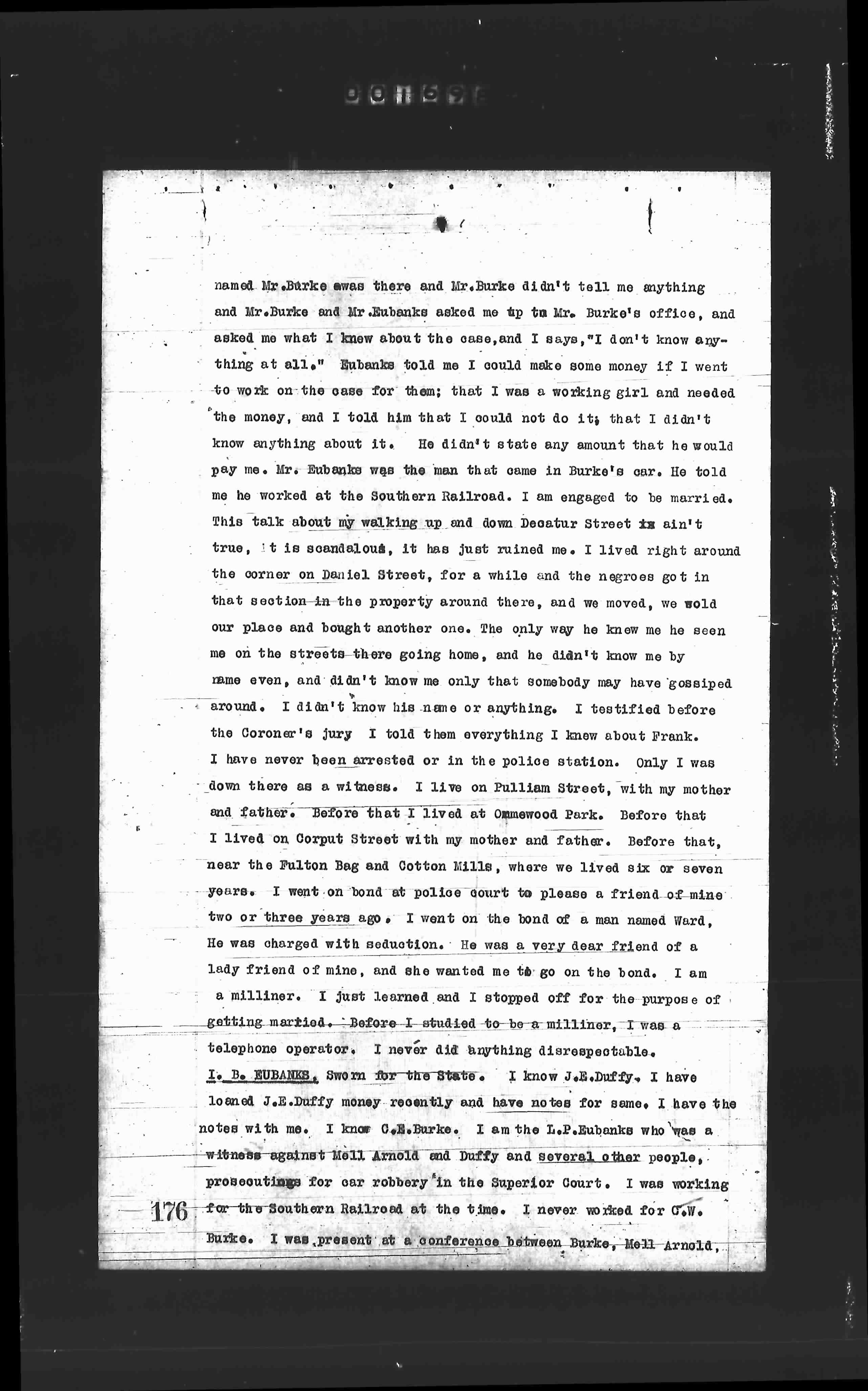 named Mr. Burke was there and Mr. Burke didn't tell me anything and Mr. Burke and Mr. Eubanks asked me up to Mr. Burke's office, and asked me what I knew about the case, and I says, "I don't know anything at all." Eubanks told me I could make some money if I went to work on the case for them; that I was a working girl and needed the money, and I told him that I could not do it; that I didn't know anything about it. He didn't state any amount that he would pay me. Mr. Eubanks was the man that came in Burke's car. He told me he worked at the Southern Railroad. I am engaged to be married. This talk about my walking up and down Decatur Street ain't true, it is scandalous, it has just ruined me. I lived right around the corner on Daniel Street, for a while and the negroes got in that section in the property around there, and we moved, we sold our place and bought another one. The only way he knew me he seen me on the streets there going home, and he didn't know me by name even, and didn't know me only that somebody may have gossiped around. I didn't know his name or anything. I testified before the Coroner's jury. I told them everything I knew about Frank. I have never been arrested or in the police station. Only I was down there as a witness. I lived on Pulliam Street, with my mother and father. Before that I lived at Inman Park. Before that I lived on Gopart Street with my mother and father. Before that, near the Fulton Bag and Cotton Mills, where we lived six or seven years. I went on bond at police court to please a friend of mine two or three years ago. I went on the bond of a man named Ward. He was charged with seduction. He was a very dear friend of a lady friend of mine, and she wanted me to go on the bond. I am a milliner. I just learned so I stopped off for the purpose of getting married. Before I studied to be a milliner, I was a telephone operator. I never did anything disreputable.