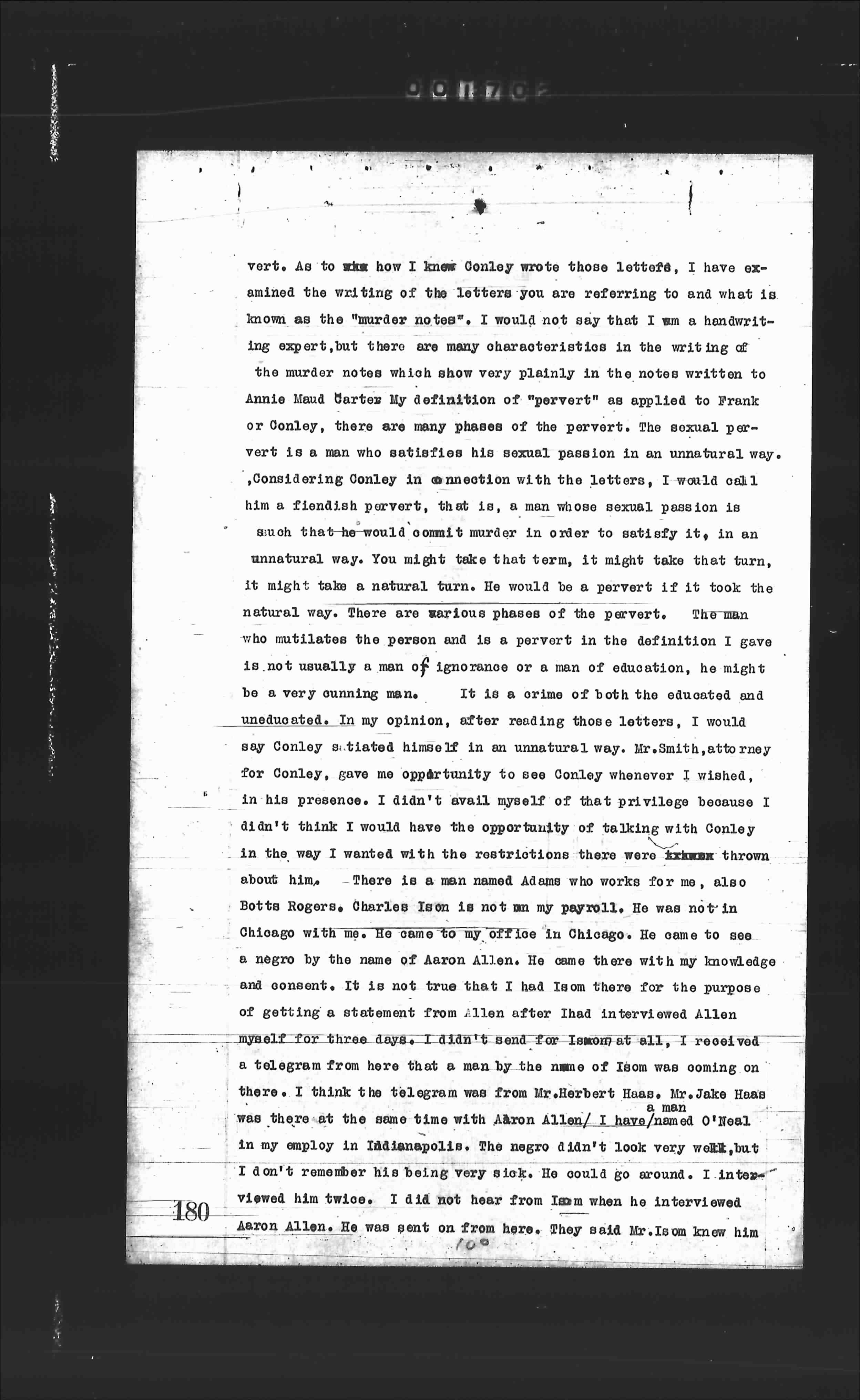 vert. As to how I know Conley wrote those letters, I have examined the writing of the letters you are referring to and what is known as the "murder notes". I would not say that I am a handwriting expert, but there are many characteristics in the writing of the murder notes which show very plainly in the notes written to Annie Maud Carter. My definition of "pervert" as applied to Frank or Conley, there are many phases of the pervert. The sexual pervert is a man who satisfies his sexual passion in an unnatural way. Considering Conley in connection with the letters, I would call him a fiendish pervert, that is, a man whose sexual passion is such that he would commit murder in order to satisfy it, in an unnatural way. You might take that term, it might take that turn, it might take a natural turn. He would be a pervert if it took the natural way. There are various phases of the pervert. The man who mutilates the person and is a pervert in the definition I gave is not usually a man of ignorance or a man of education, he might be a very cunning man. It is a crime of both the educated and uneducated. In my opinion, after reading those letters, I would say Conley s.tiated himself in an unnatural way. Mr.Smith, attorney for Conley, gave me opportunity to see Conley whenever I wished, in his presence. I didn't avail myself of that privilege because I didn't think I would have the opportunity of talking with Conley in the way I wanted with the restrictions there were thrown about him. There is a man named Adams who works for me, also Botts Rogers. Charles Isom is not my payroll. He was not in Chicago with me. He came to my office in Chicago. He came to see a negro by the name of Aaron Allen. He came there with my knowledge and consent. It is not true that I had Isom there for the purpose of getting a statement from Allen after I had interviewed Allen myself for three days. I didn't send for Isom at all, I received a telegram from here that a man by the name of Isom was coming on there. I think the telegram was from Mr. Herbert Haas. Mr. Jake Haas was there at the same time with Aaron Allen. I have had one Neal in my employ in Indianapolis. The negro didn't look very well, but I don't remember his being very sick. He could go around. I interviewed him twice. I did not hear from Isom when he interviewed Aaron Allen. He was sent on from here. They said Mr. Isom knew him