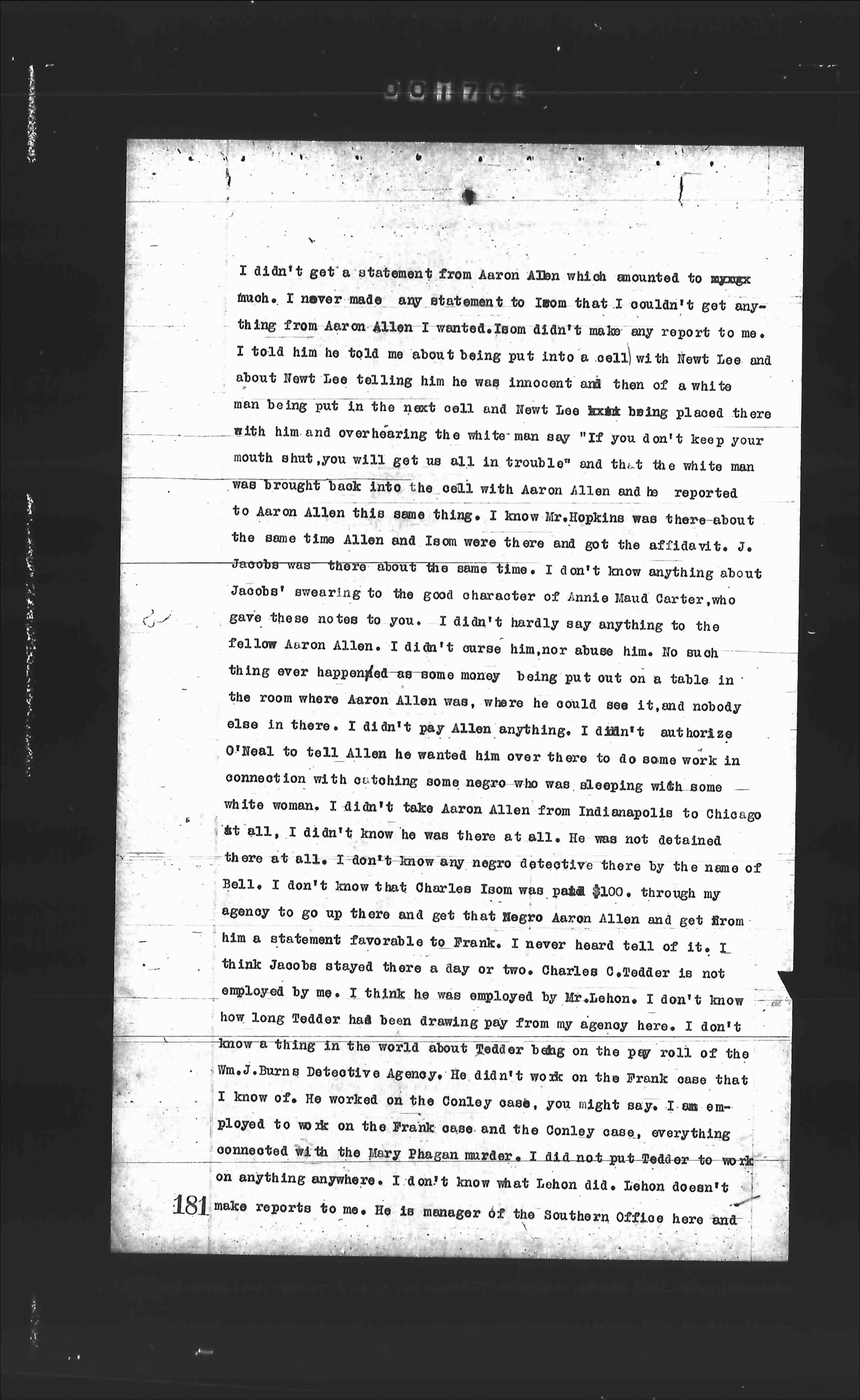 I didn't get a statement from Aaron Allen which amounted to much. I never made any statement to Isom that I couldn't get anything from Aaron Allen I wanted. Isom didn't make any report to me. I told him he told me about being put into a cell with Newt Lee and about Newt Lee telling him he was innocent and then of a white man being put in the next cell and Newt Lee &xxxx being placed there with him and overhearing the white man say "If you don't keep your mouth shut, you will get us all in trouble" and that the white man was brought back into the cell with Aaron Allen and she reported to Aaron Allen this same thing. I know Mr. Hopkins was there about the same time Allen and Isom were there and got the affidavit. J. Jacobs was there about the same time. I don't know anything about Jacobs' swearing to the good character of Annie Maud Carter, who gave these notes to you. I didn't hardly say anything to the fellow Aaron Allen. I didn't curse him, nor abuse him. No such thing ever happened as some money being put out on a table in the room where Aaron Allen was, where he could see it, and nobody else in there. I didn't pay Allen anything. I didn't authorize O'Neal to tell Allen he wanted him over there to do some work in connection with catching some negro who was sleeping with some white woman. I didn't take Aaron Allen from Indianapolis to Chicago at all. I didn't know he was there at all. He was not detained there at all. I don't know any negro detective there by the name of Bell. I don't know that Charles Isom was paid $100. through my agency to go up there and get that negro Aaron Allen and get from him a statement favorable to Frank. I never heard tell of it. I think Jacobs stayed there a day or two. Charles C. Tedder is not employed by me. I think he was employed by Mr. Lehon. I don't know how long Tedder had been drawing pay from my agency here. I don't know a thing in the world about Tedder being on the pay roll of the Wm. J. Burns Detective Agency. He didn't work on the Frank case that I know of. He worked on the Conley case, you might say. I am employed to work on the Frank case and the Conley case, everything connected with the Mary Phagan murder. I did not put Tedder to work on anything anywhere. I don't know what Lehon did. Lehon doesn't make reports to me. He is manager of the Southern Office here and