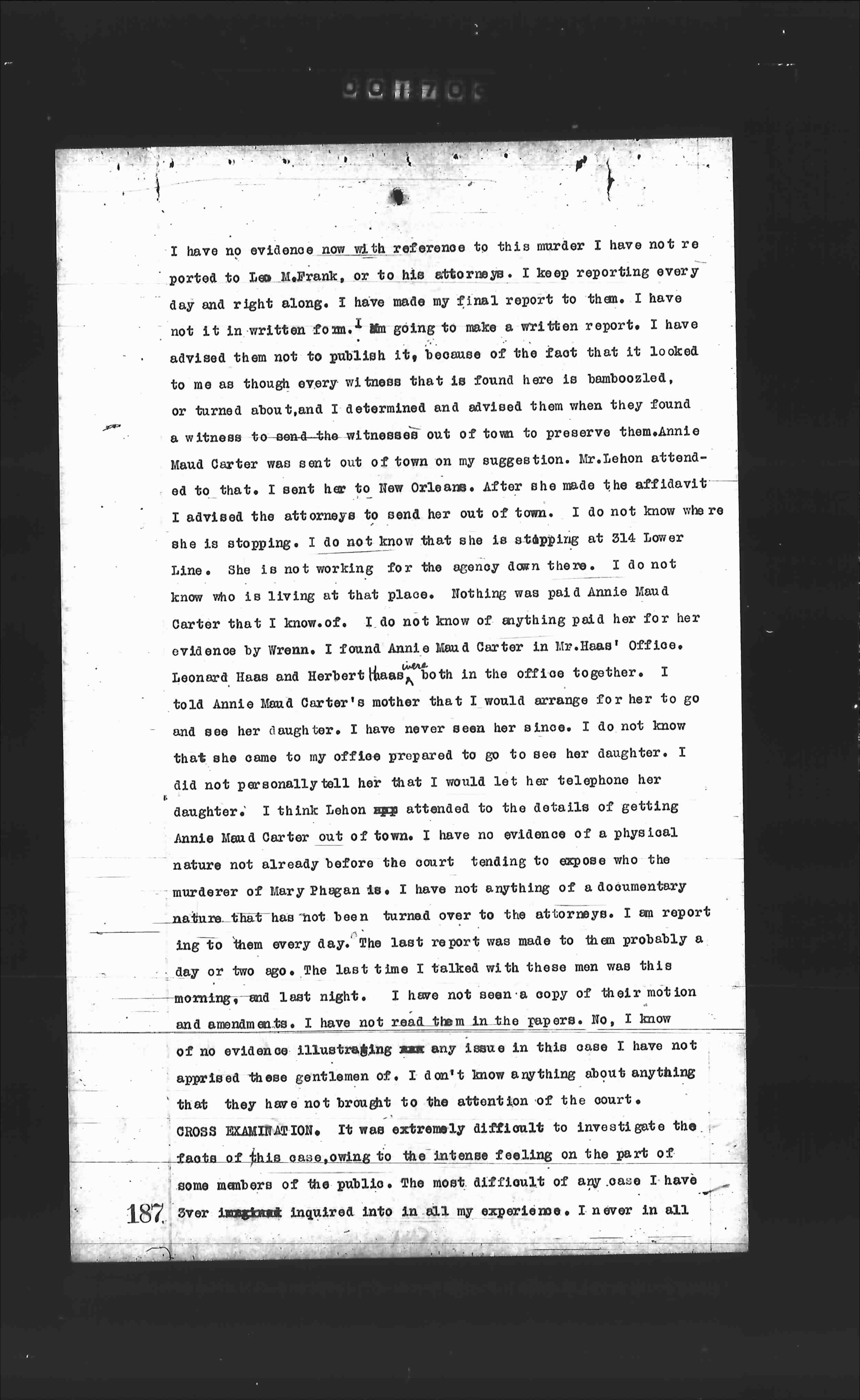 I have no evidence now with reference to this murder I have not reported to Leo M.Frank, or to his attorneys. I keep reporting every day and right along. I have made my final report to them. I have not it in written form. I'm going to make a written report. I have advised them not to publish it, because the fact that it looked to me as though every witness that is found here is bamboozled, or turned about, and I determined and advised them when found a witness to-send-the witness out of town to preserve them. Annie Maud Carter was sent out of town on my suggestion. Mr. Lehon attended to that. I sent her to New Orleans. After she made the affidavit I advised the attorneys to send her out of town. I do not know where she is stopping. I do not know that she is stopping at 314 Lower Line. She is not working for the agency down there. I do not know who is living at that place. Nothing was paid Annie Maud Carter that I know of. I do not know of anything paid her for her evidence by Wrenn. I found Annie Maud Carter in Mr. Haas' office. Leonard Haas and Herbert Haas, both in the office together. I told Annie Maud Carter's mother that I would arrange for her to go and see her daughter. I have never seen her since. I do not know that she came to my office prepared to go to see her daughter. I did not personally tell her that I would let her telephone her daughter. I think Lehon arranged to the details of getting Annie Maud Carter out of town. I have no evidence of a physical nature not already before the court tending to expose who the murderer of Mary Phagan is. I have not anything of a documentary nature that has not been turned over to the attorneys. I am reporting to them every day. The last report was made to them probably a day or two ago. The last time I talked with these men was this morning, and last night. I have not seen a copy of their motion and amendments. I have not read them the reports. No, I know of no evidence illustrating any issue in this case I have not apprised these gentlemen of. I don't know anything about anything that they have not brought to the attention of the court. CROSS EXAMINATION. It was extremely difficult to investigate the facts of this case, owing to the intense feeling on the part of some members of the public. The most difficult of any case I have ever inquired into in all my experience. I never in all